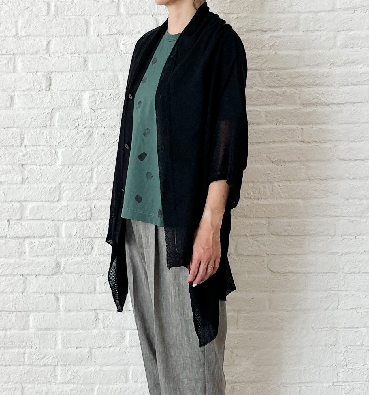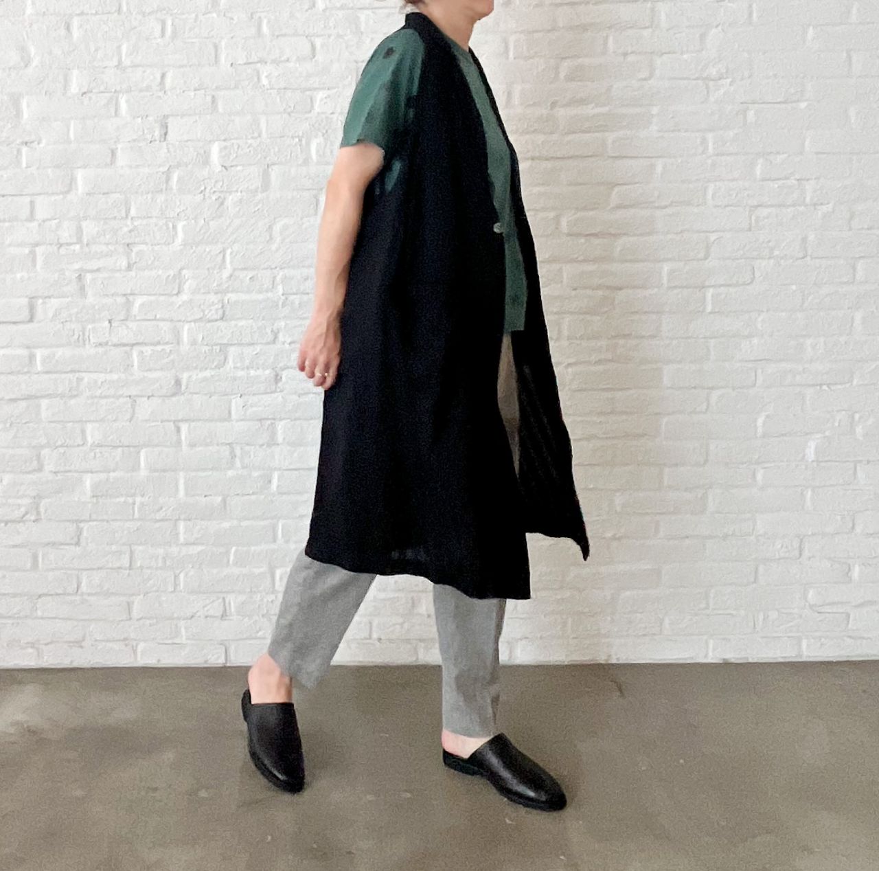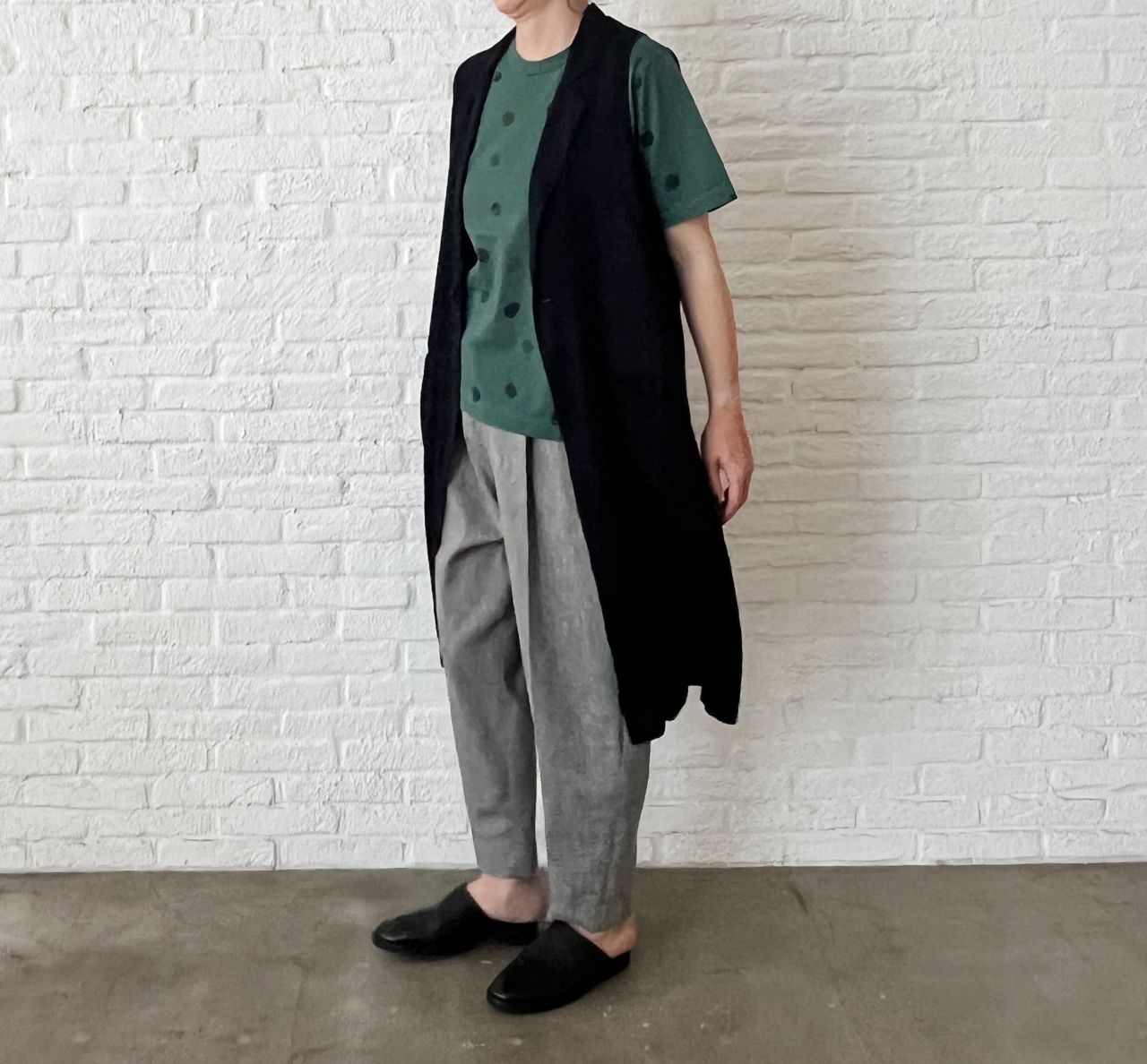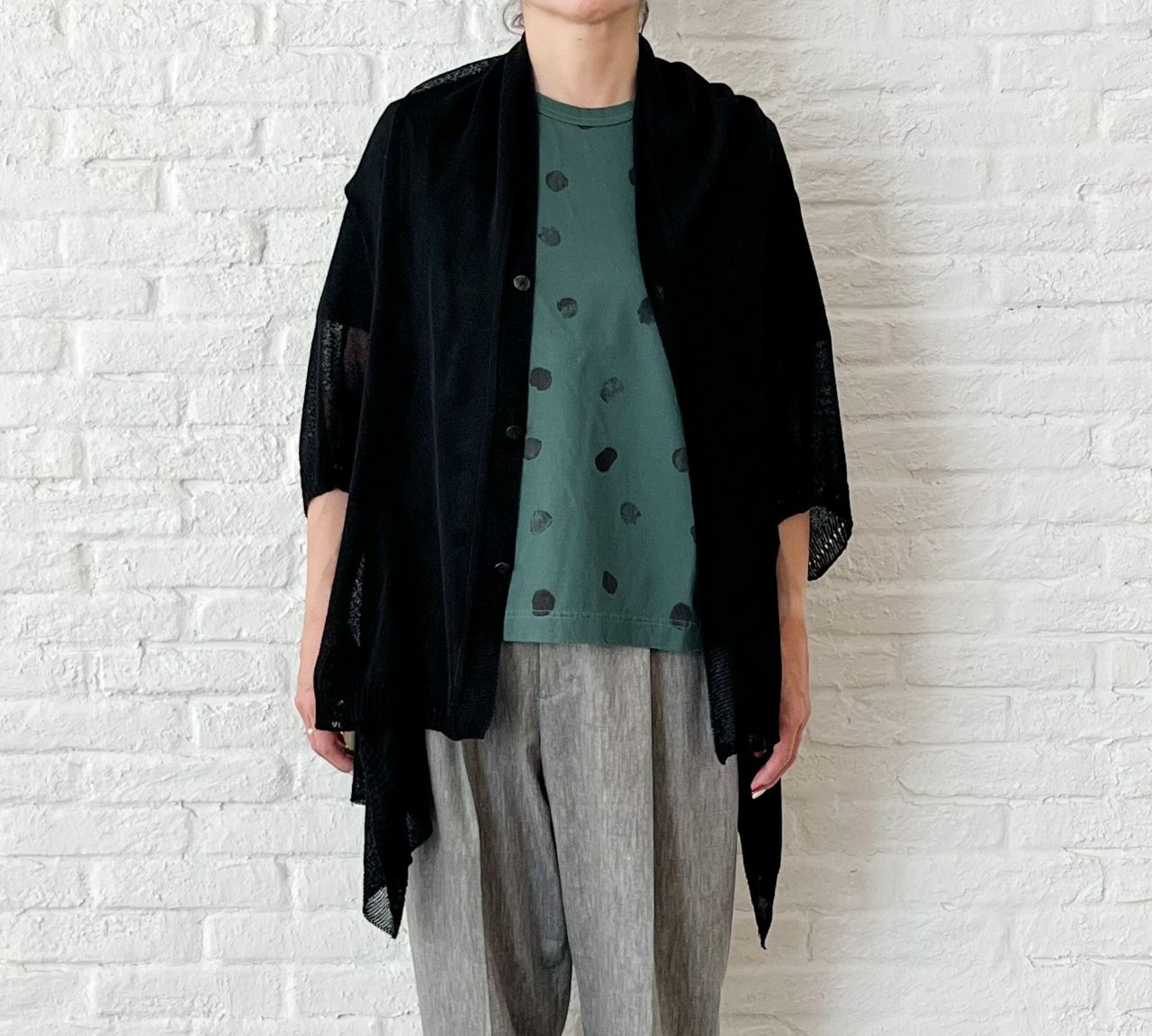 まだ入荷していない商品ですが、リネン混の透け感あるたっぷりカーディガンを羽織るとナチュラルな印象に。