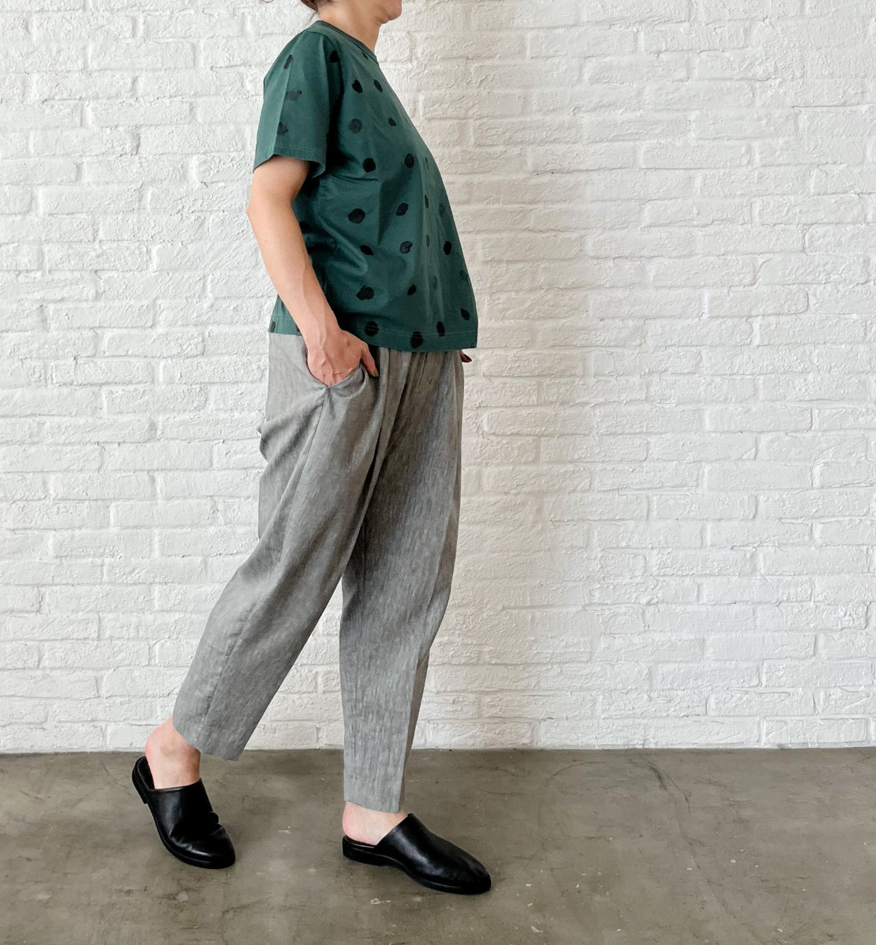 テーパードシルエットなので足回りがすっきりと見え、綺麗めな印象に。