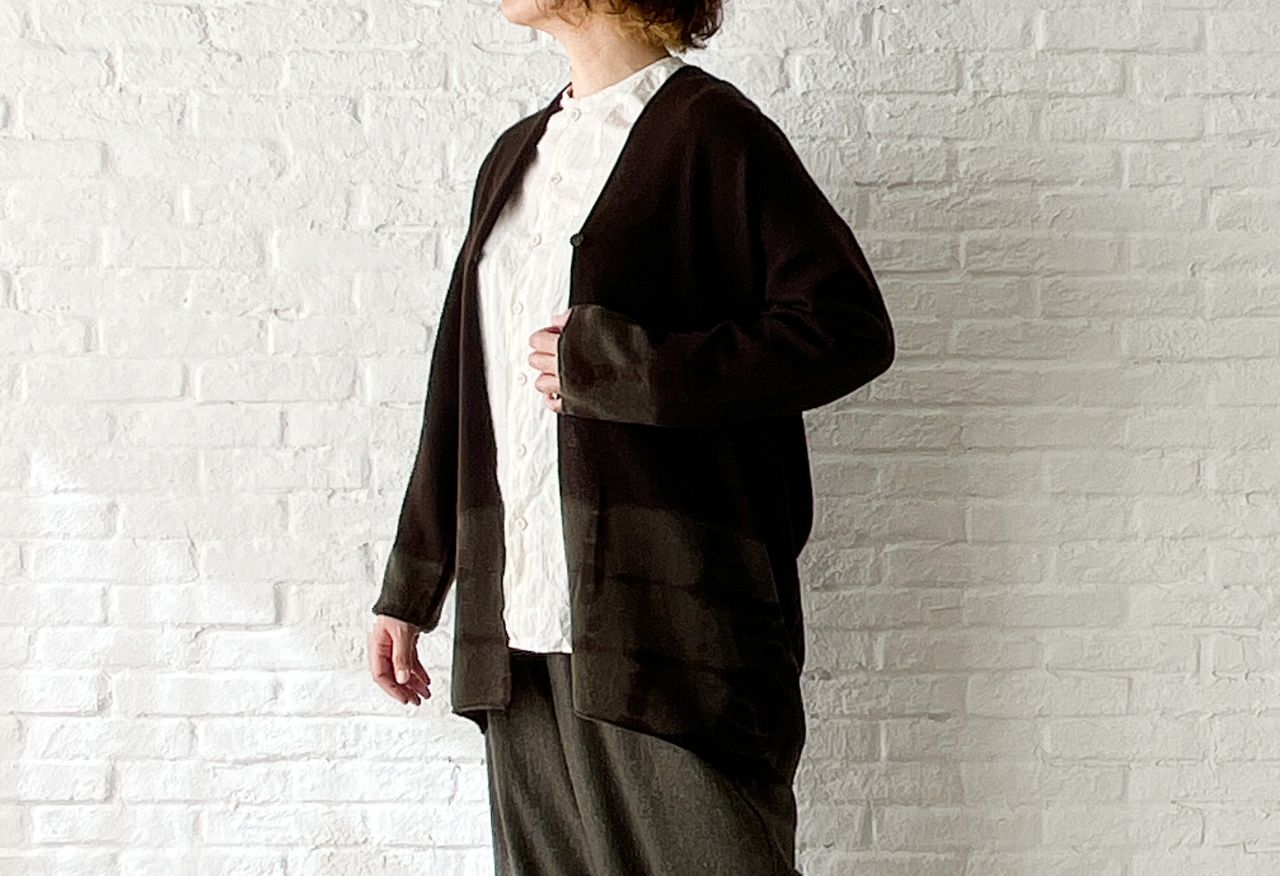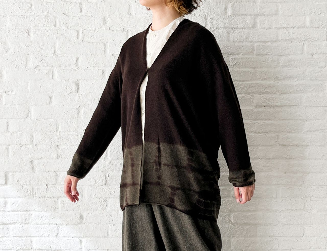 1つ釦のVネックカーディガンの裾に、絞り染めを集中的に入れたデザイン。