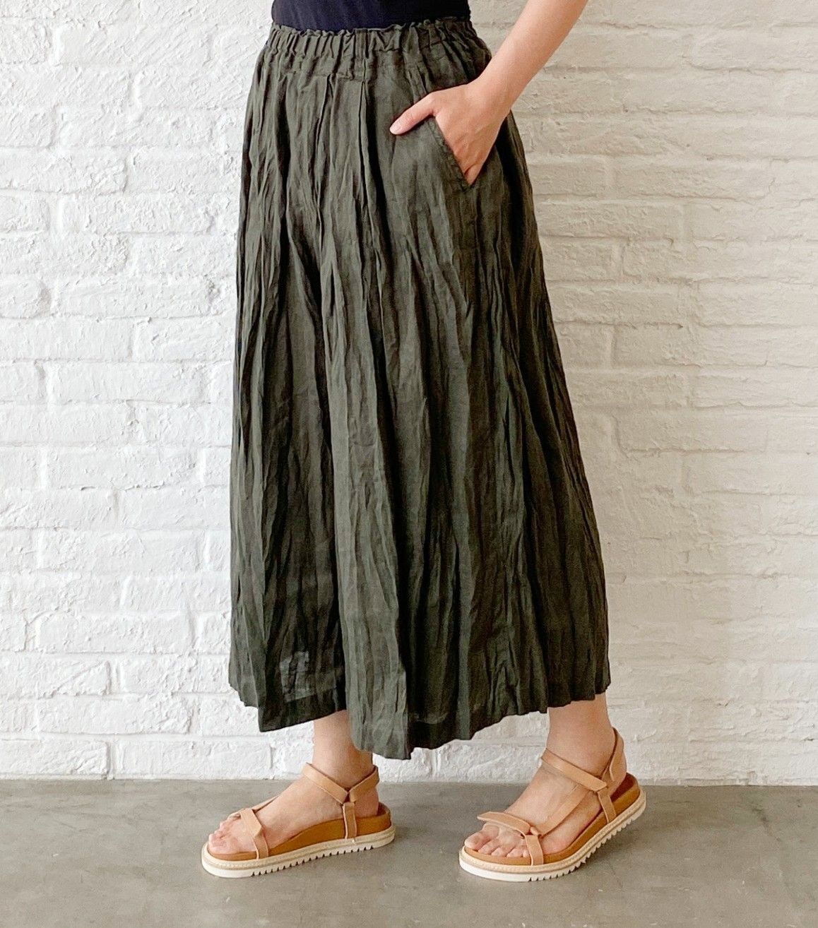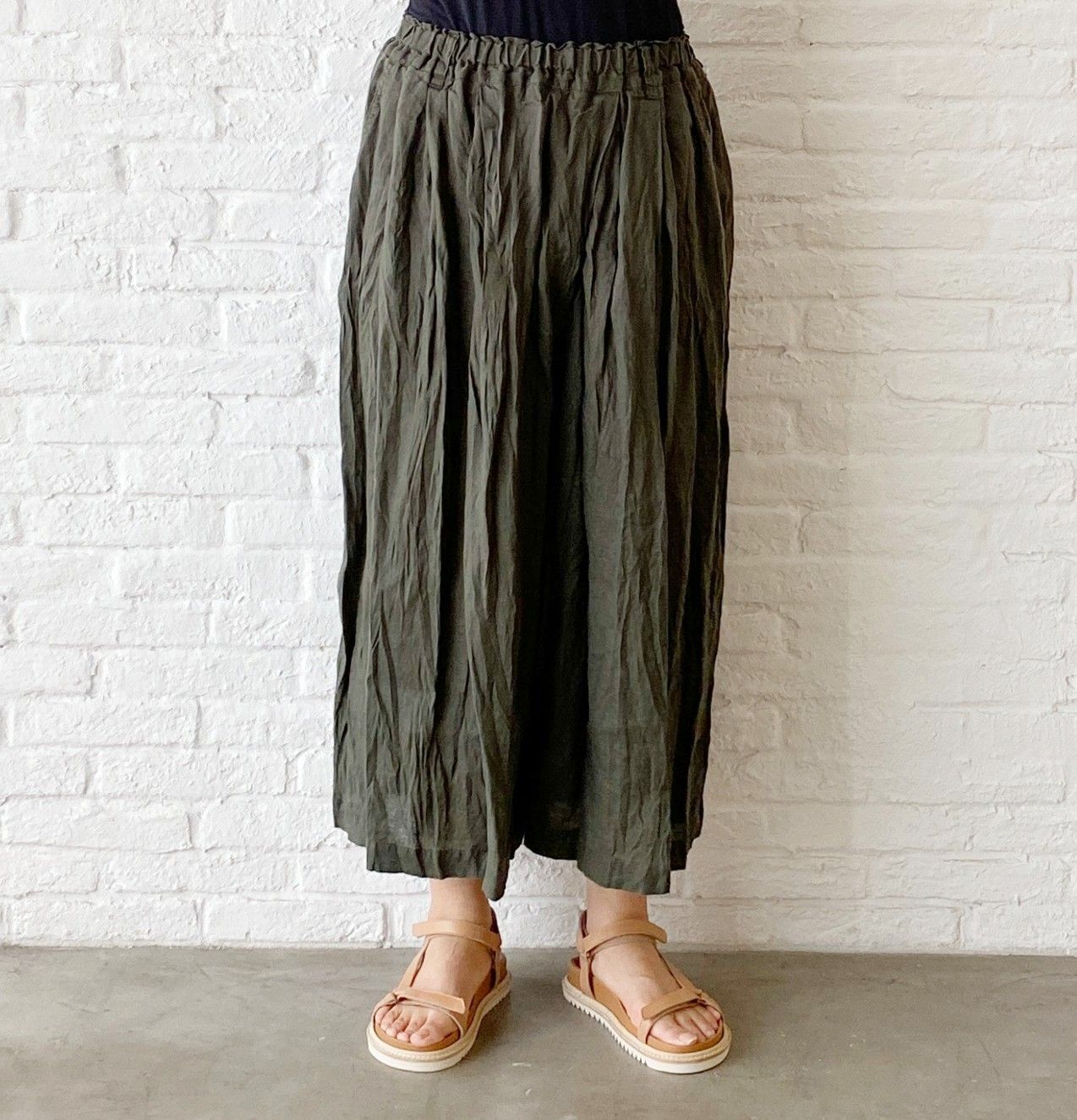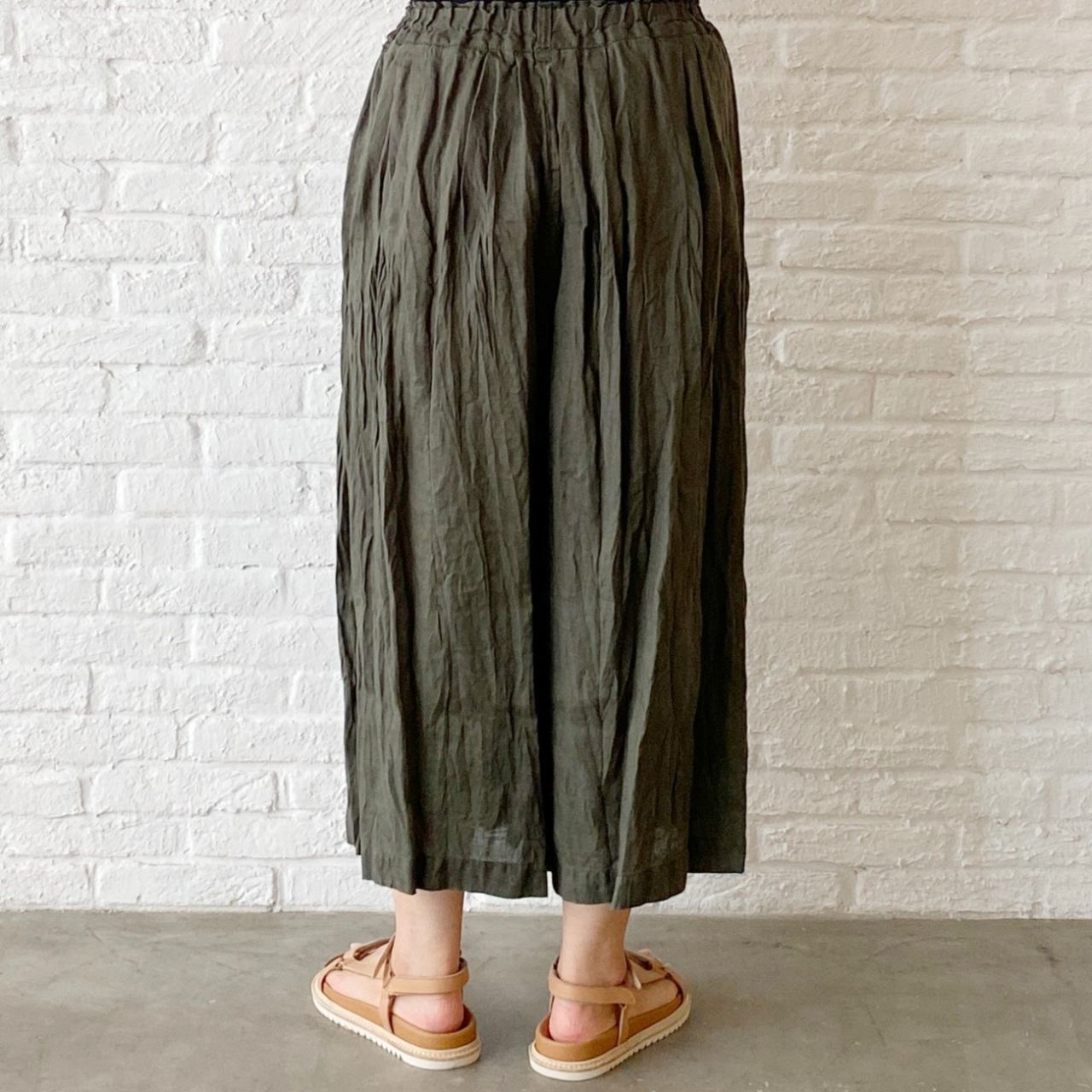 ウエストがゴムのガウチョパンツはフレンチリネンを使用した、夏にぴったりのパンツ。