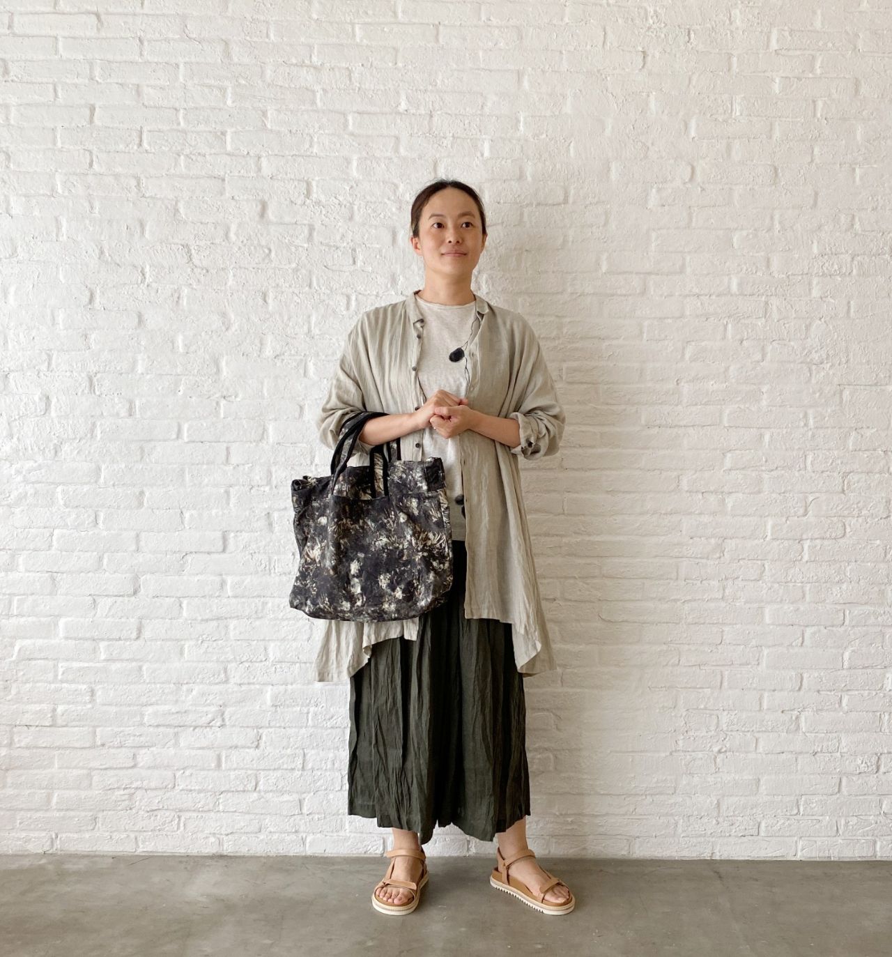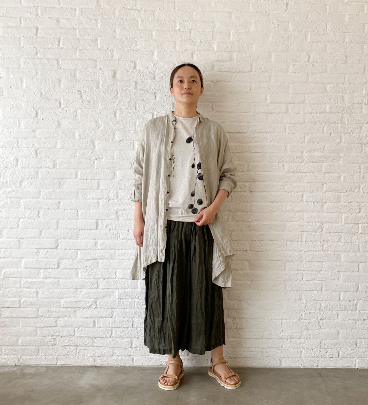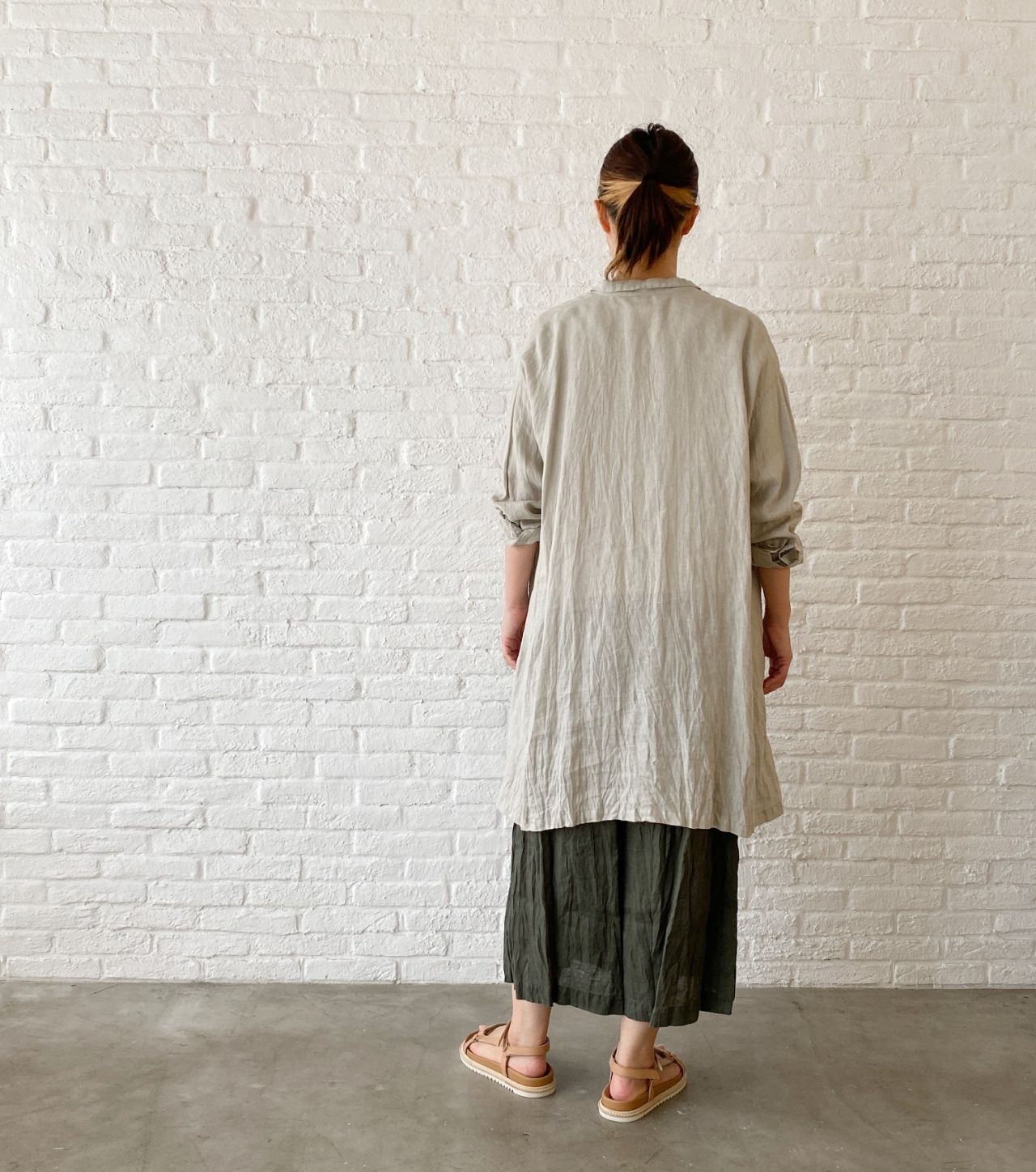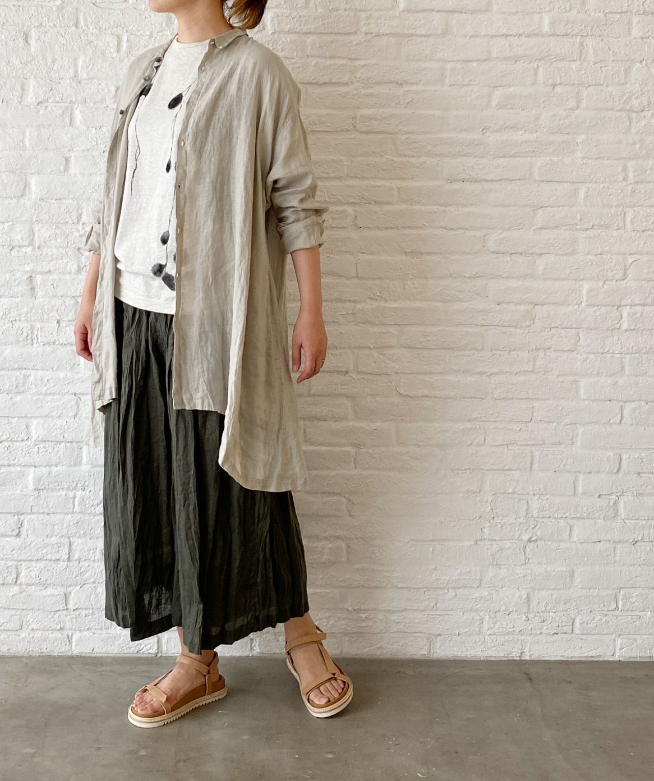 ウエストがゴムのガウチョパンツはフレンチリネンを使用した、夏にぴったりのパンツ。