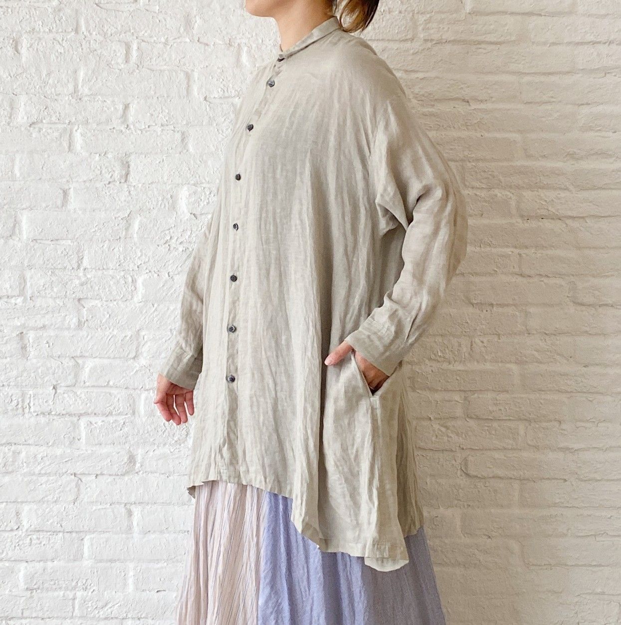 柔らかく上質なリネンで作った、Aラインに広がるシルエットがかわいいブラウス。