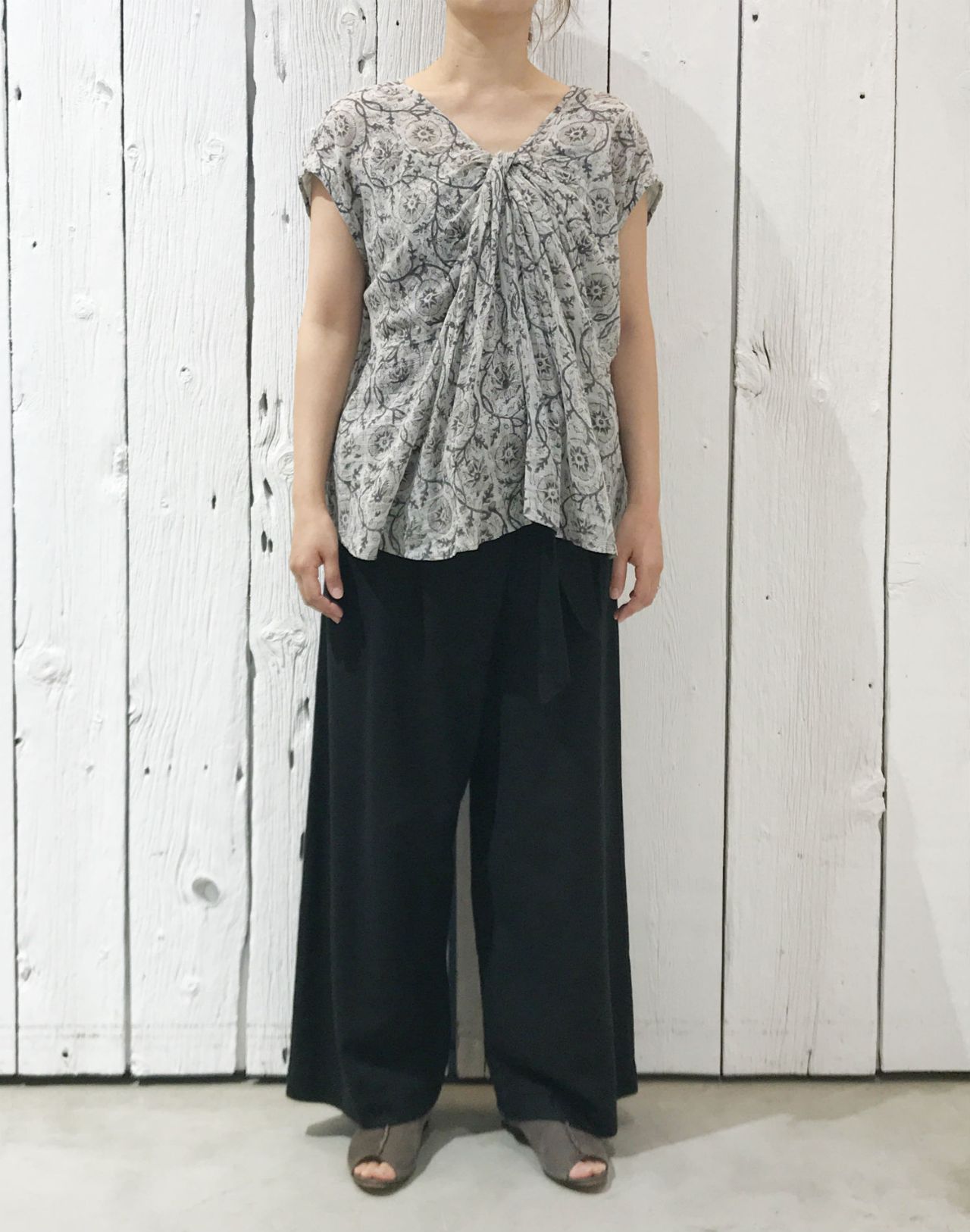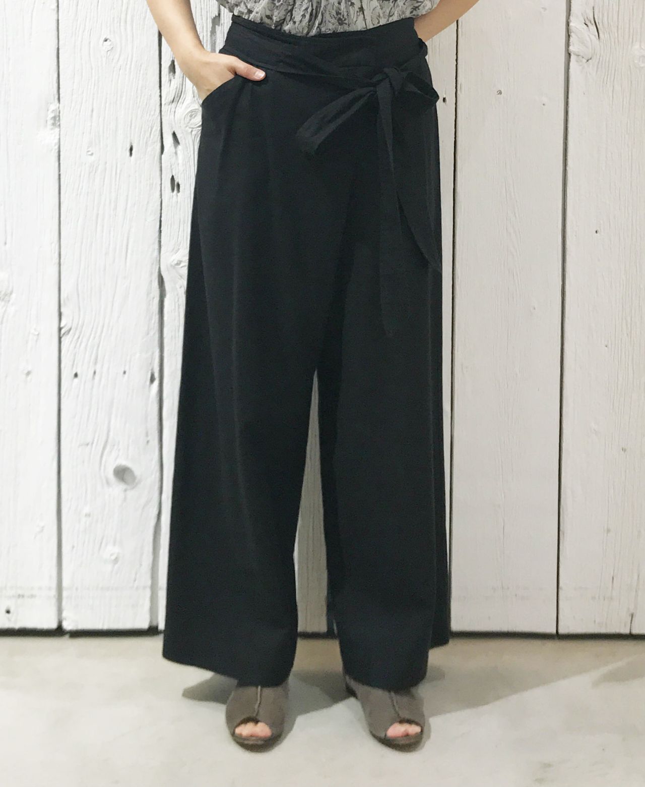 ウエストを重ねてボタンを付けて、リボンで結ぶワイドパンツです。