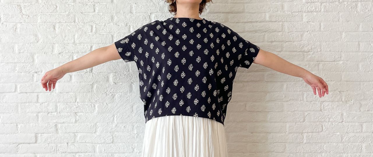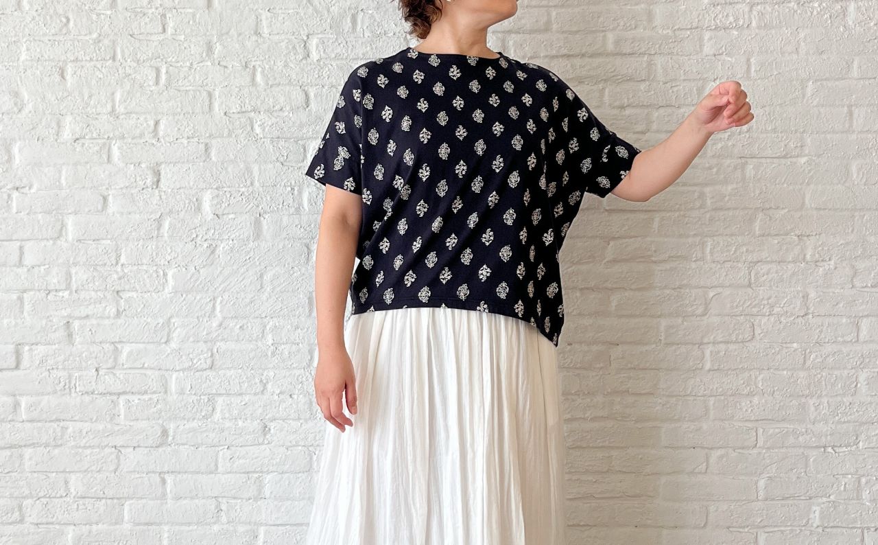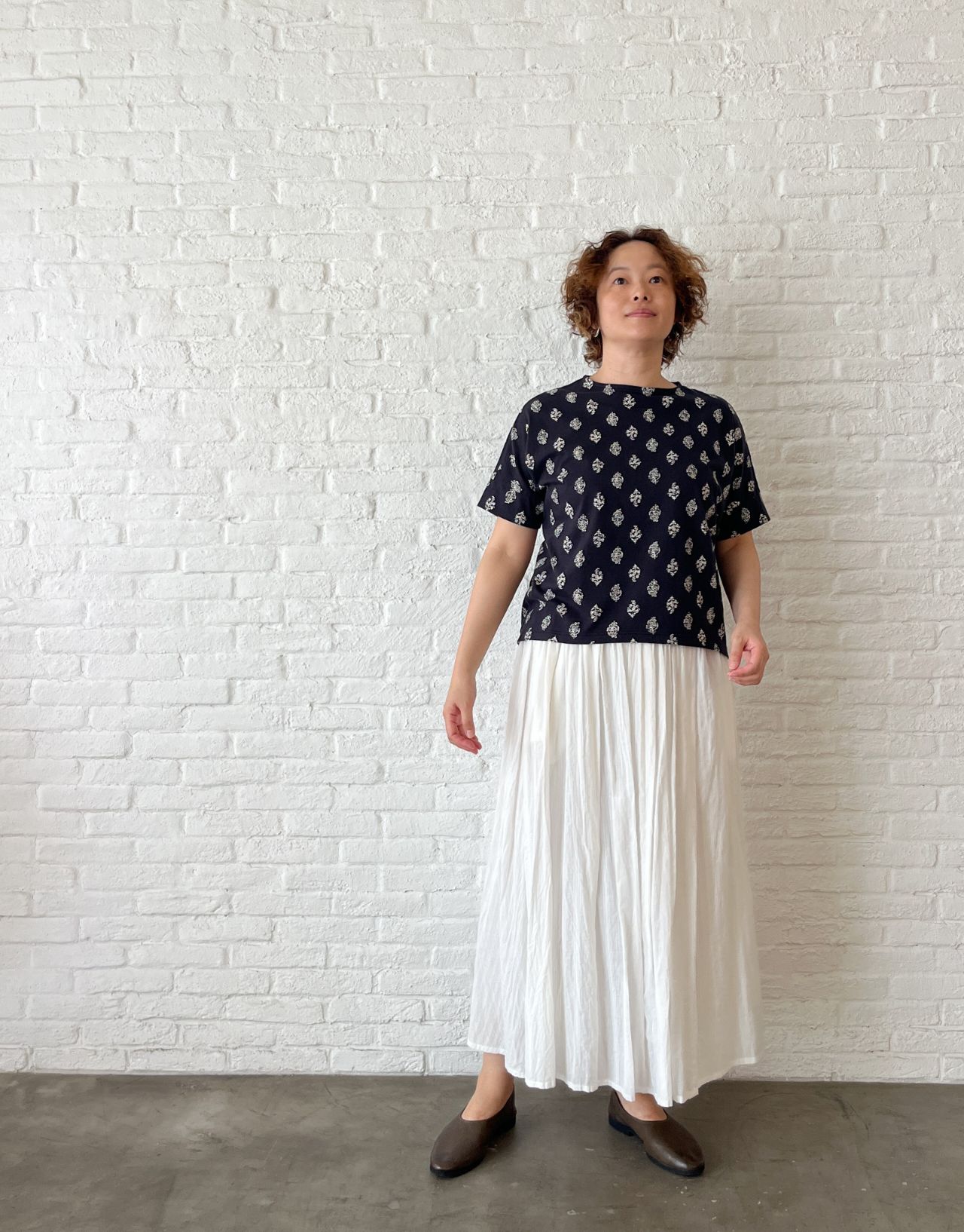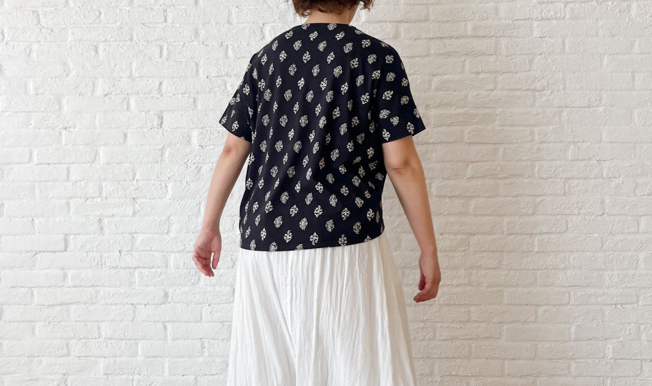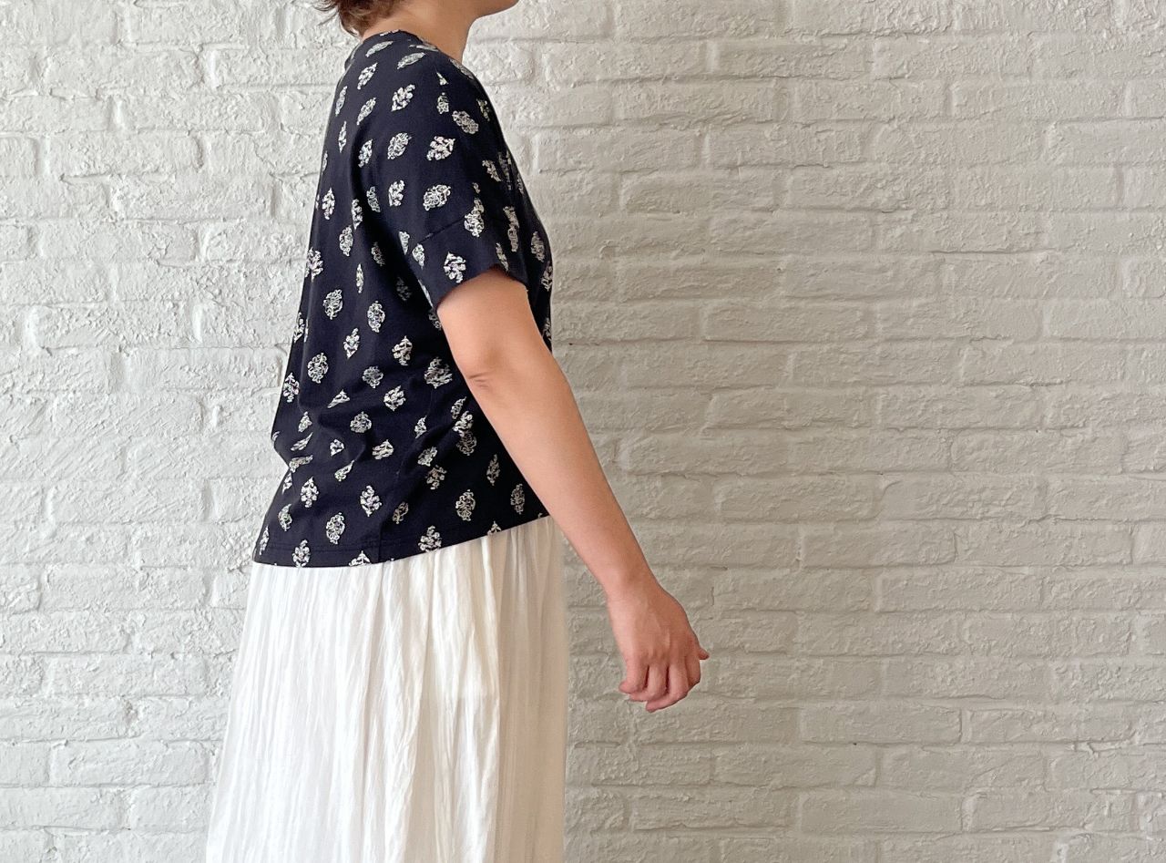 トルマリンなどのボタニカルダイで染め上げた、前面の楊柳素材がふんわりと軽いTシャツです。