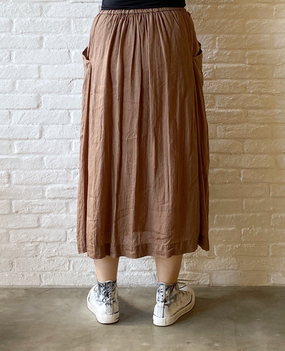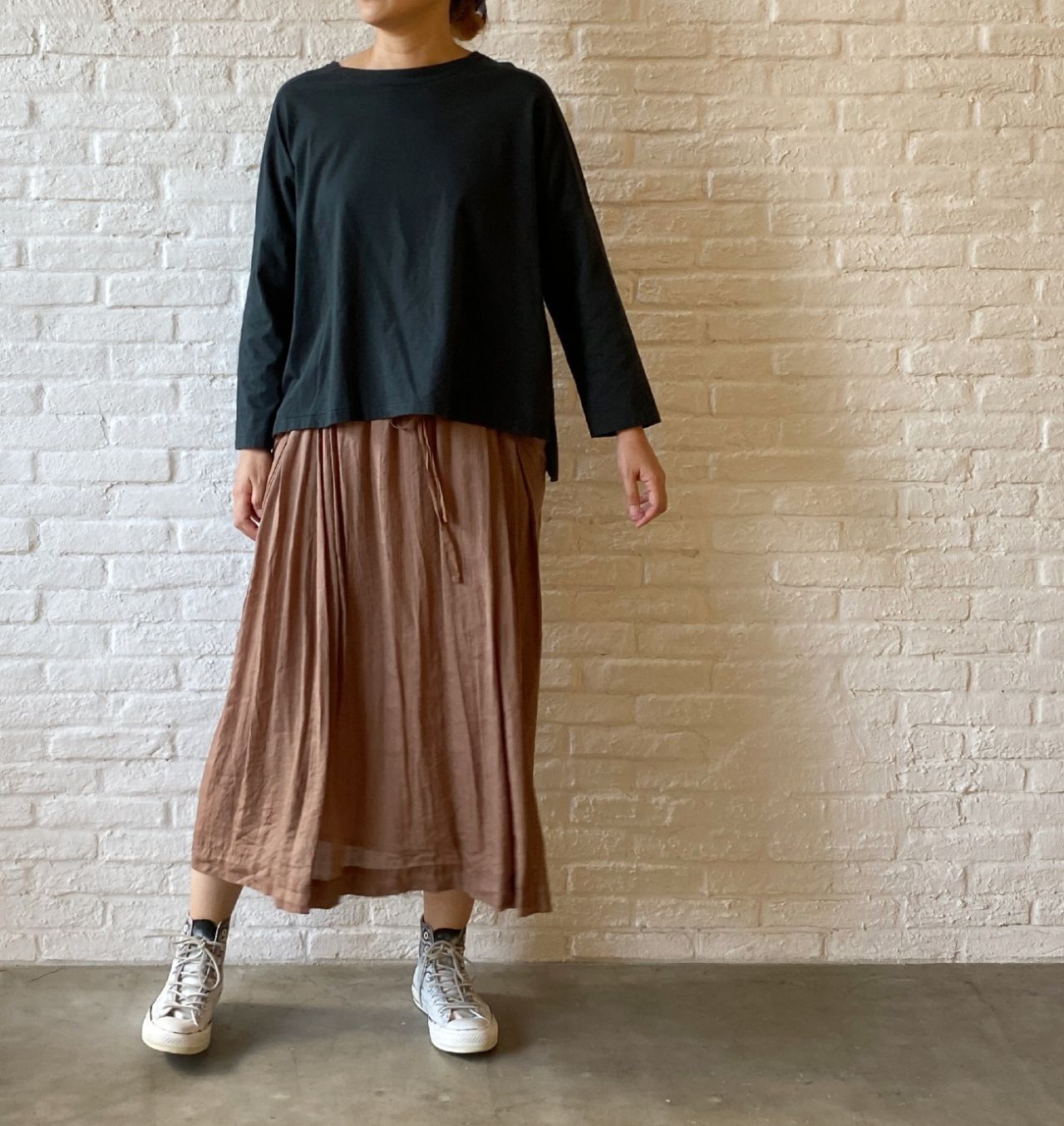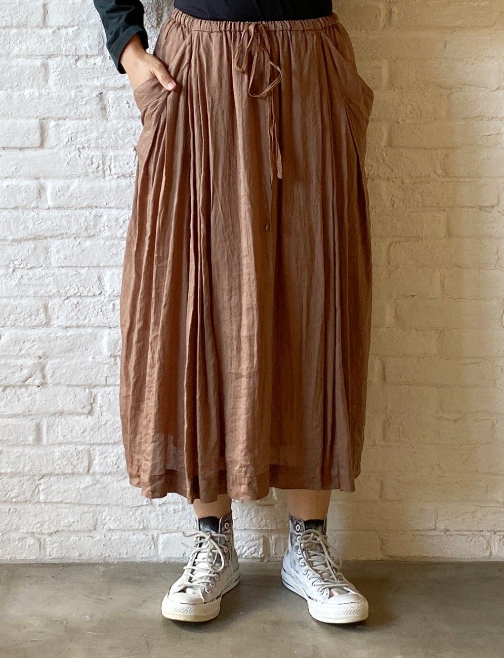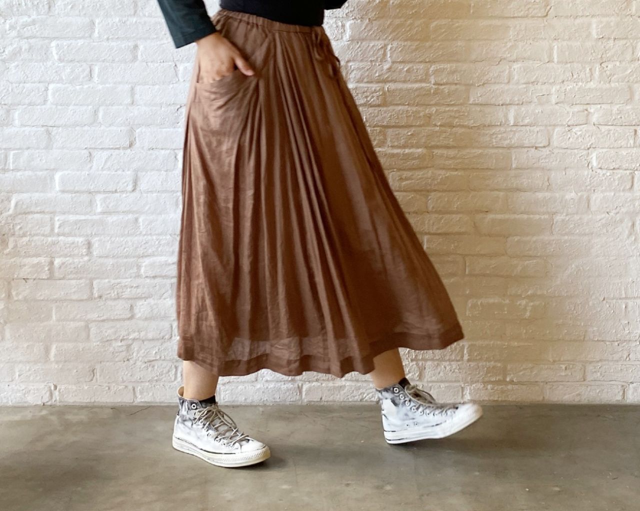 薄くて軽い履き心地のロングスカートは、大きめなポケット周りにタックが入って、歩くと動きが出るデザインです。