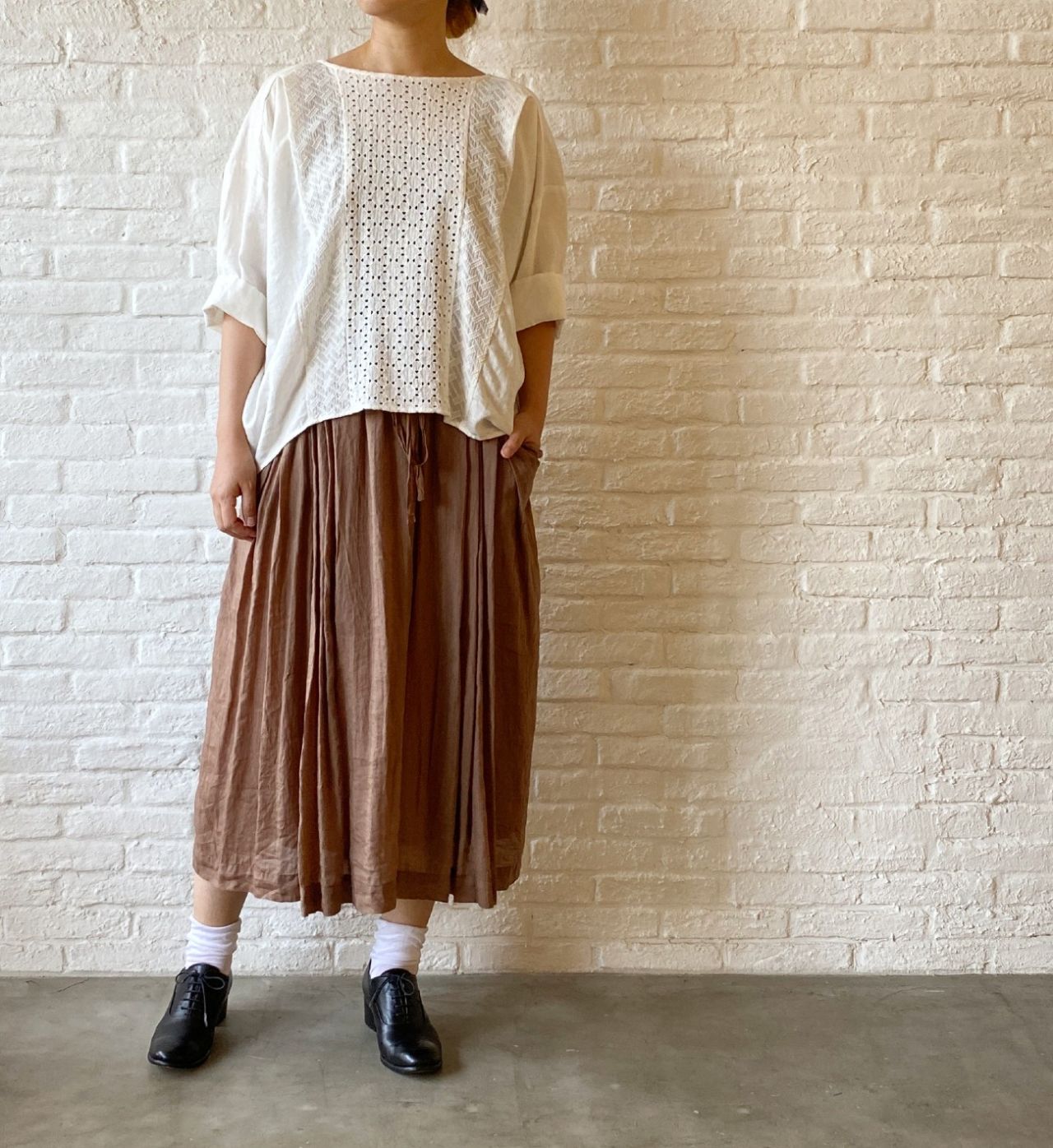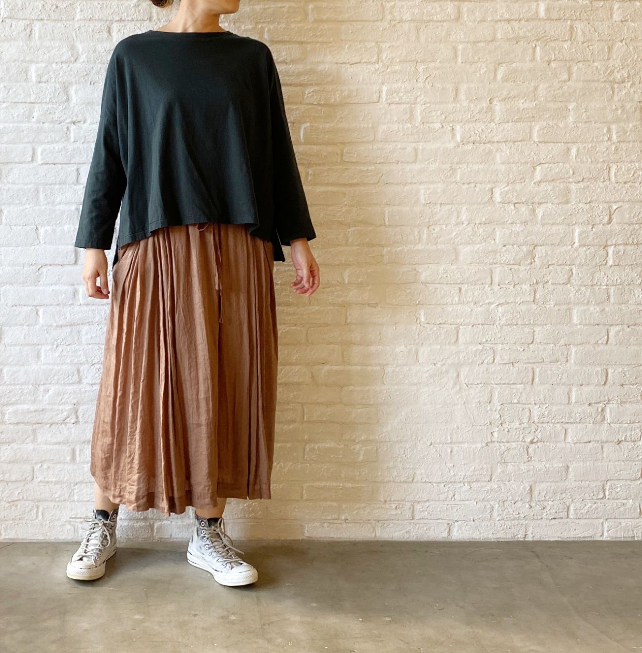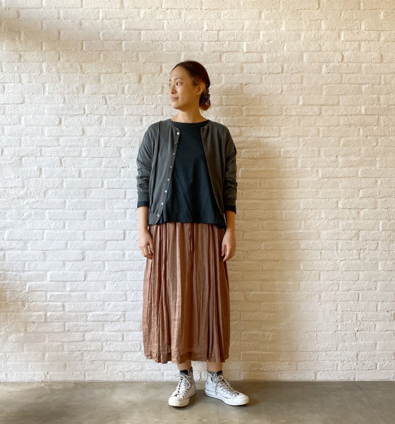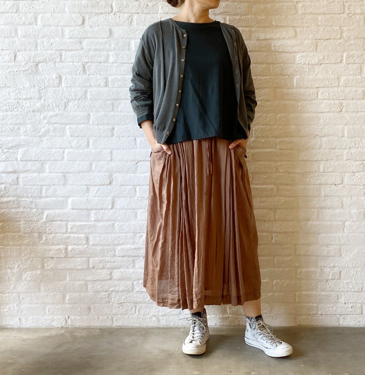 本日の「BROWN」アイテムは、北フランス・パドカレ地方の煉瓦で染めたロングスカートで、着回しコーディネートです。
