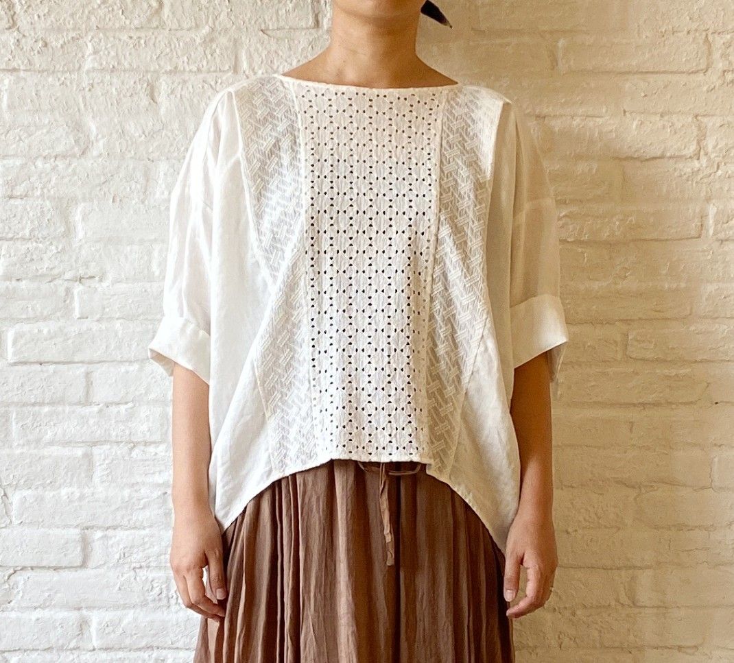 ラウンドを描いた前裾がアクセントになった、レース切替ブラウス。