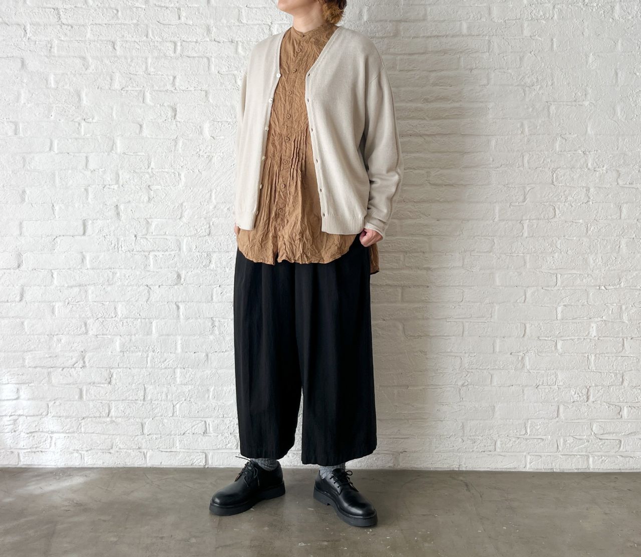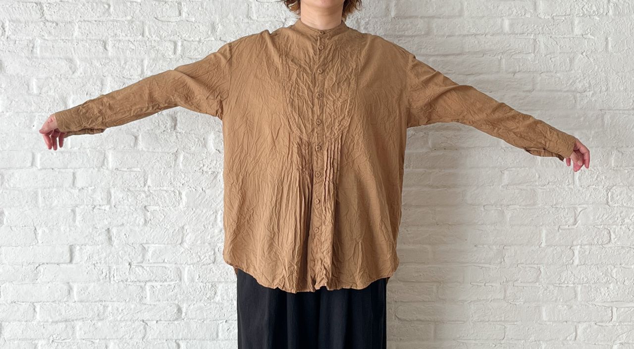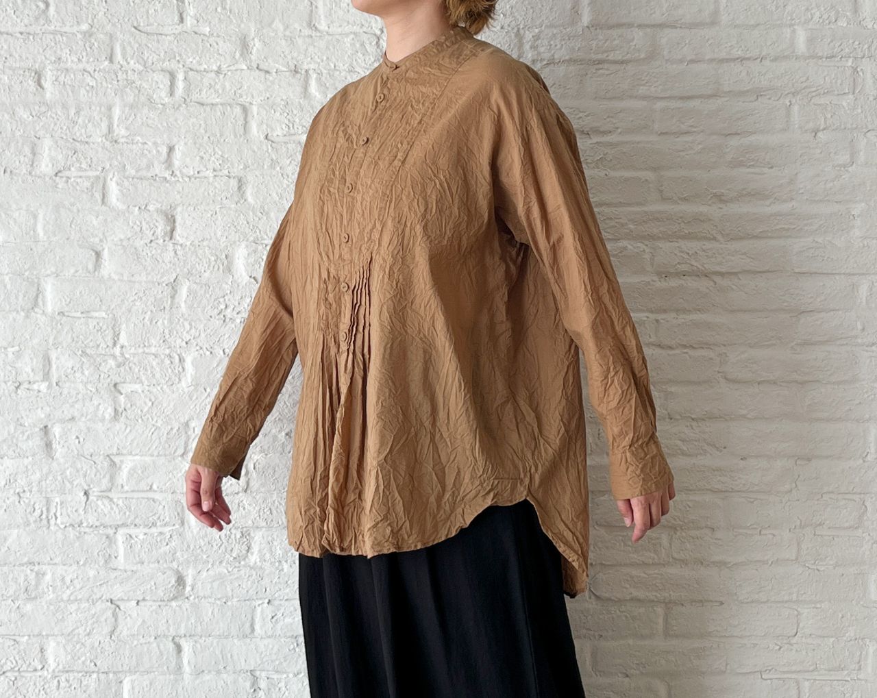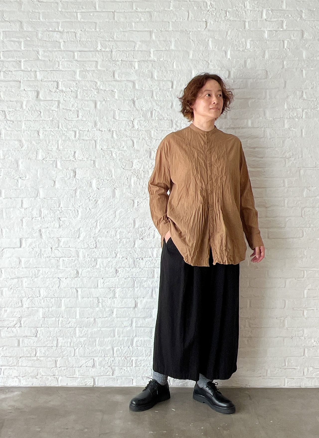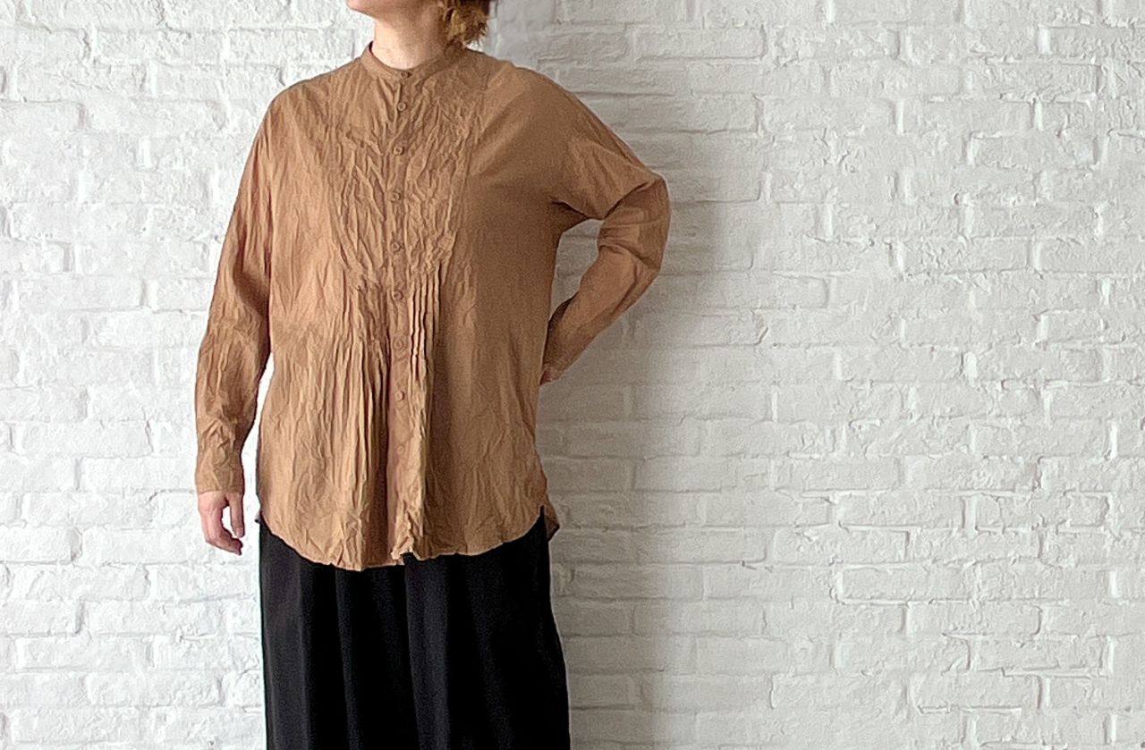 肌に馴染むような色で、着合わせしやすいブラウスです。