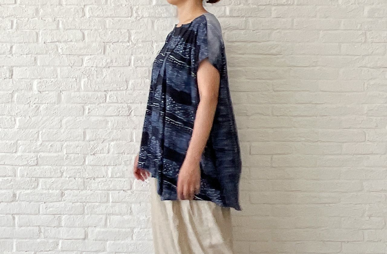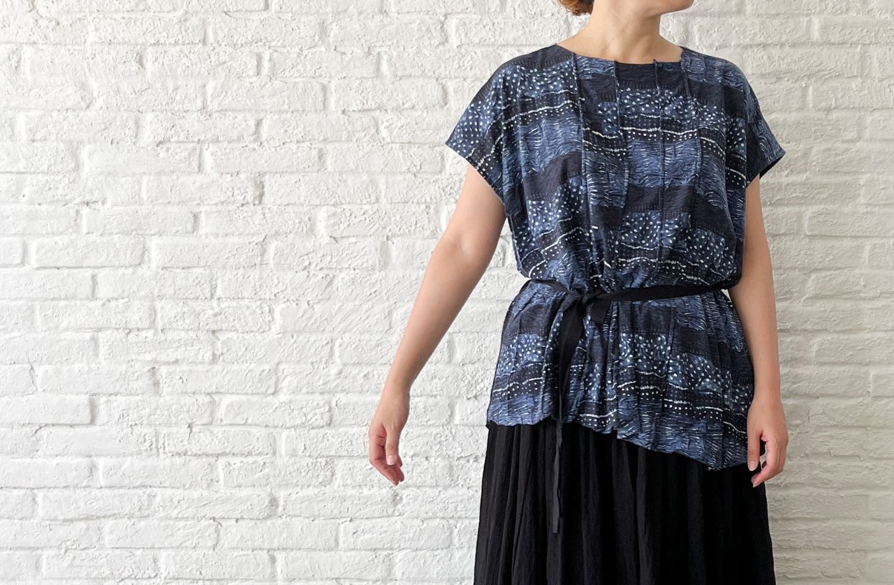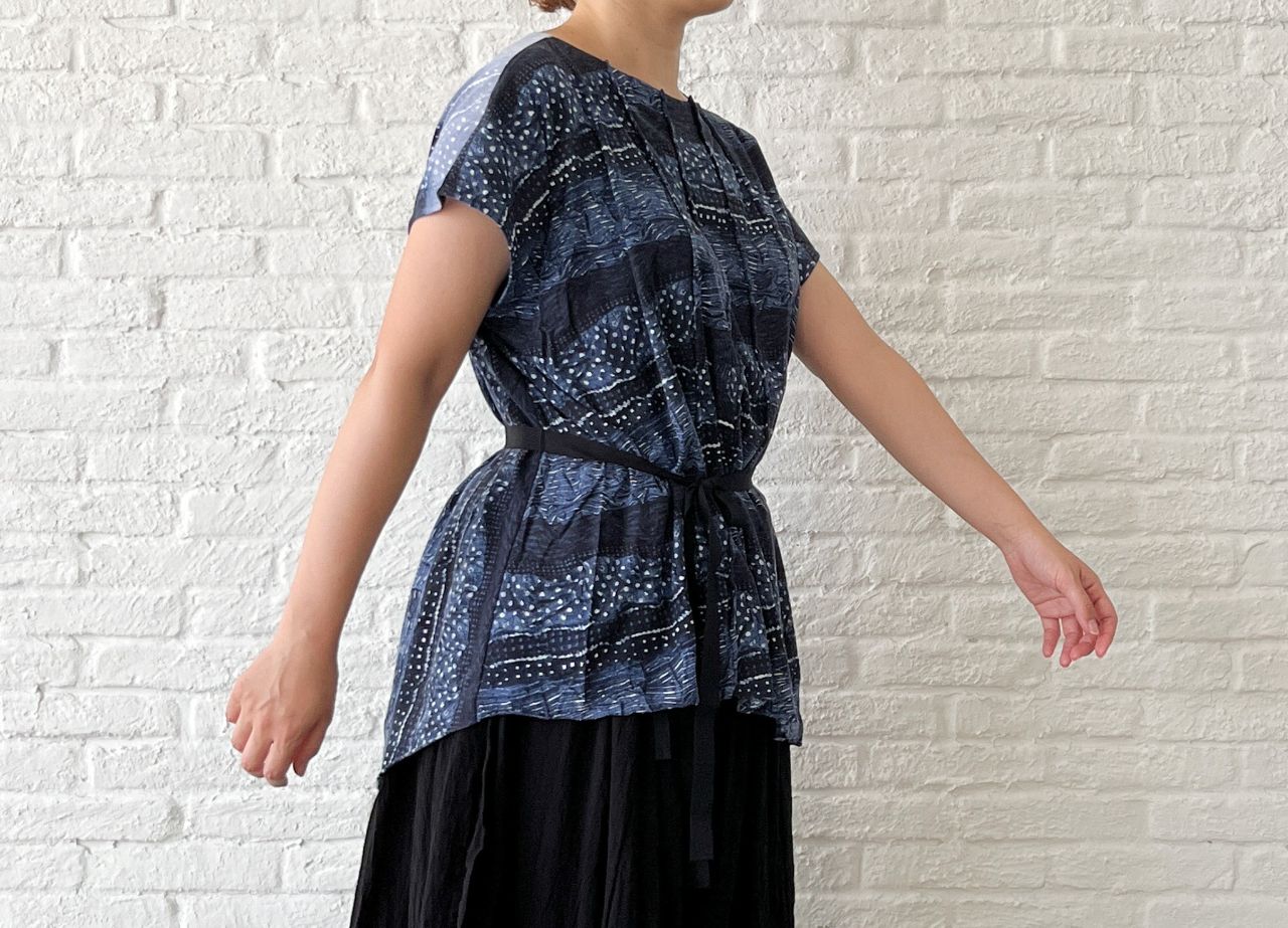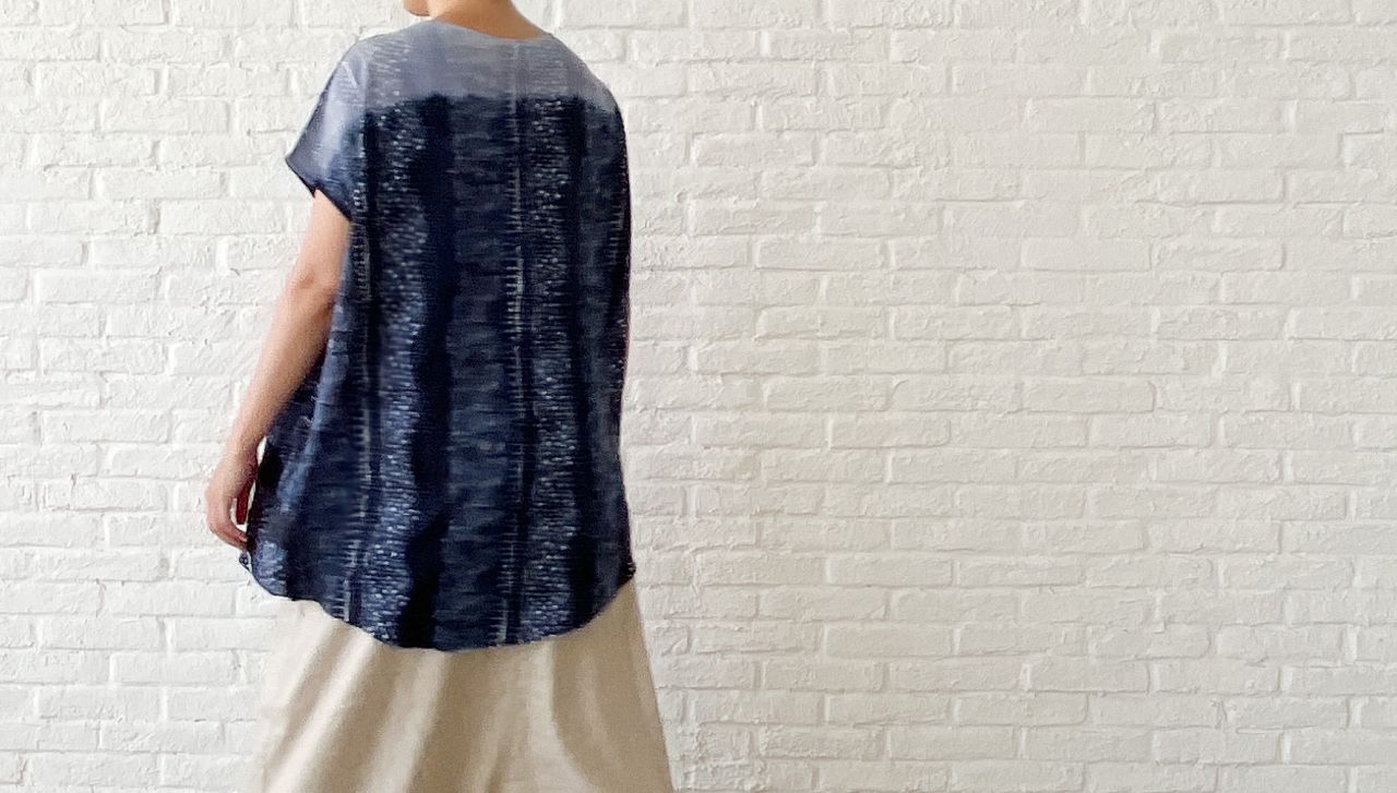 ブルーなので、明るいボトムスを合わせると涼し気な印象で着ていただけます。