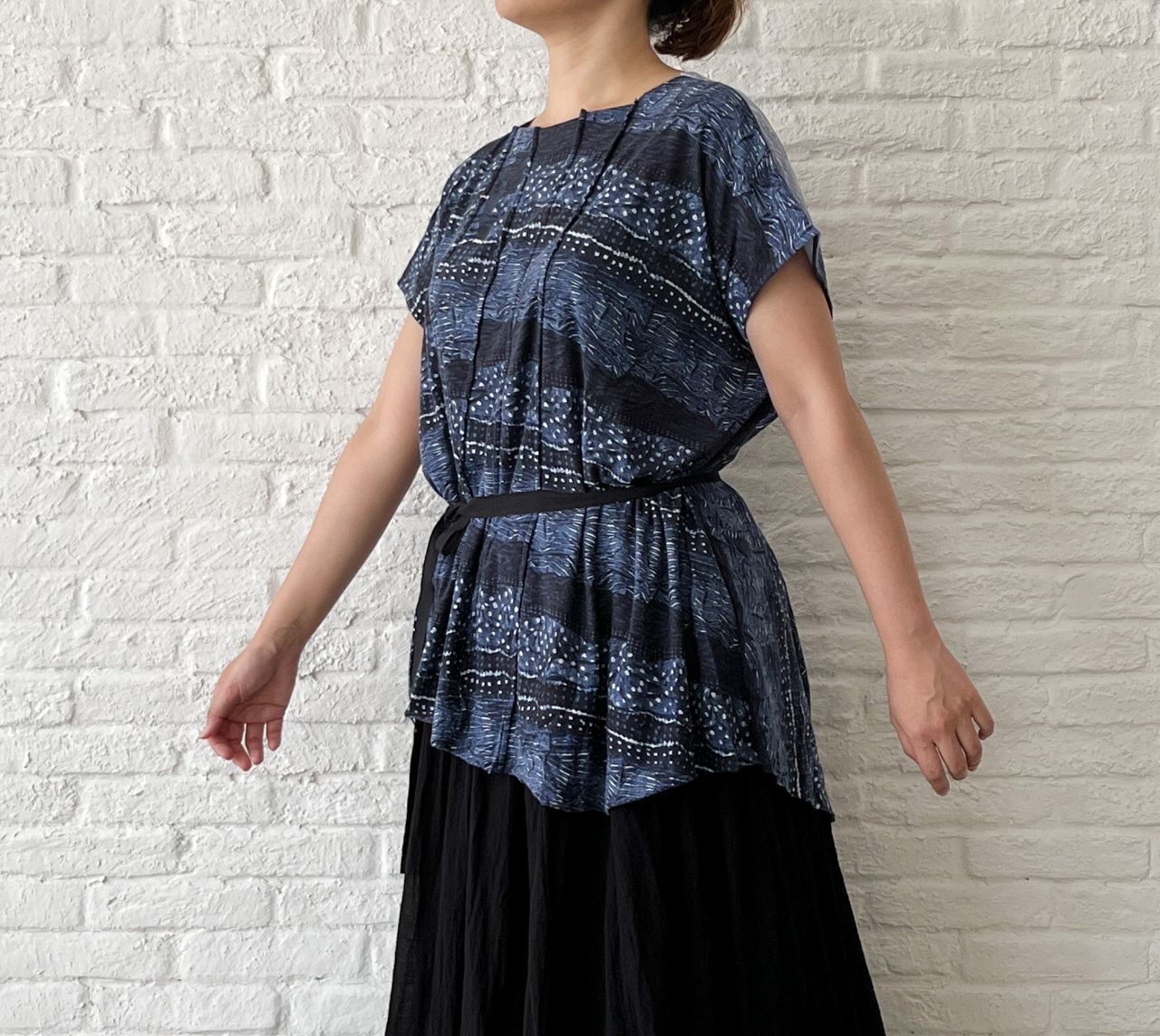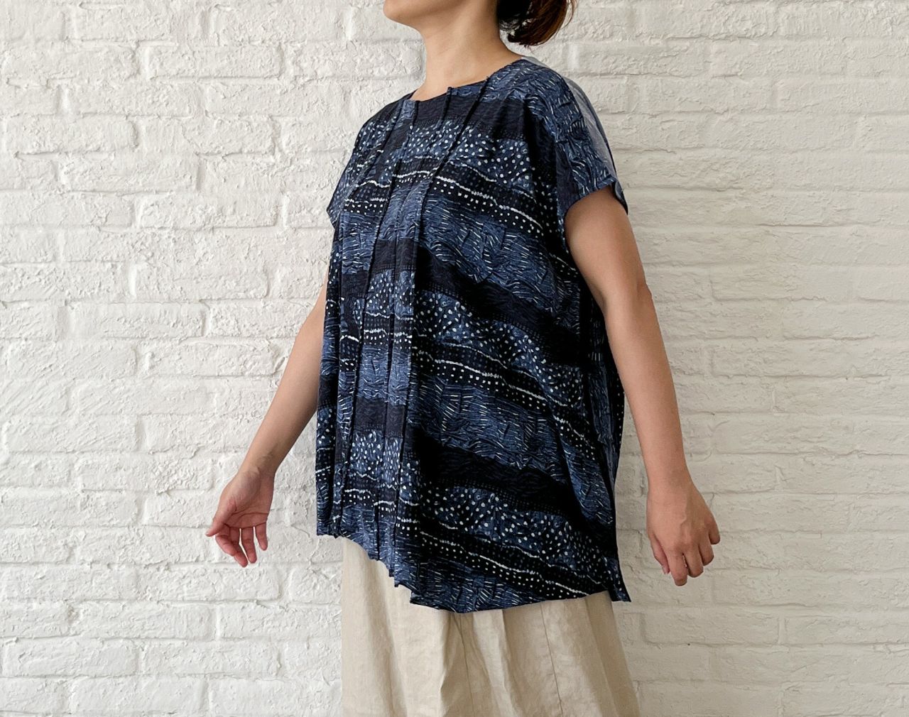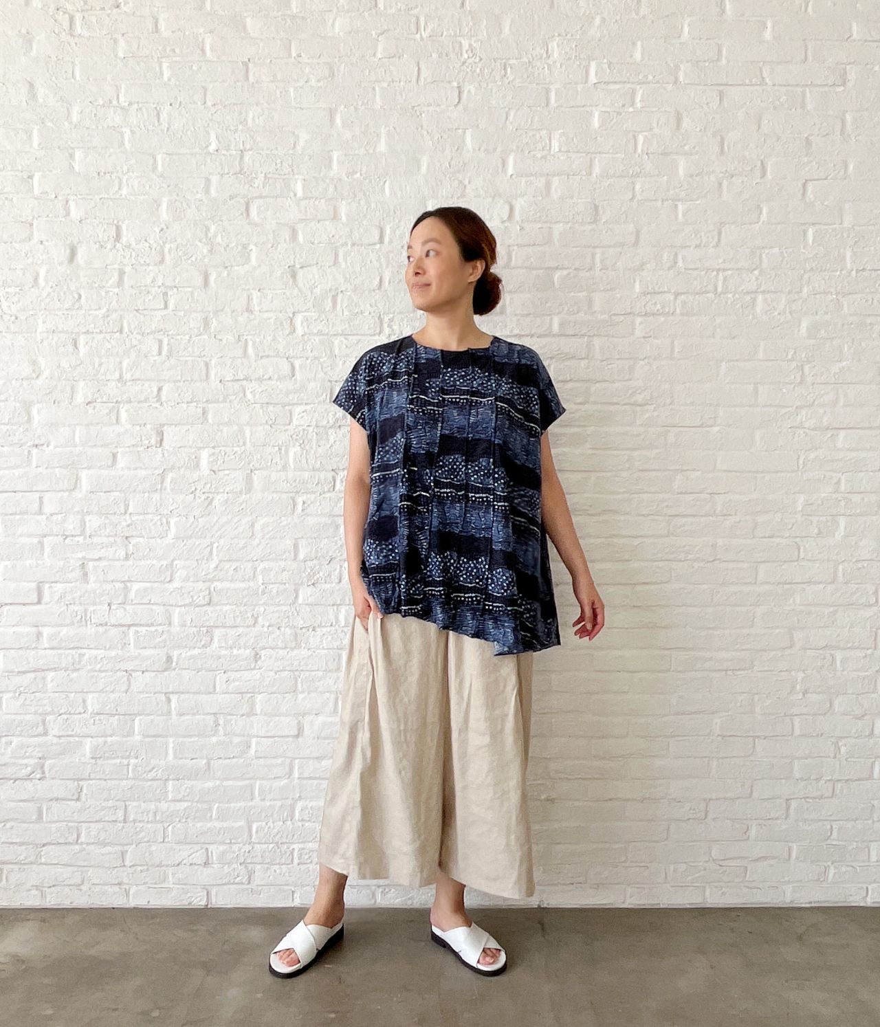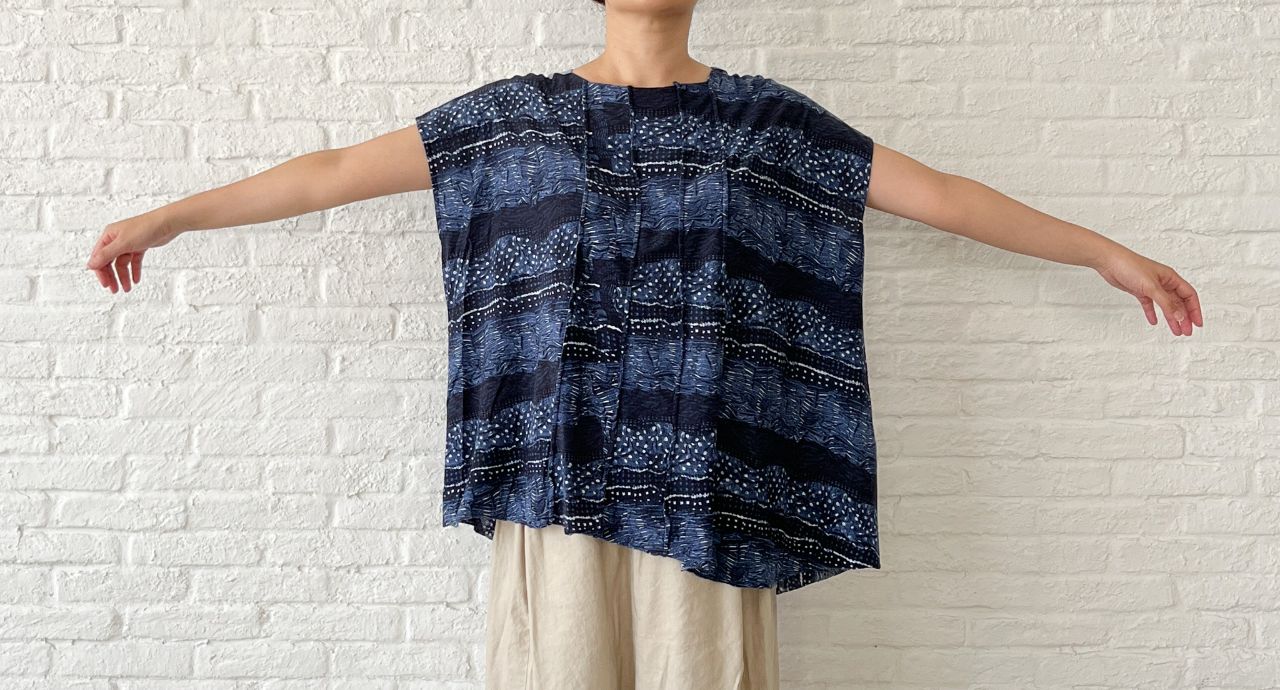 ブルーなので、明るいボトムスを合わせると涼し気な印象で着ていただけます。