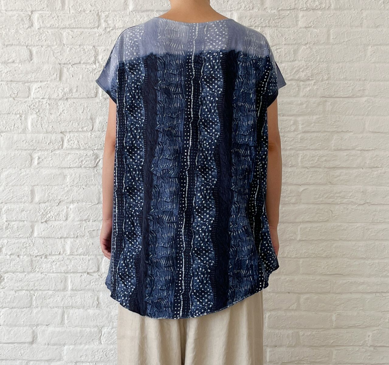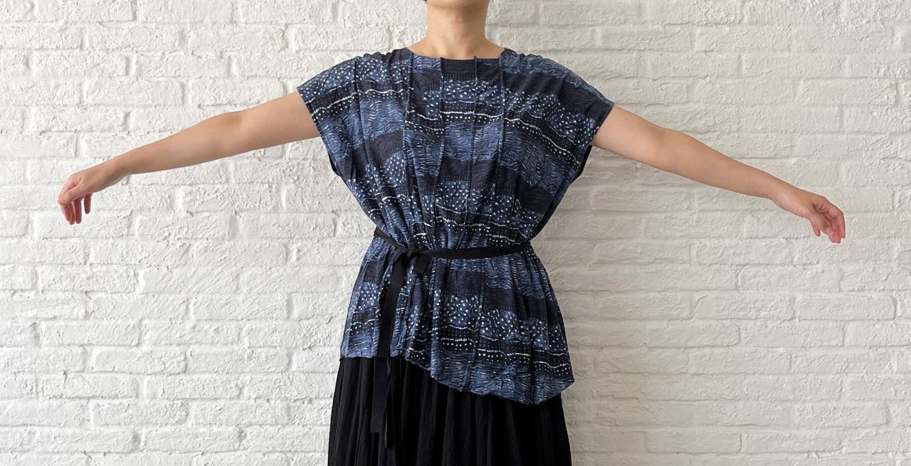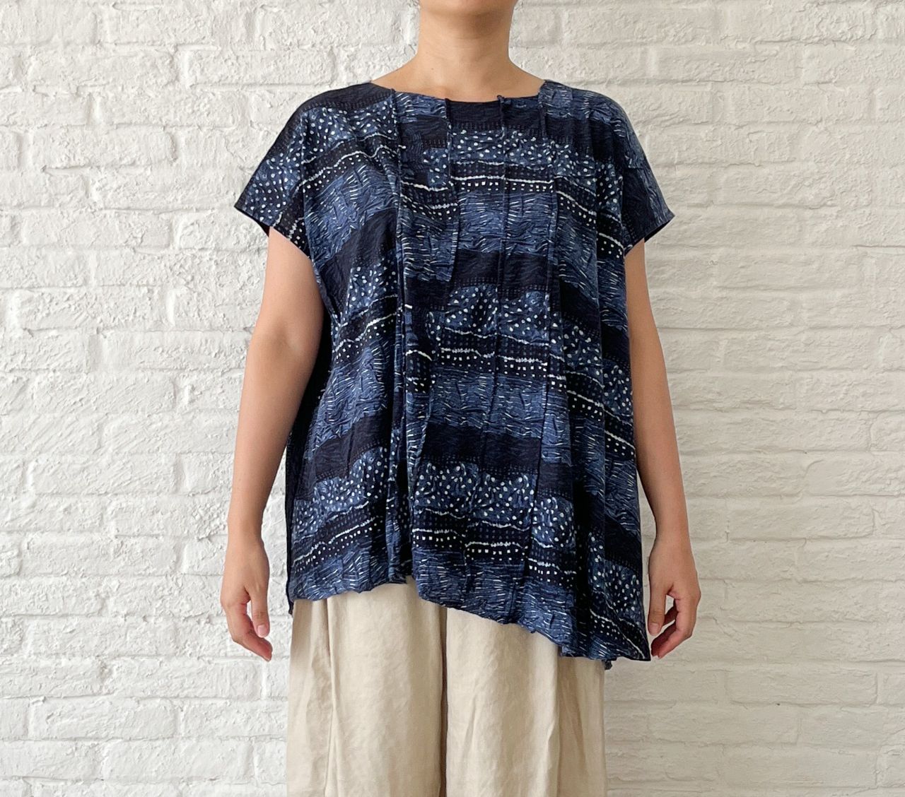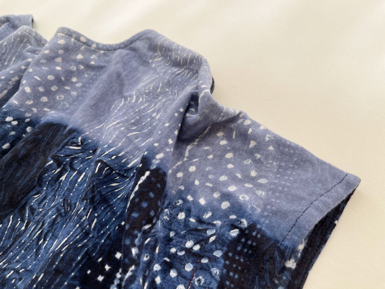 ブルーなので、明るいボトムスを合わせると涼し気な印象で着ていただけます。
