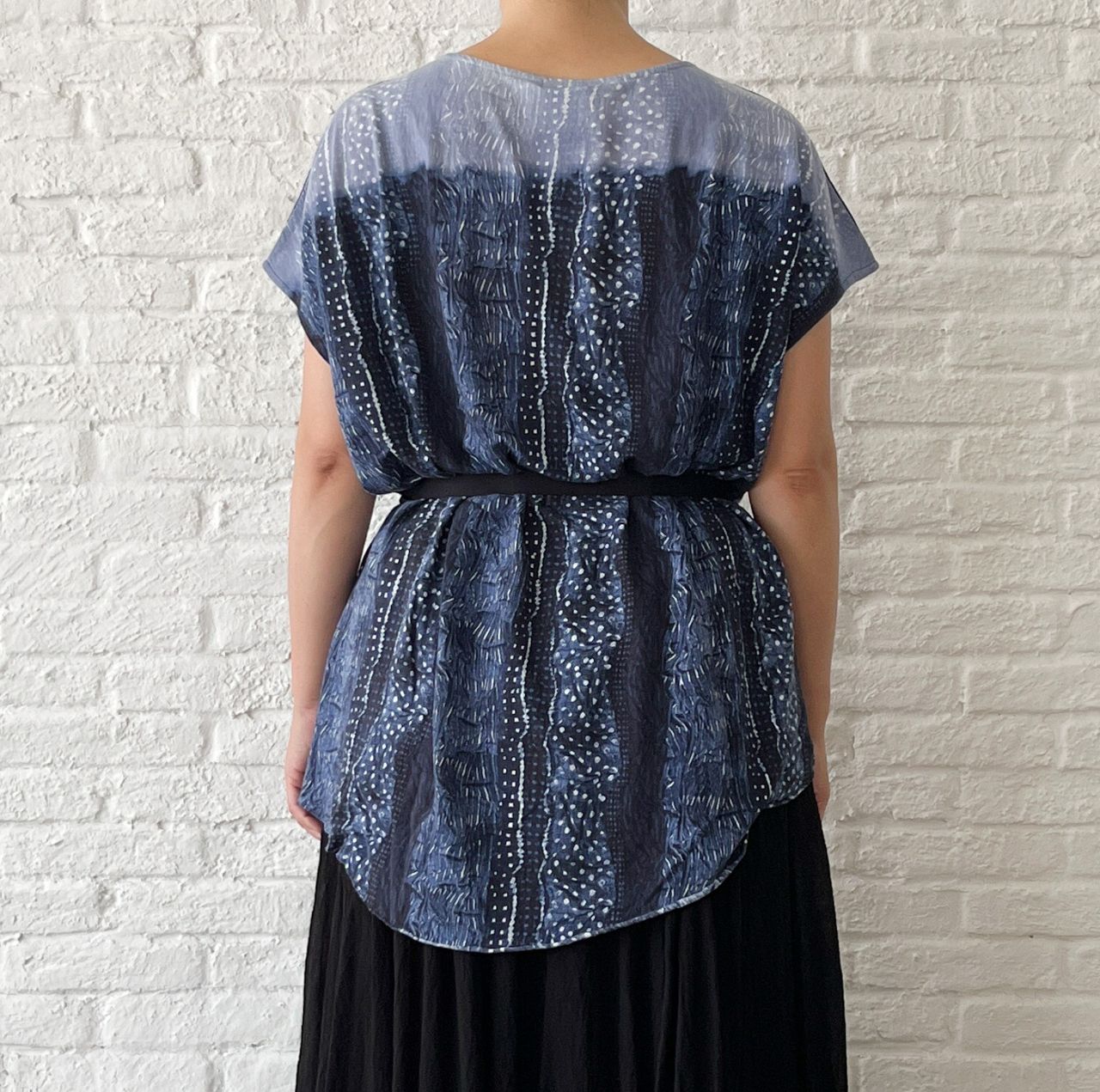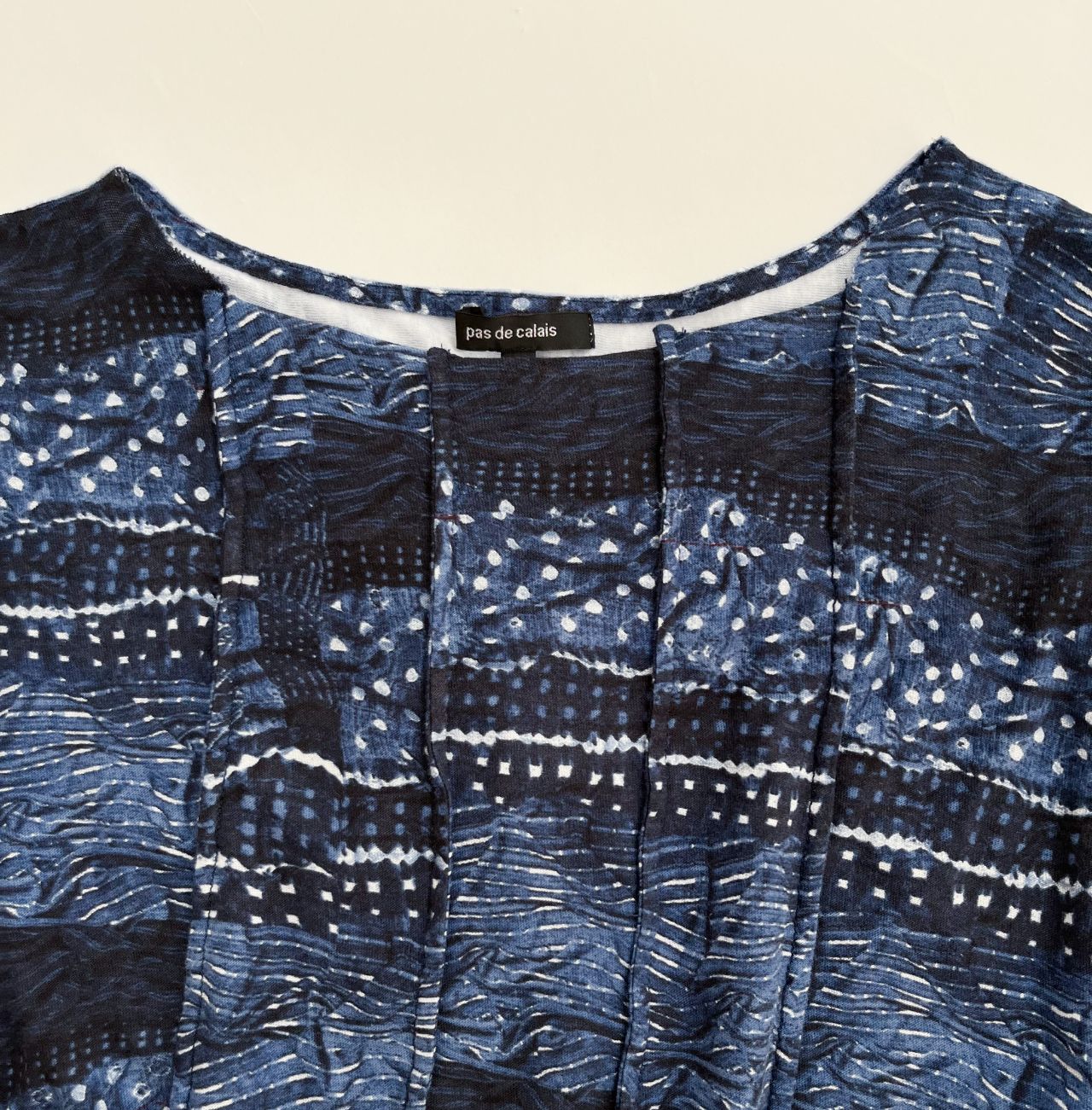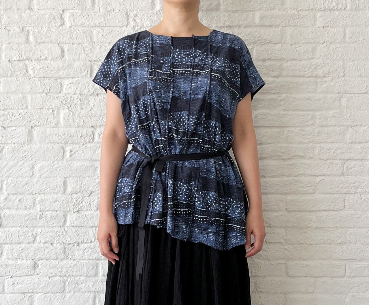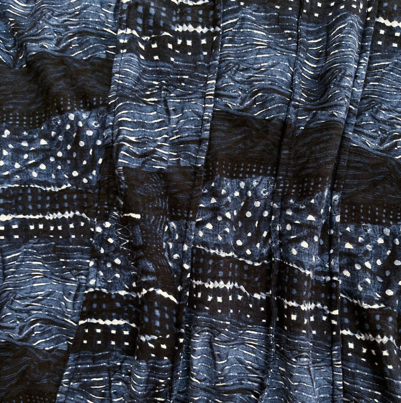 ドットとボーダーがランダムに入って、水飛沫のような柄です。