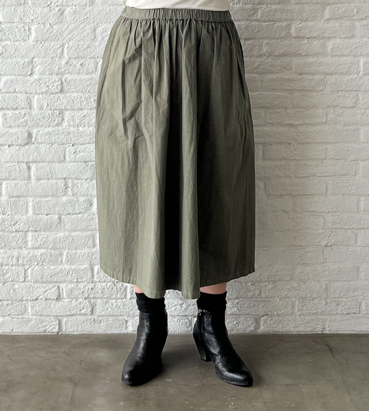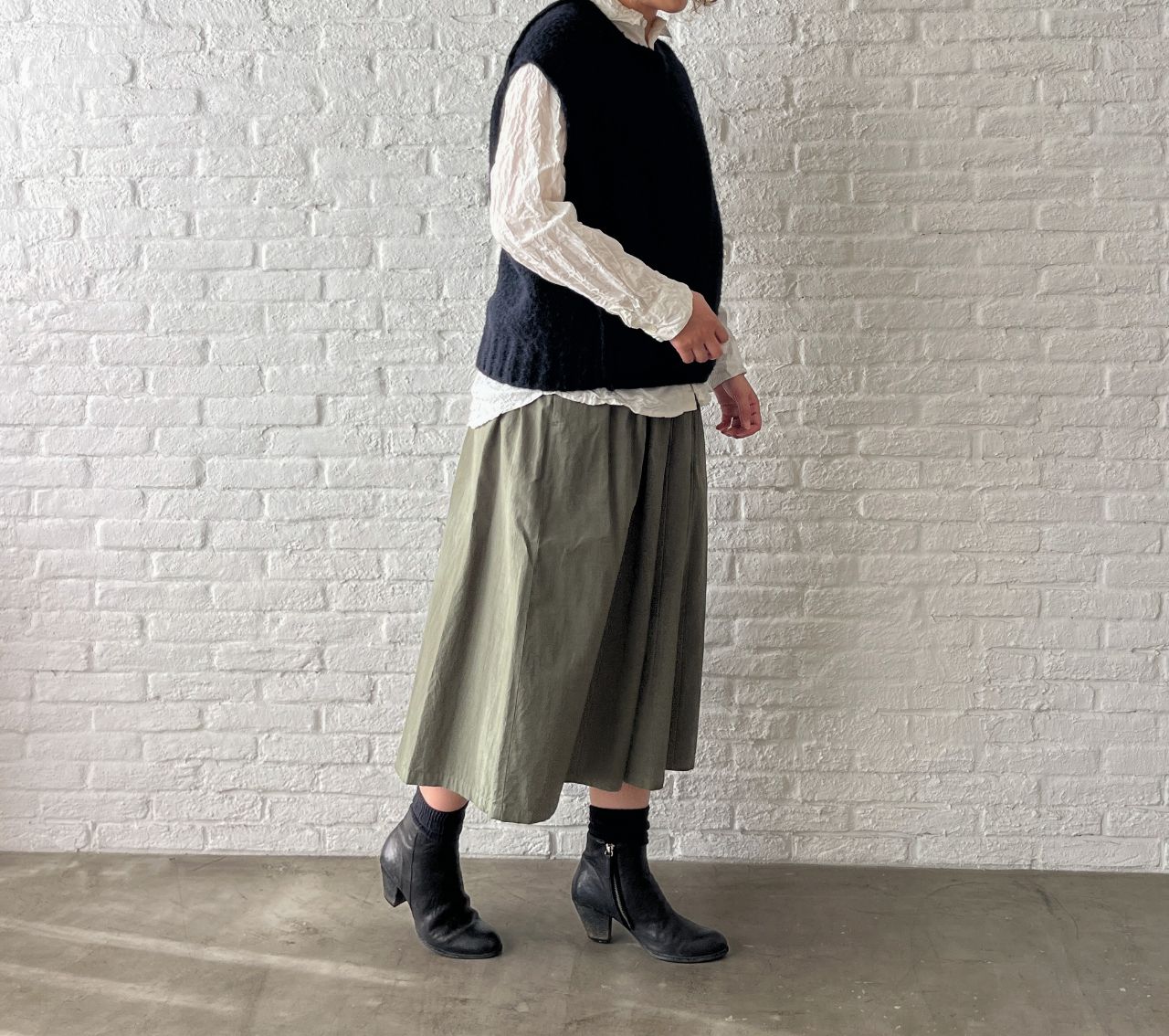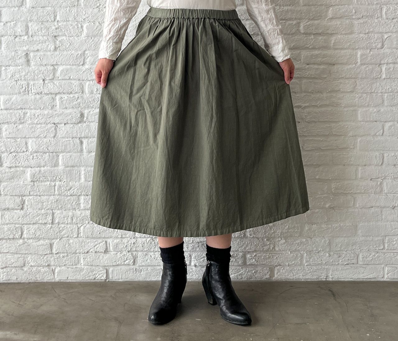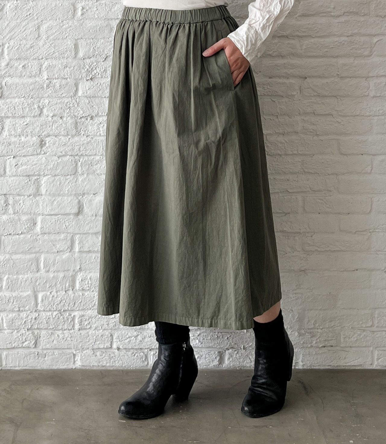 冬はブーツで合わせたい、ウエストゴムのベーシックなロングスカート。