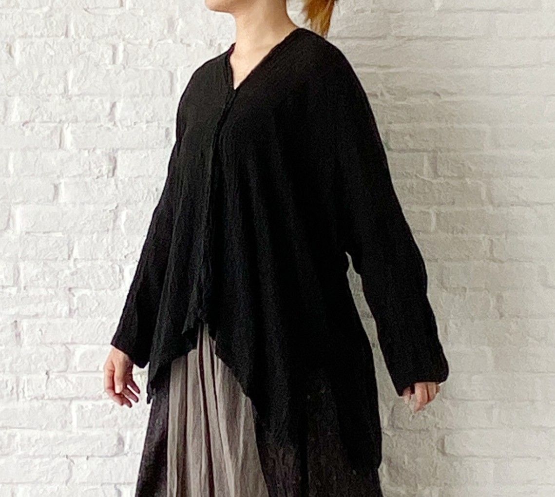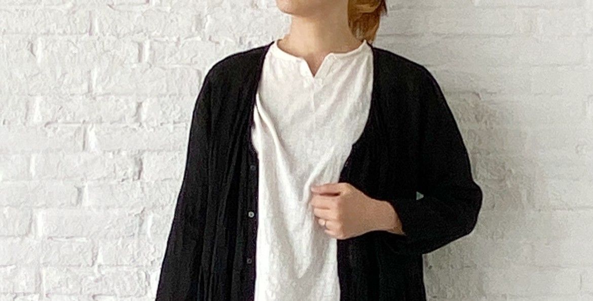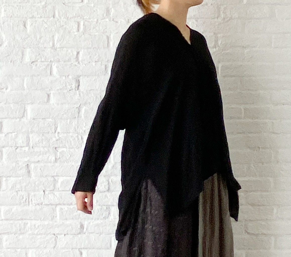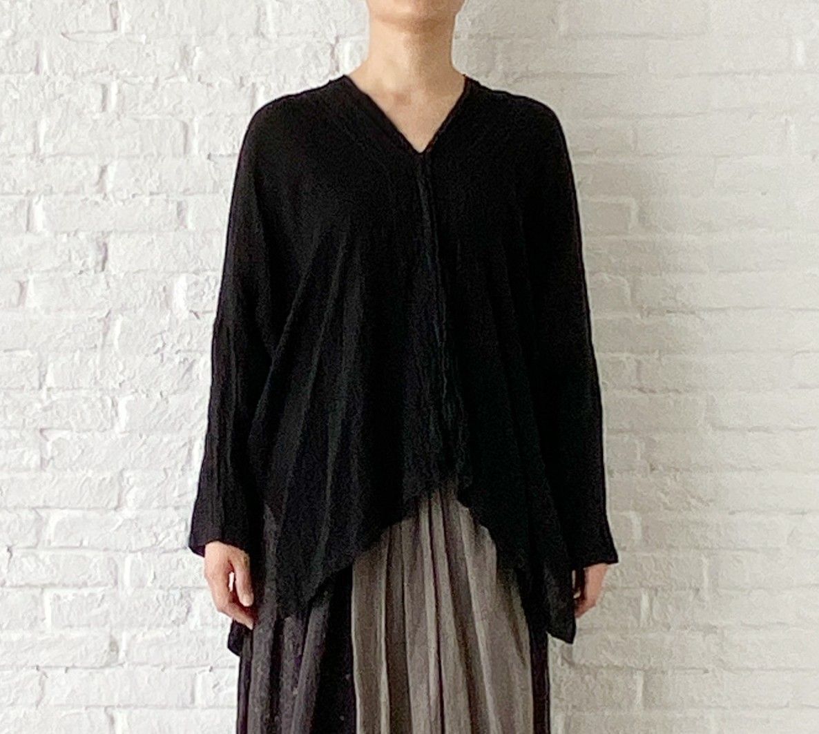 最初のコーディネートに使用したクロのVネックブラウスと同シリーズ。