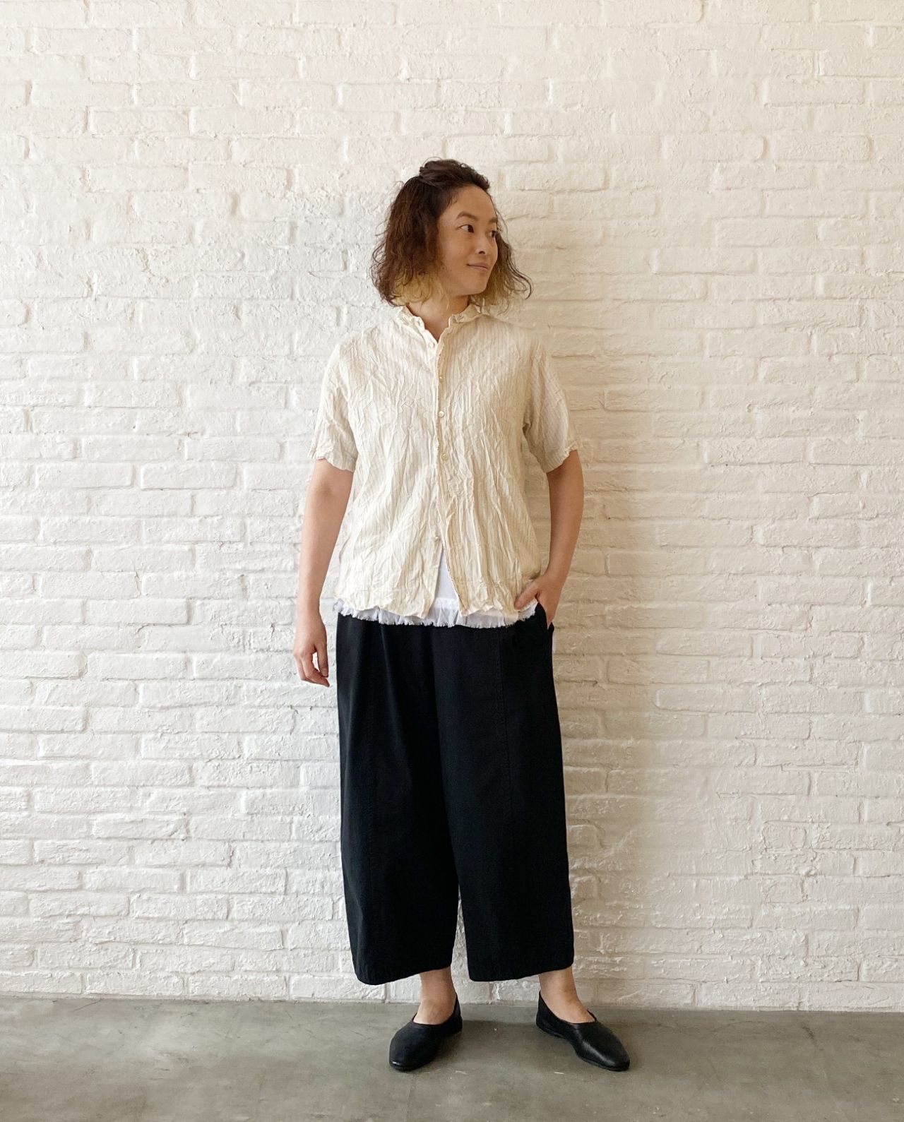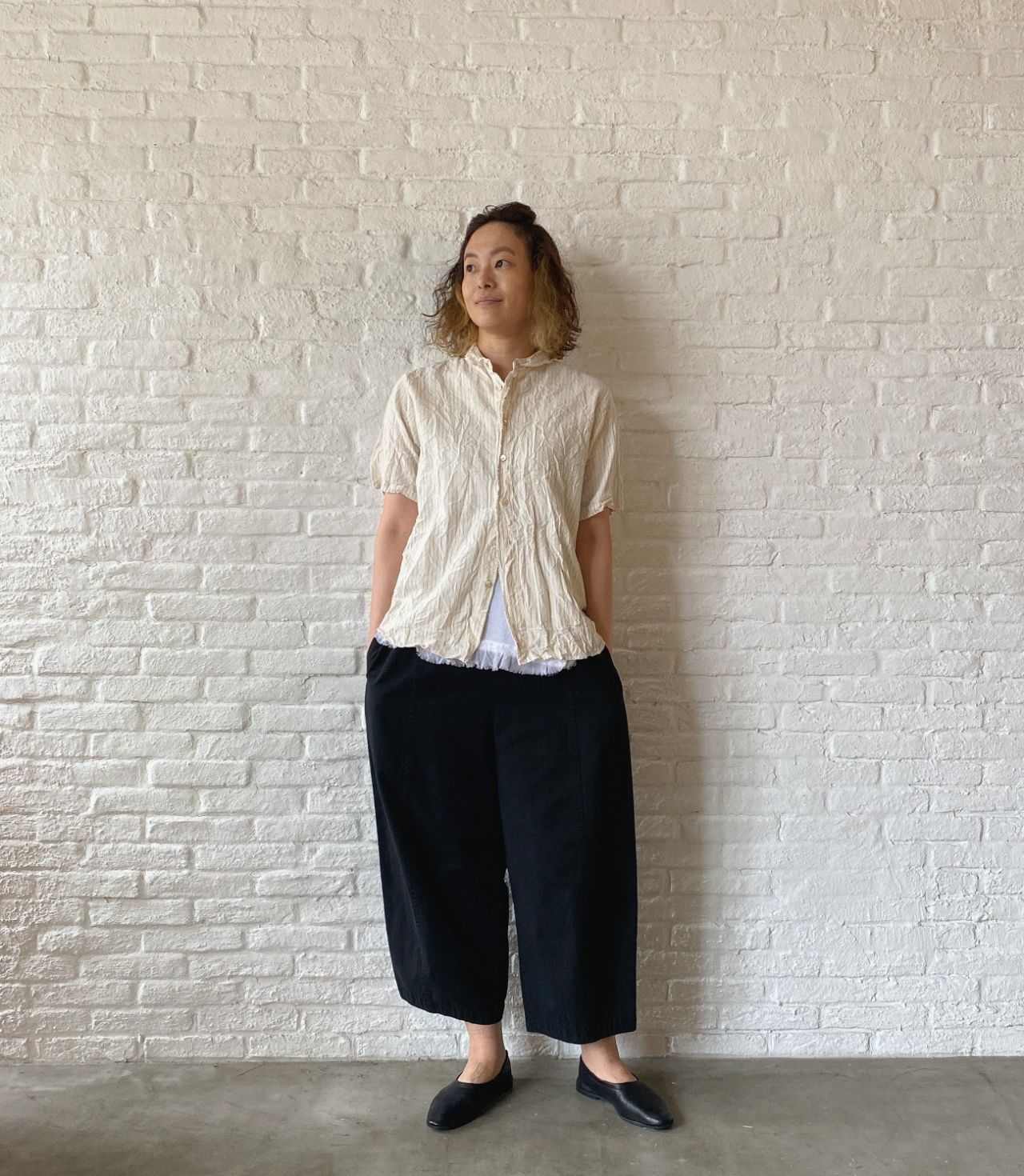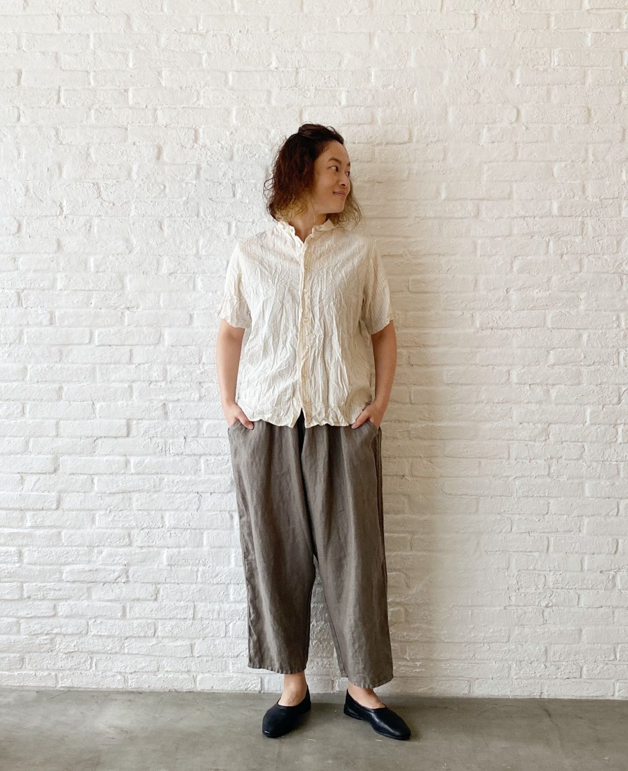 カジュアル感が強いシャツなので、リネンのサルエルパンツで。