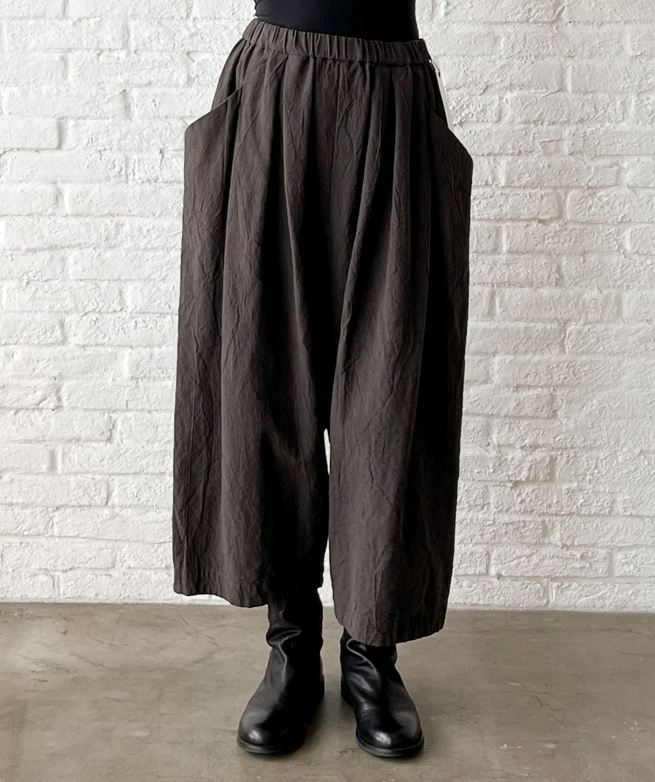 立体的なサイドのポケットがポイントなので、トップスをウエストインした着こなしも◎。