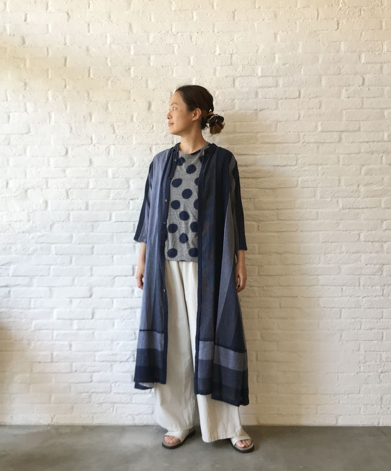 ドット柄のネイビーに合わせてブルーをチョイスした、涼し気なコーディネート。