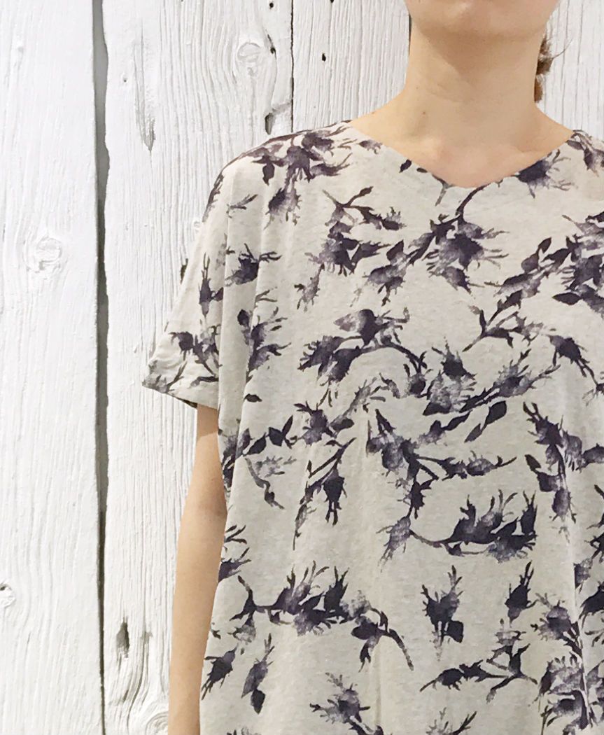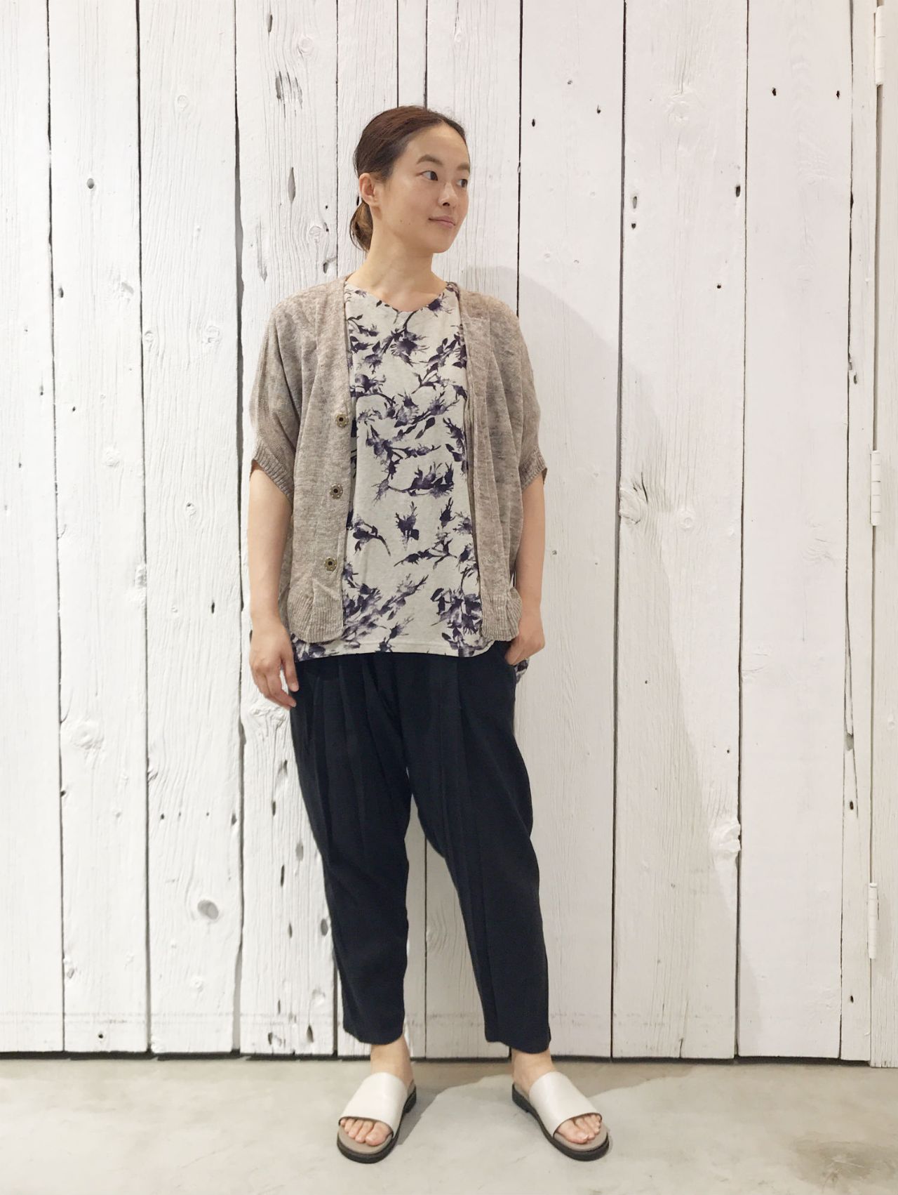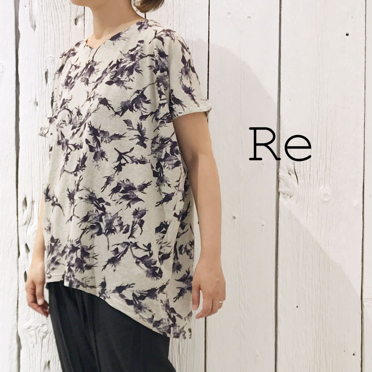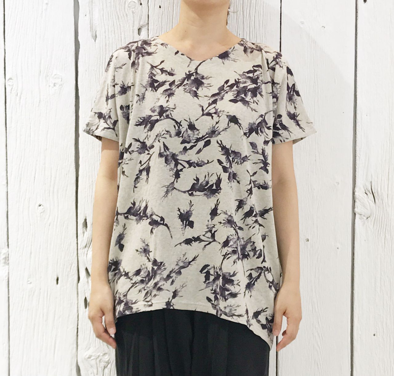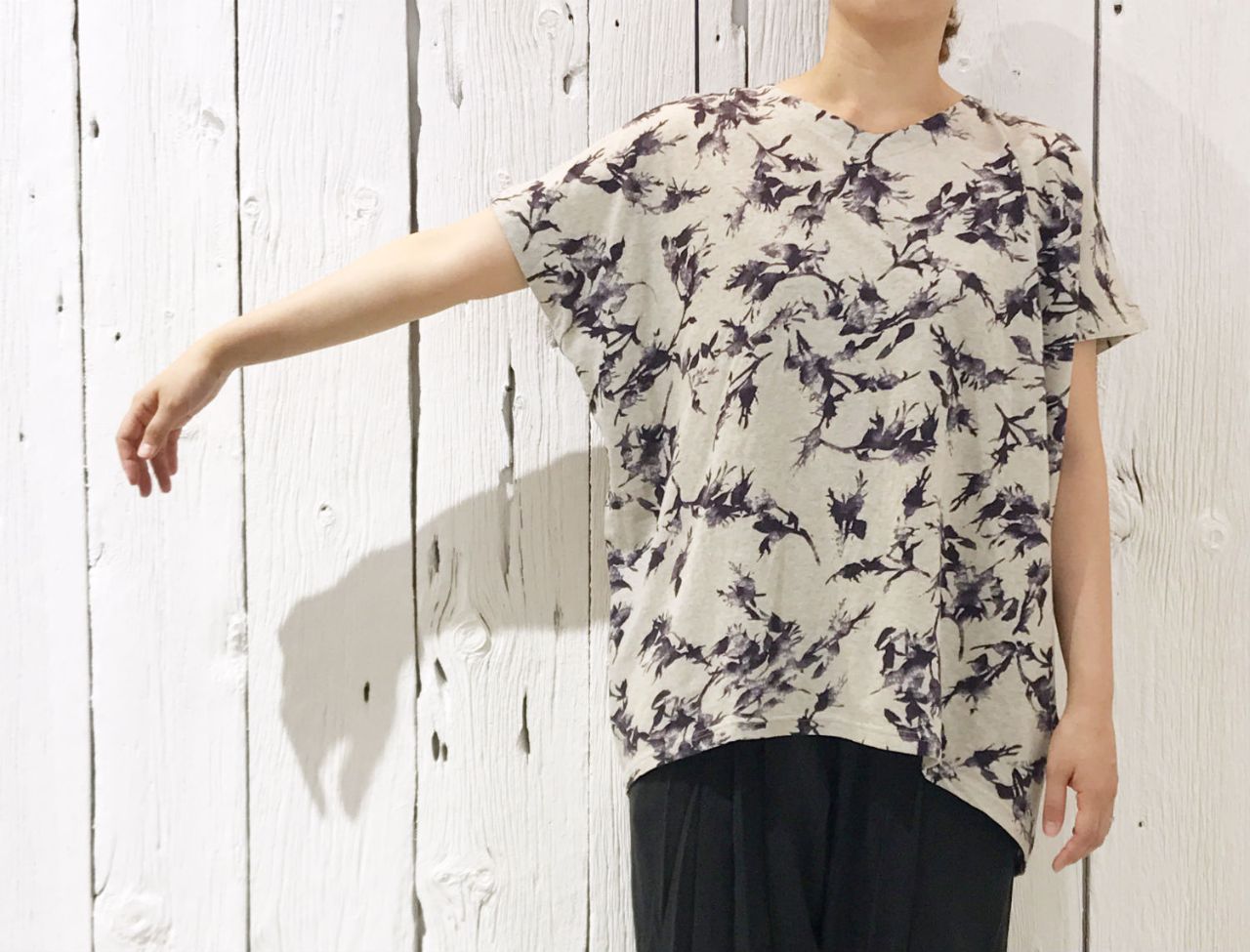 ホワイトより透け感が気にならないキナリのベースに、紫のフラワープリント。