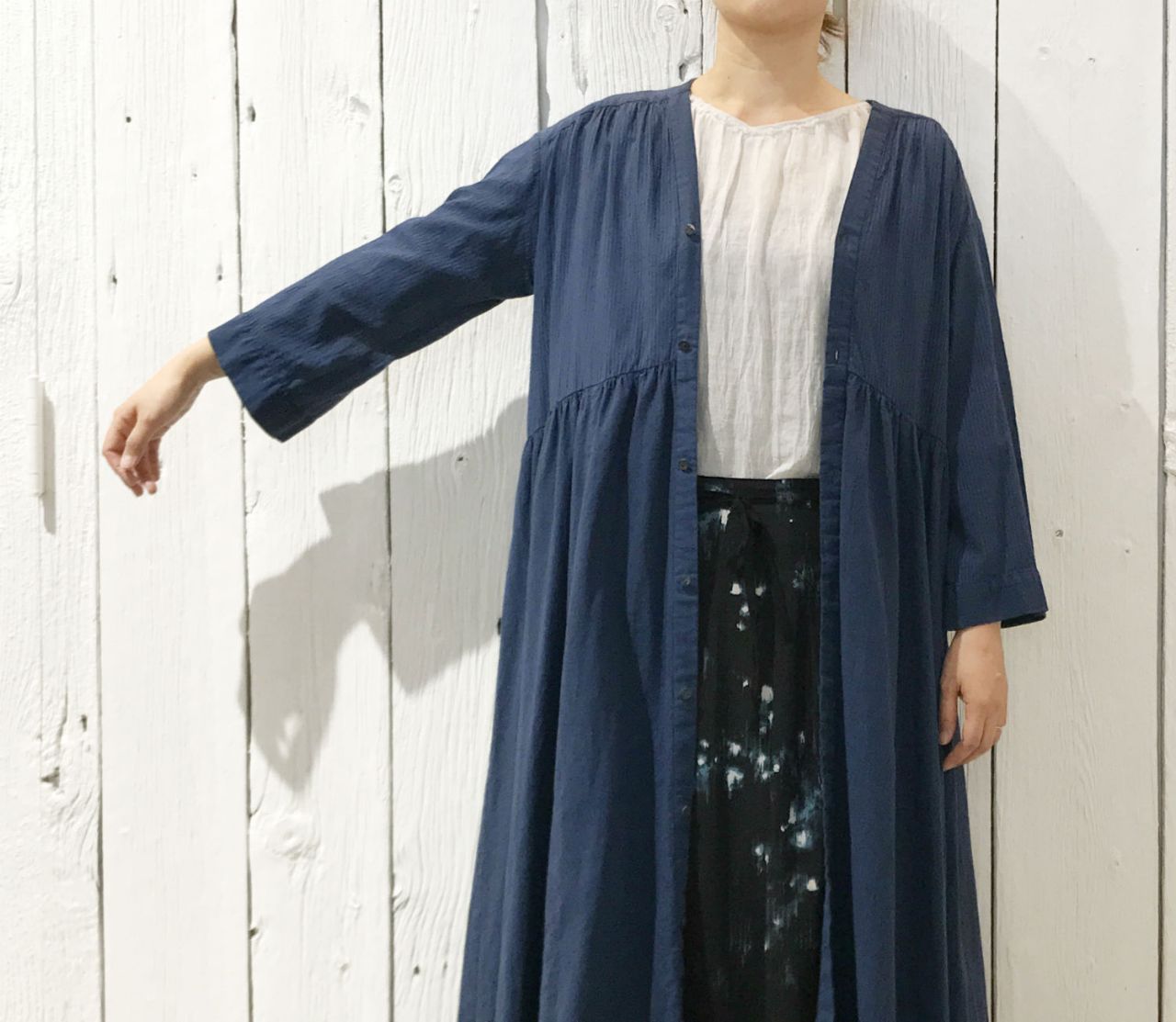ぐるりと全体的にギャザーが入ったデザインの、シャツワンピース。