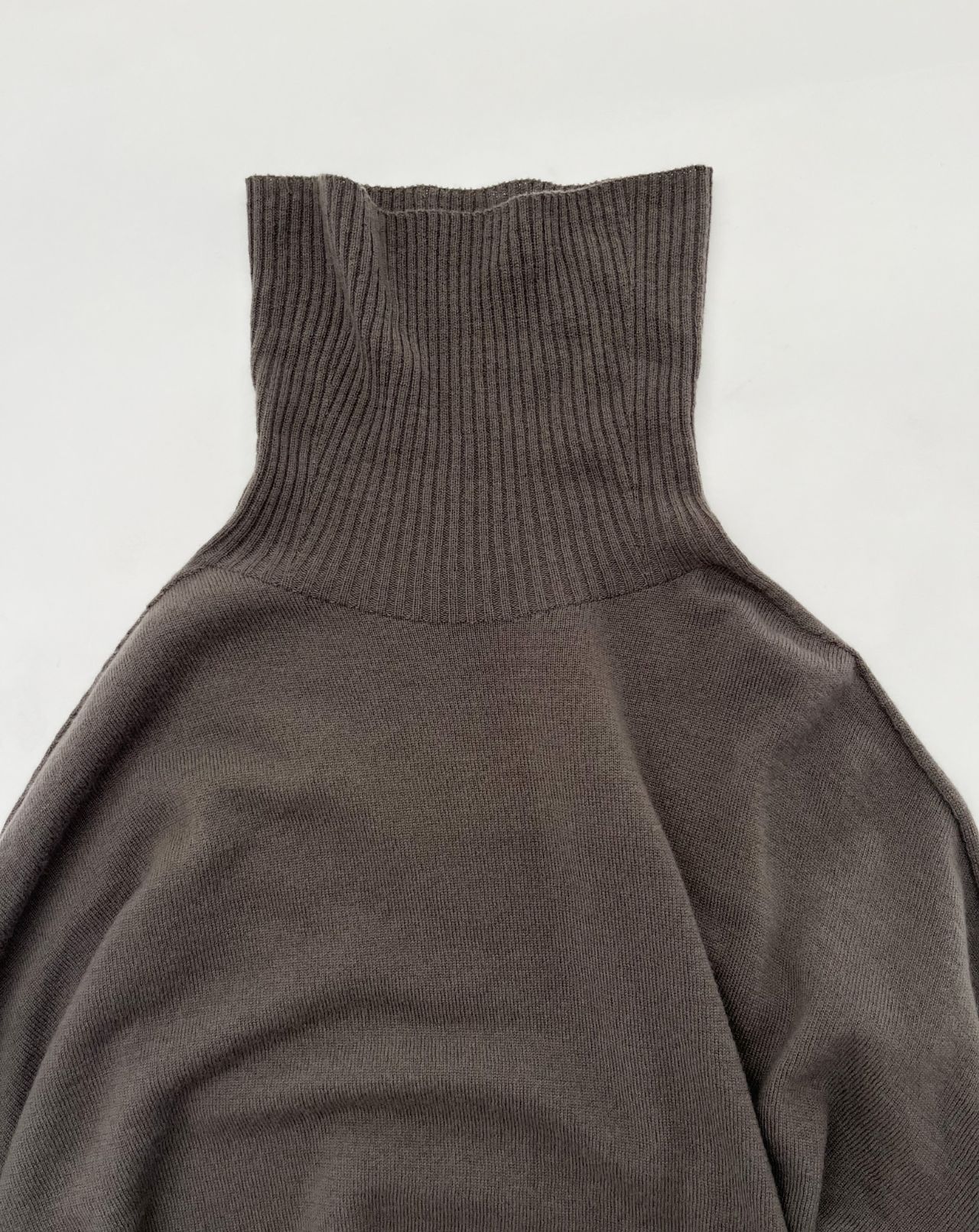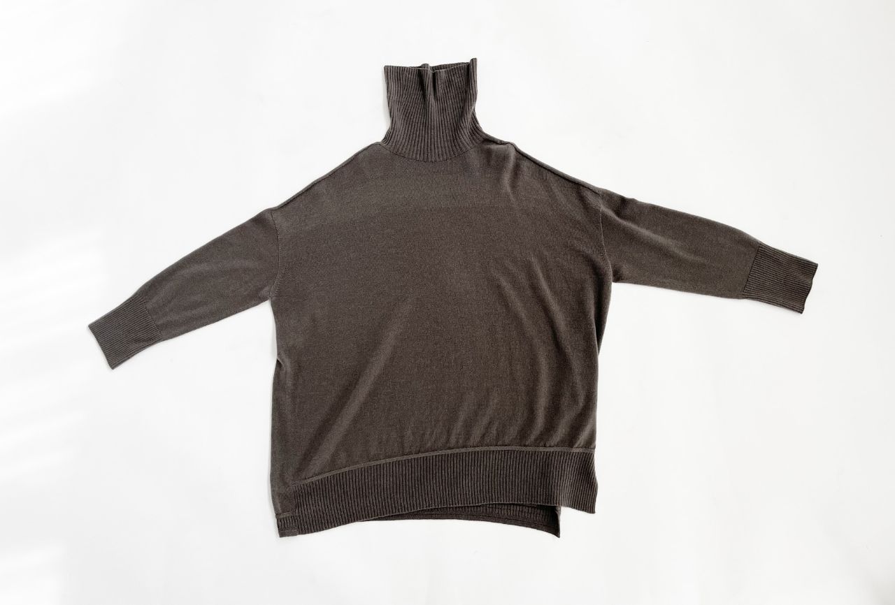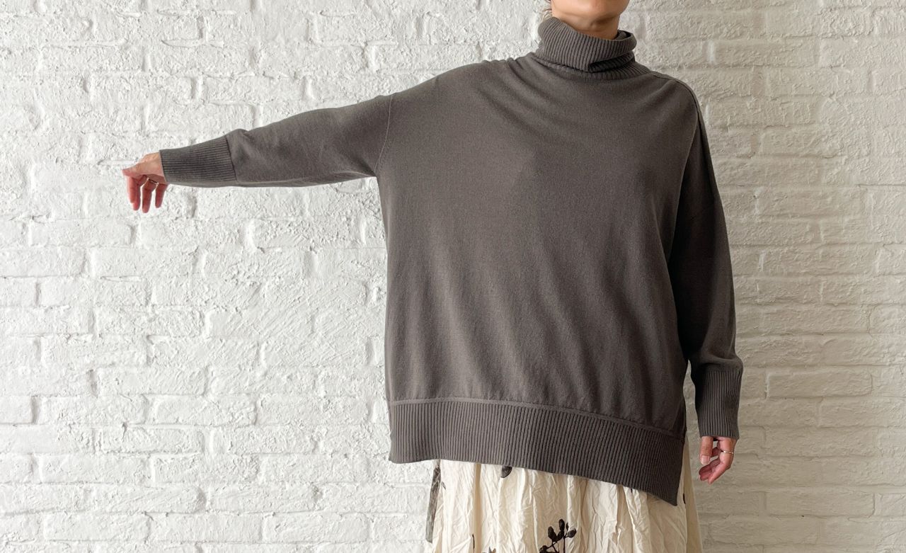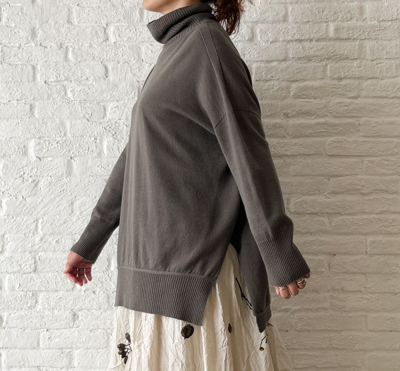 左サイドにのみ深めのスリットが入った、ゆったりしたタートルネック。