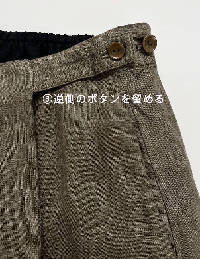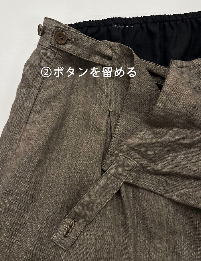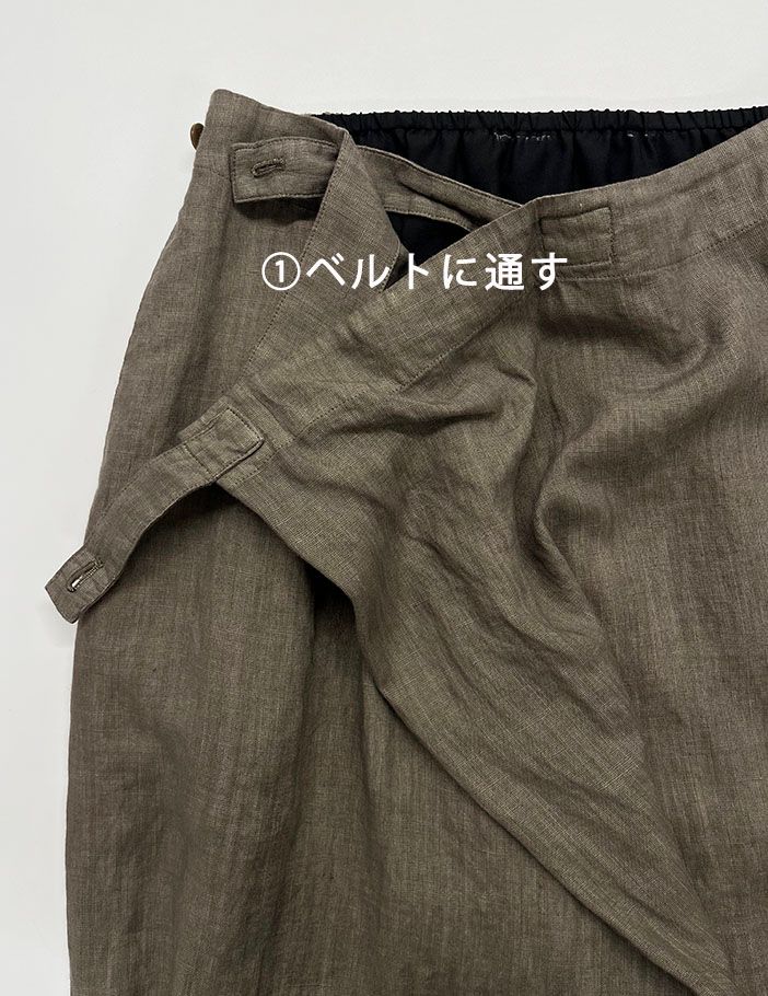 普通の巻きスカートのように長い長方形の布を巻き付けて留めて履くものではなく、大きな筒をパタンと折って履くイメージです。