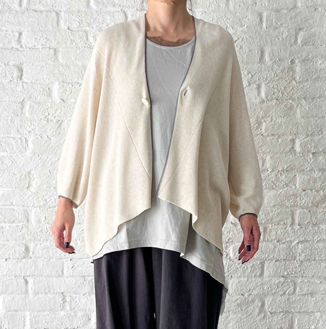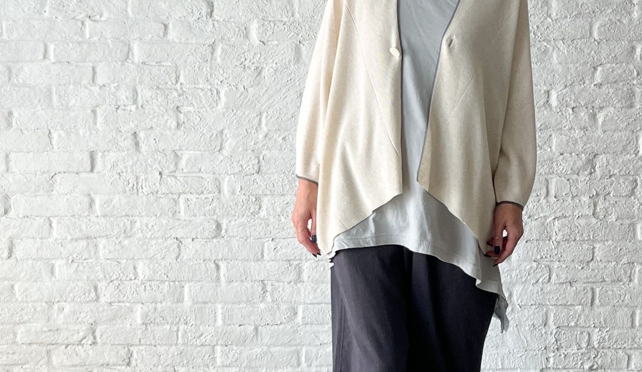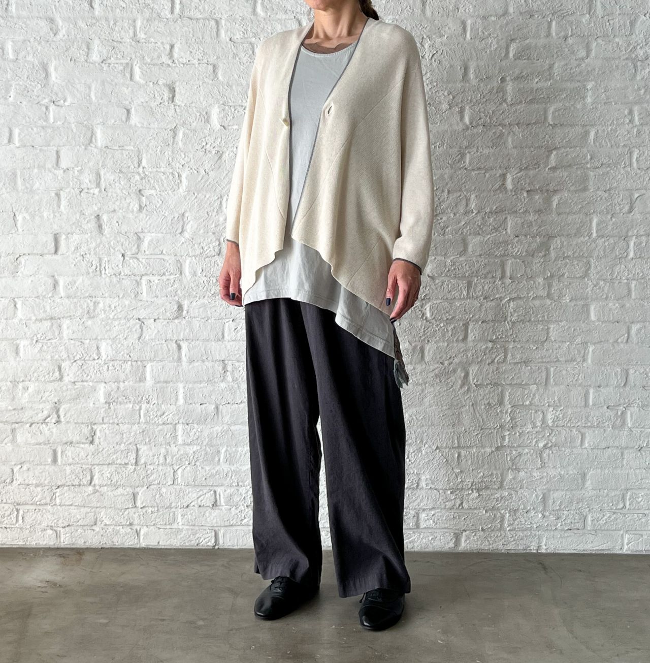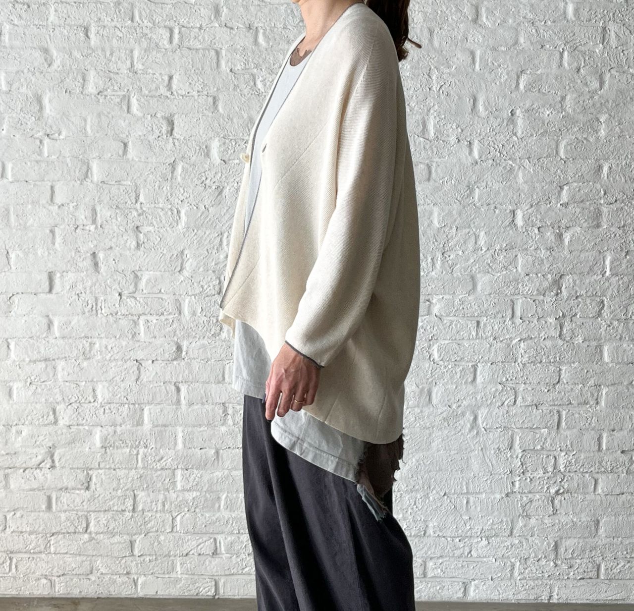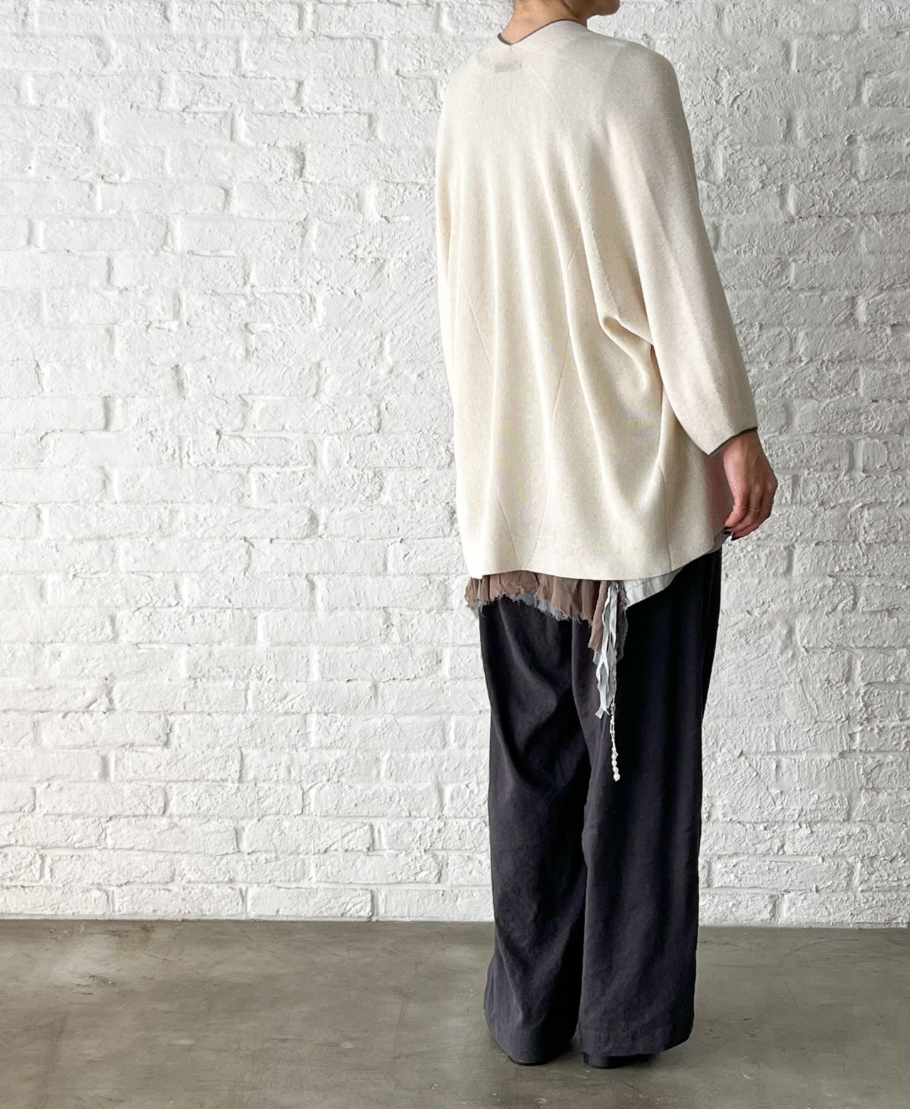 ニットカーディガンから後ろ裾をのぞかせた着こなし。