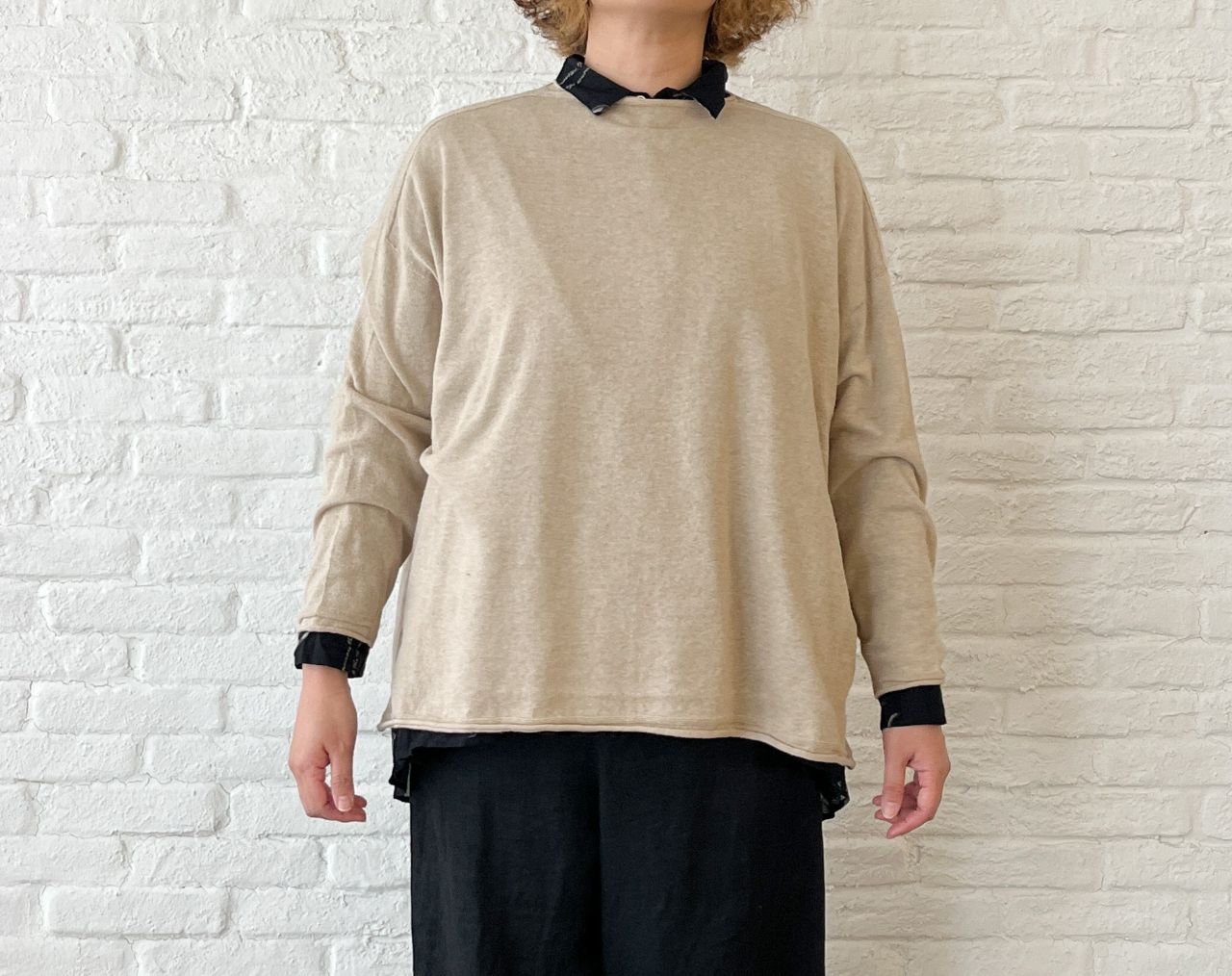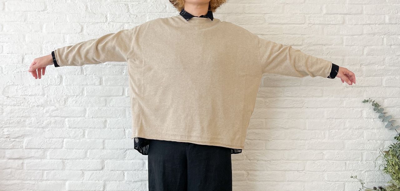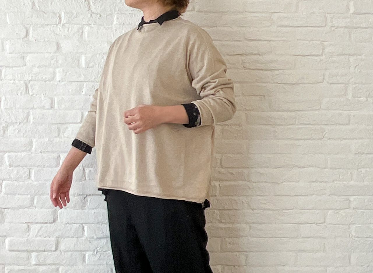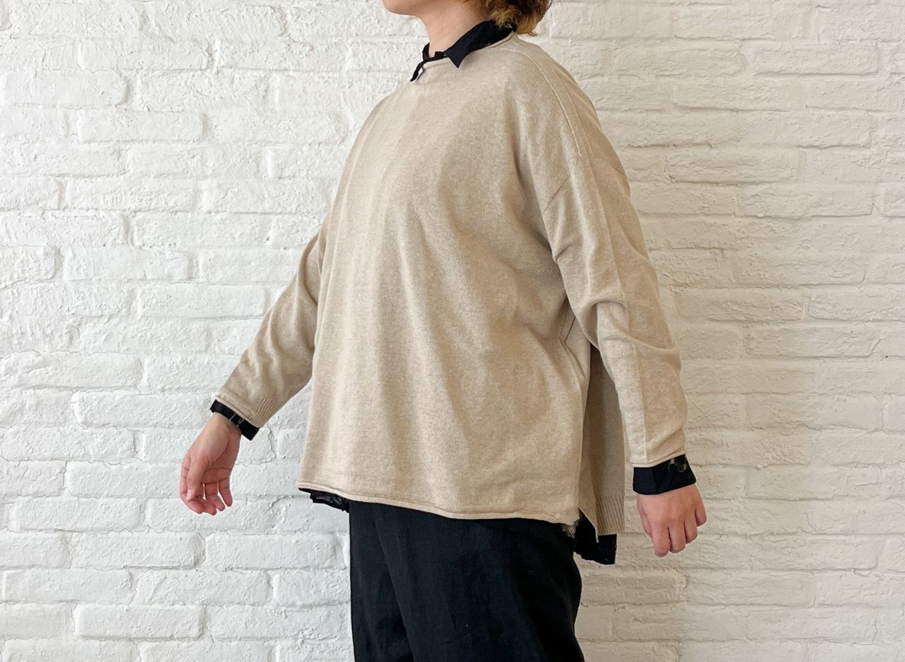 シンプルな丸首のニットプルオーバーですが、身幅をゆったりと大きめにとっています。