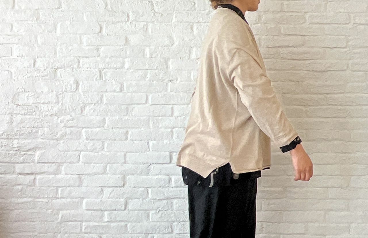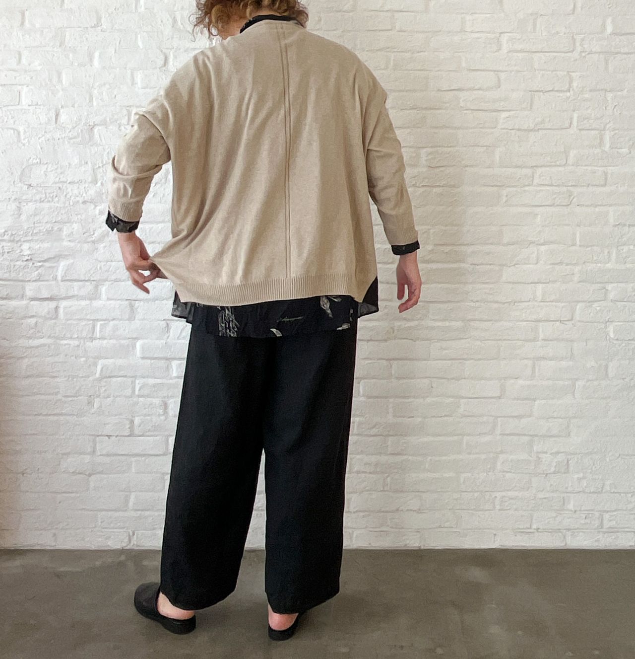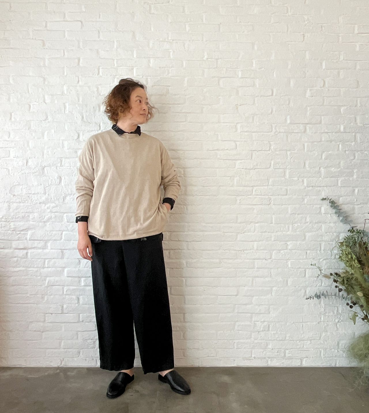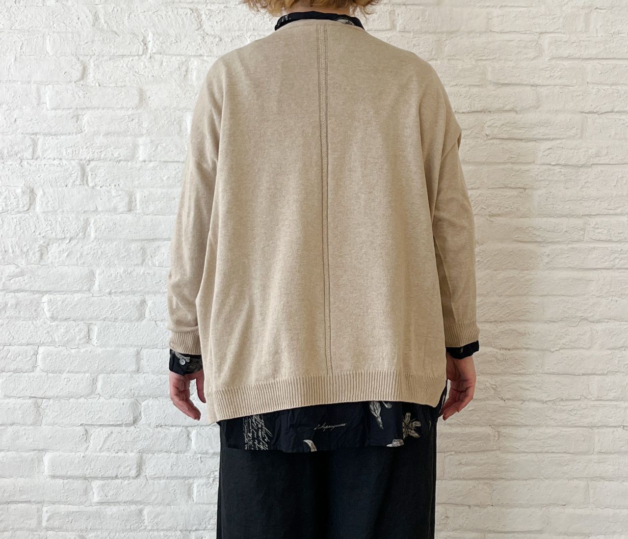 シンプルな丸首のニットプルオーバーですが、身幅をゆったりと大きめにとっています。
