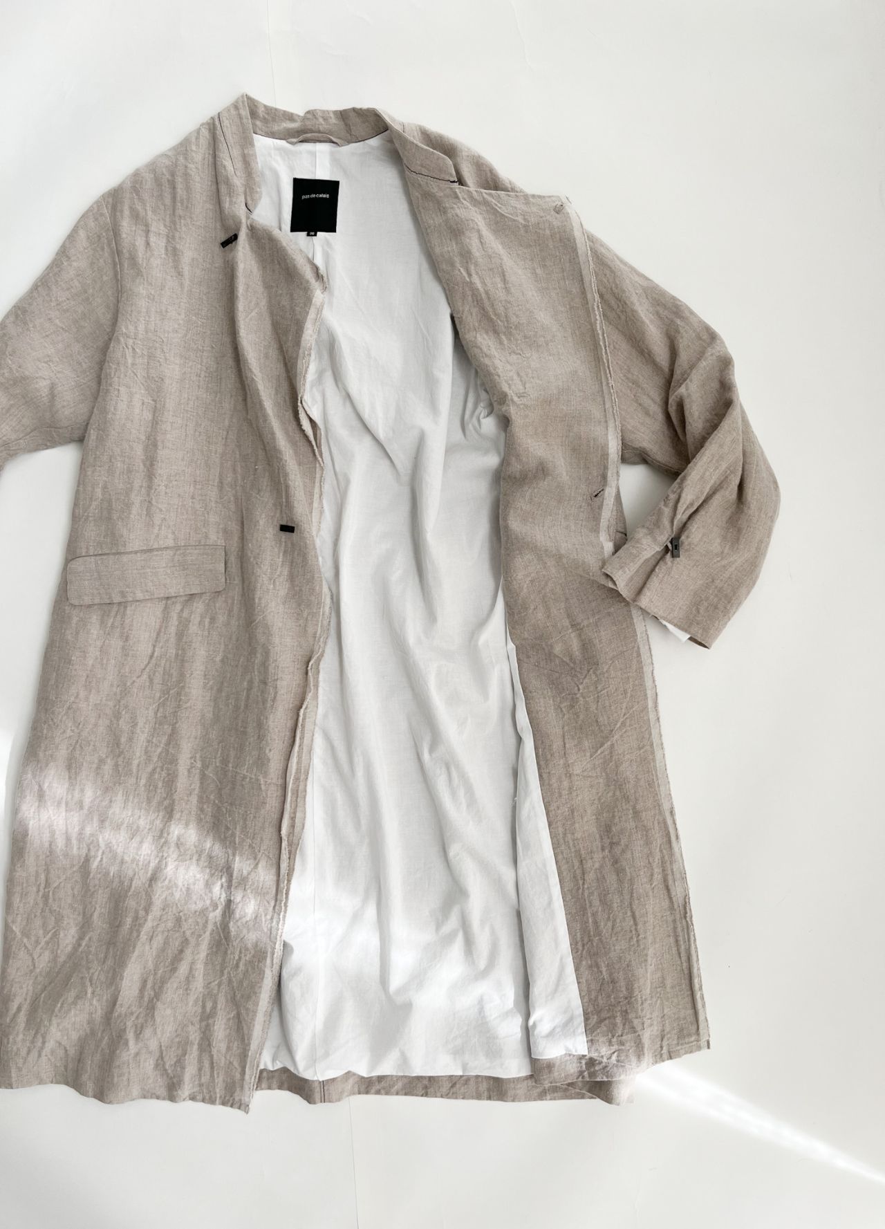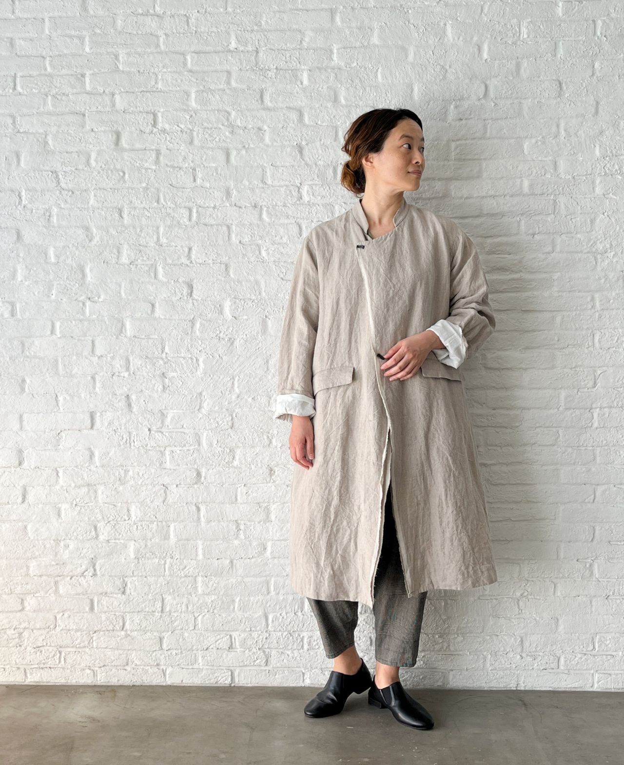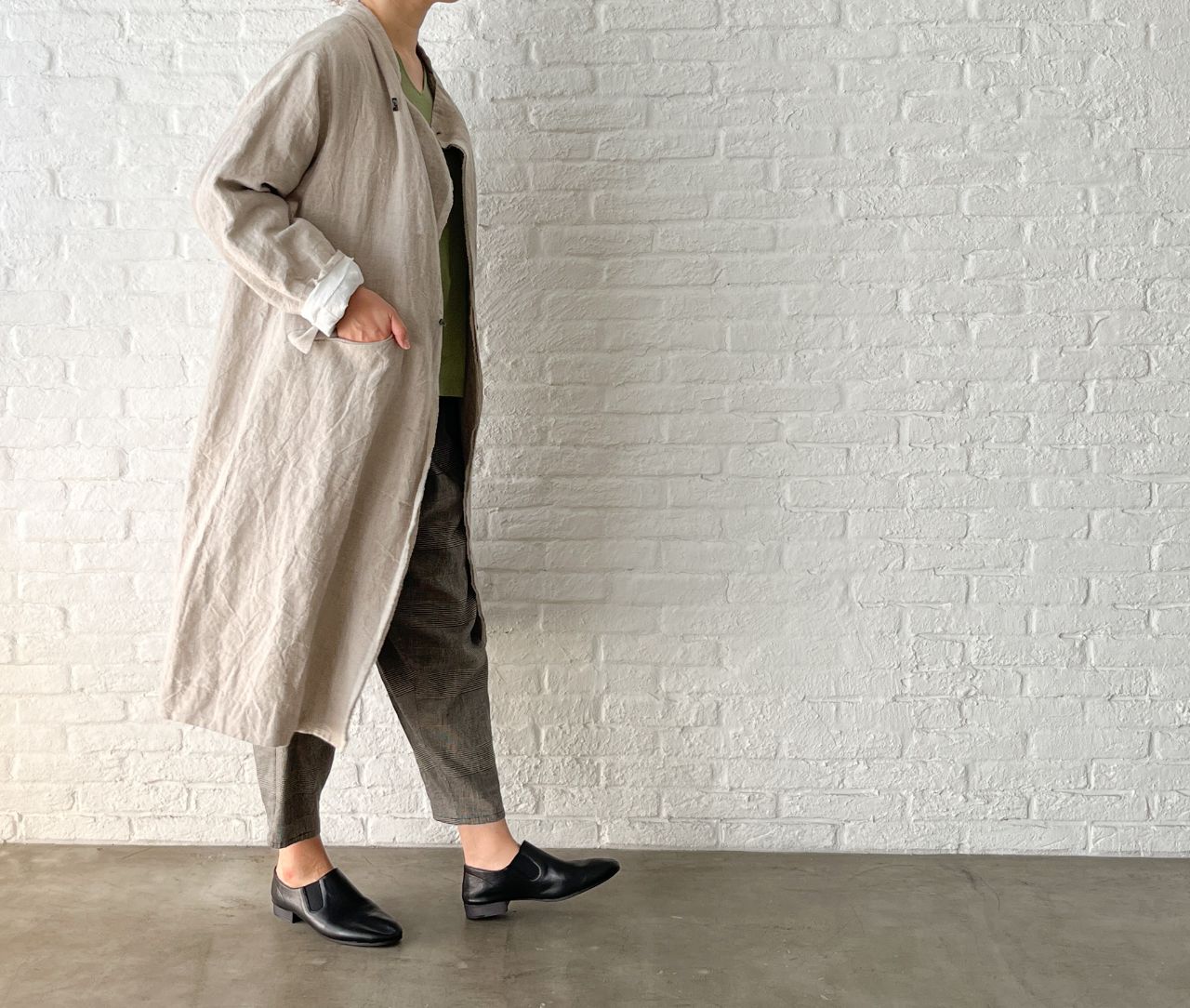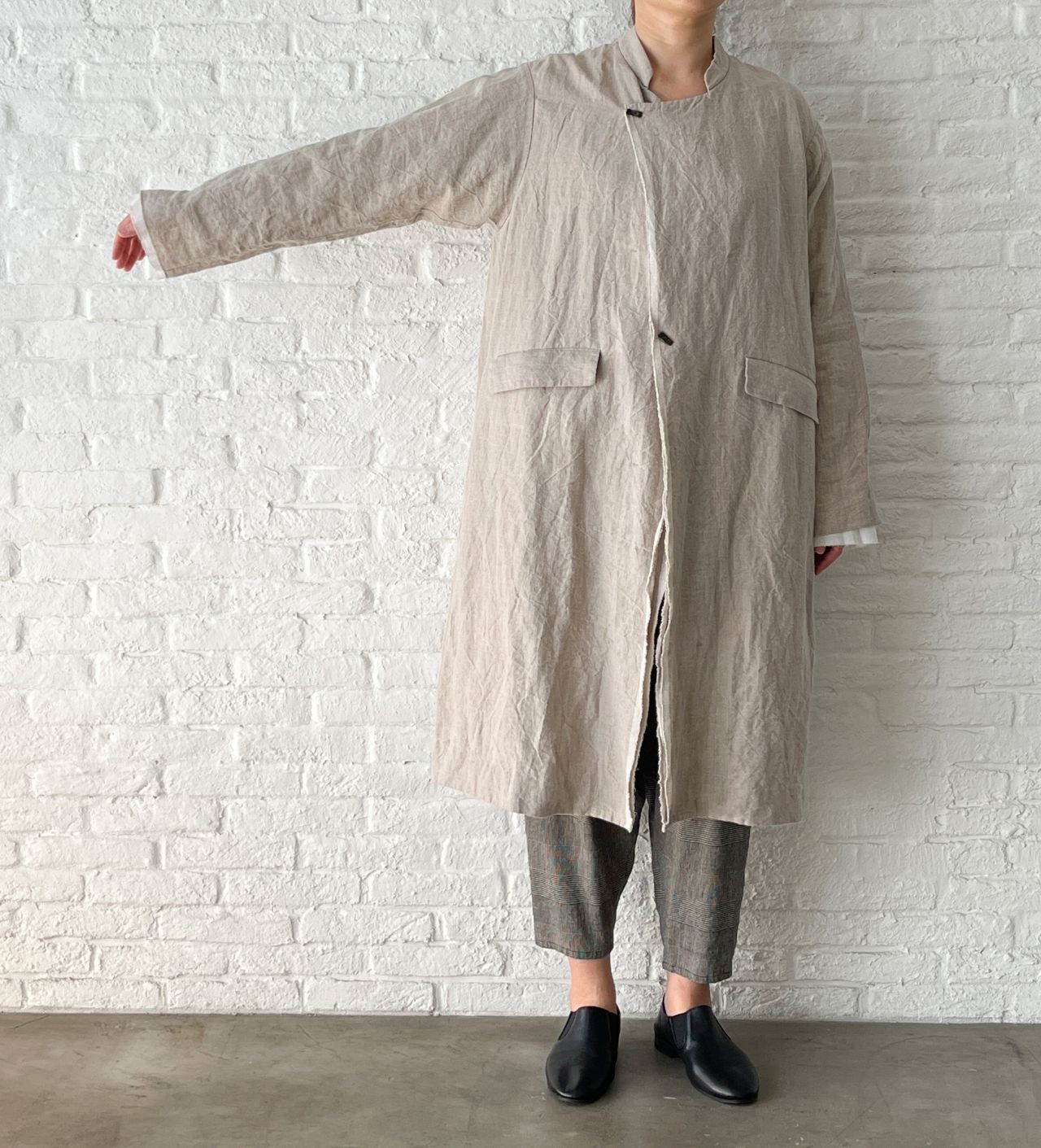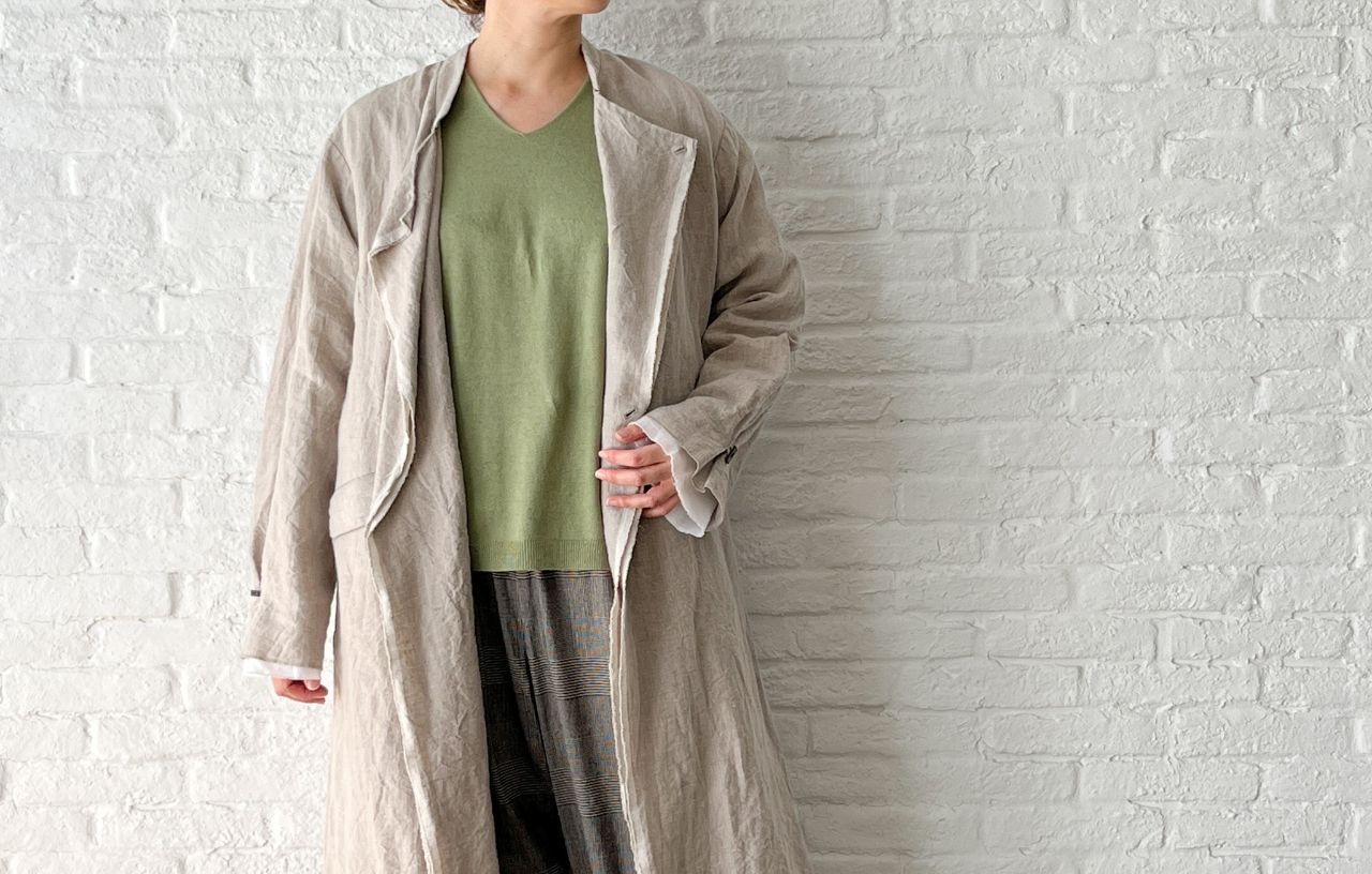 リネンの質感や、長方形の釦もナチュラルな印象です。