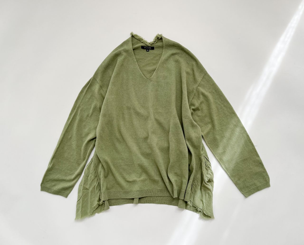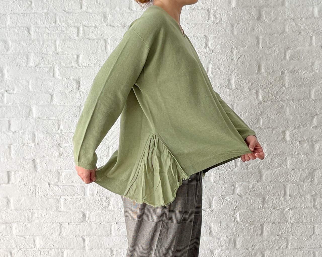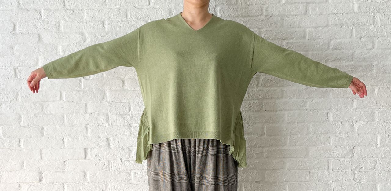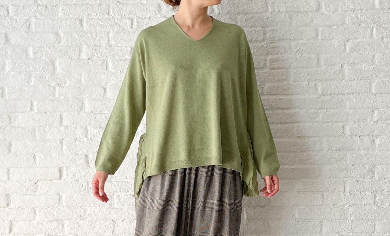 Vネックのニットに、後ろ襟ぐりやサイドに別布をポイントにしたデザインニット。