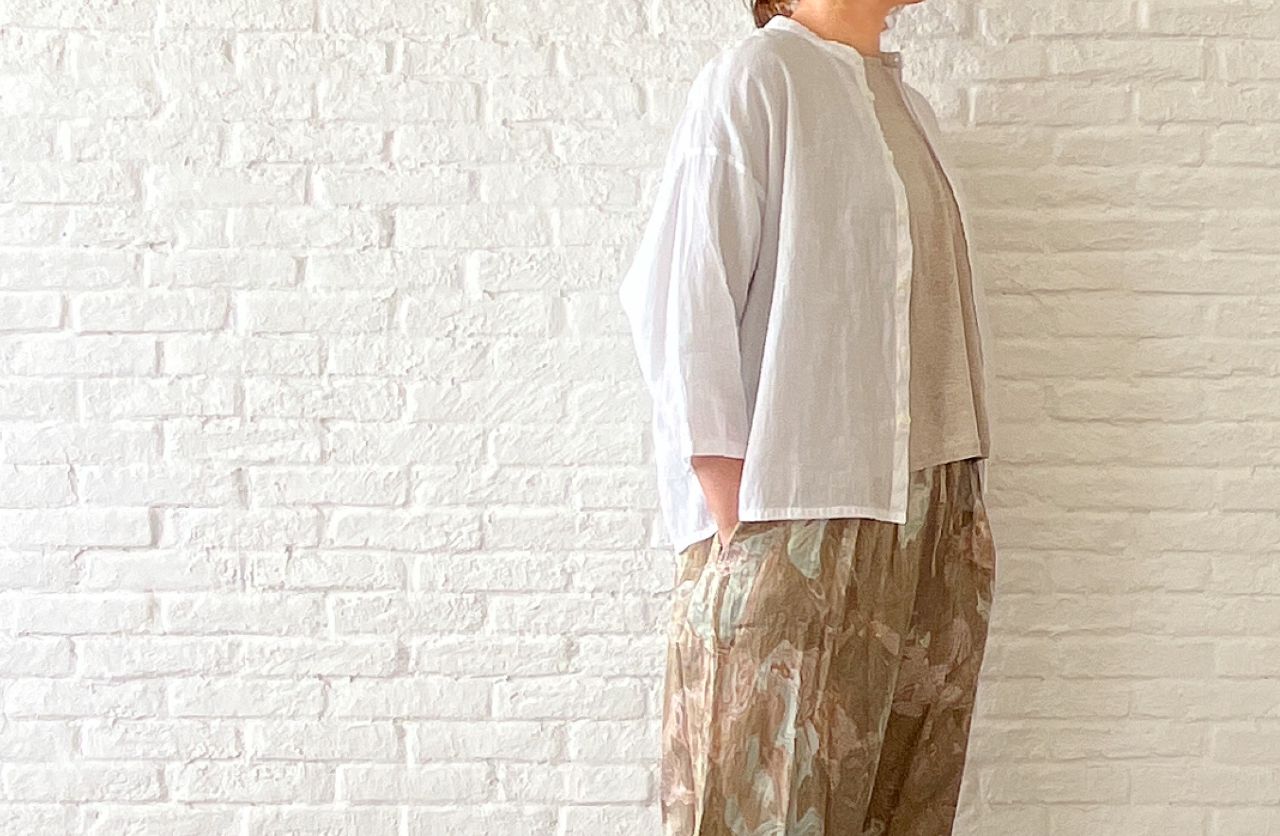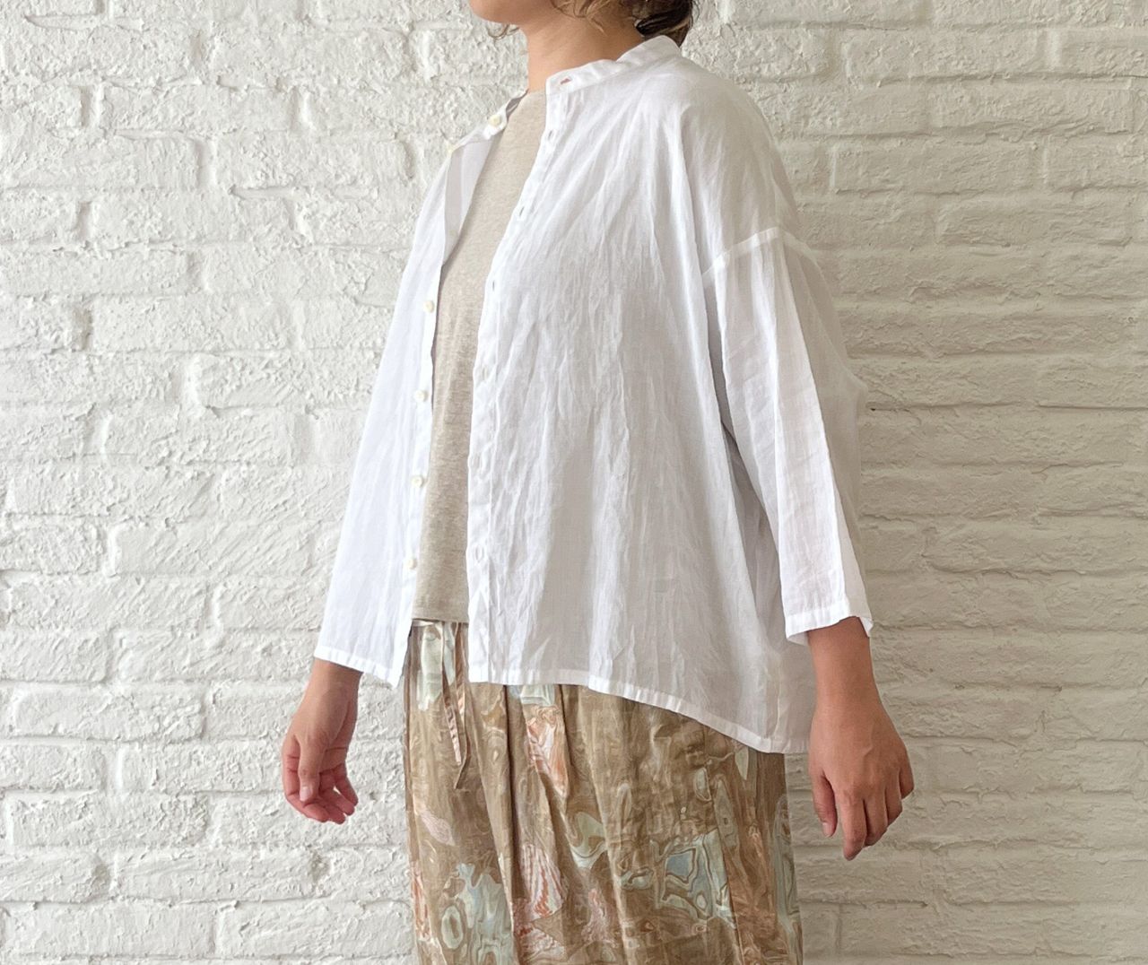 前を閉めたブラウススタイルでも合いますが、羽織としてもお使いいただけます。