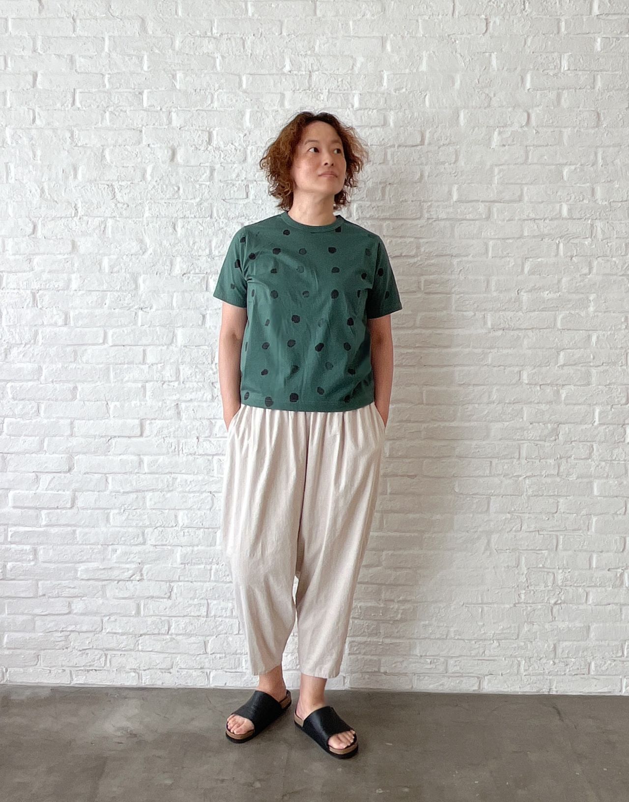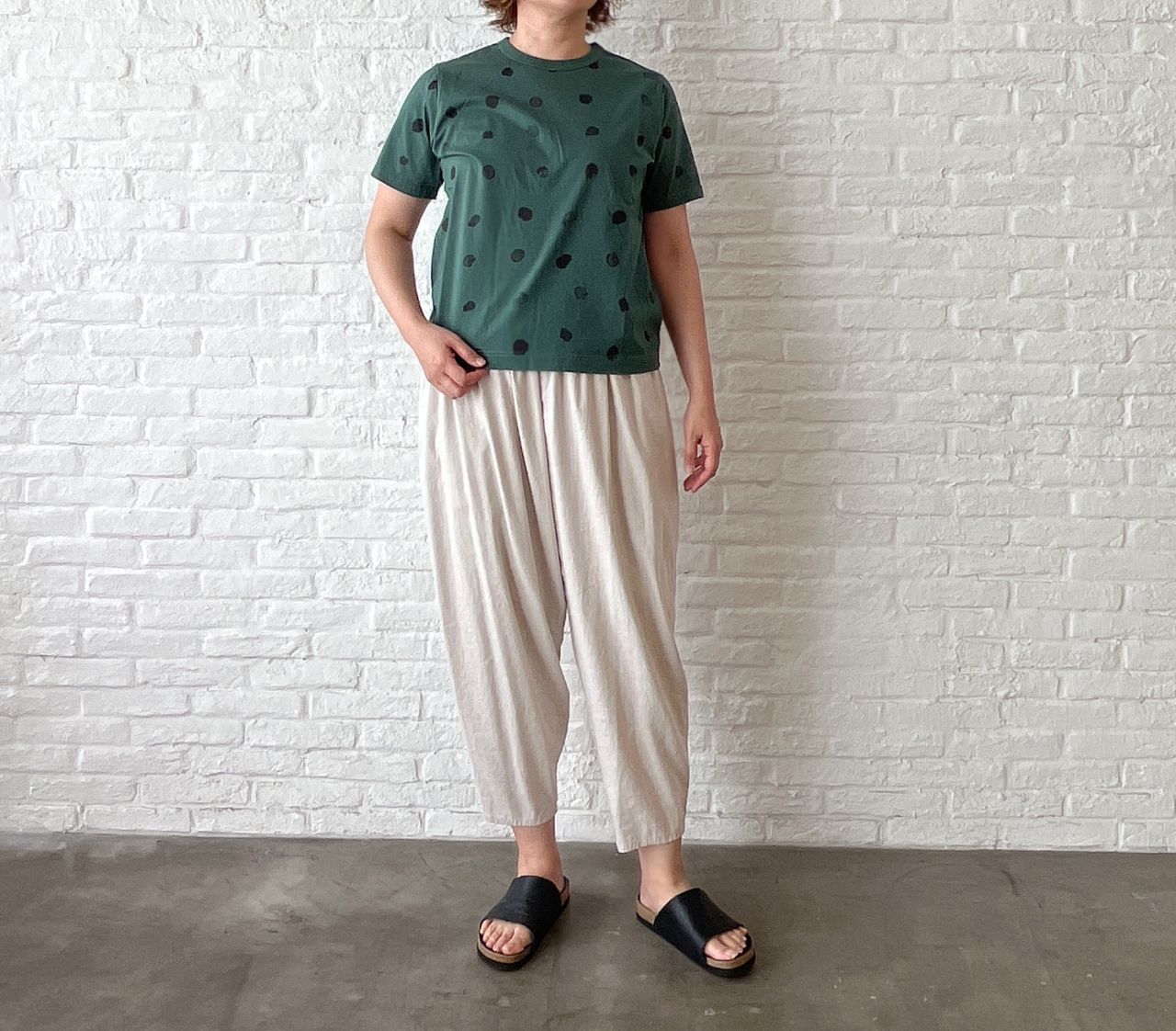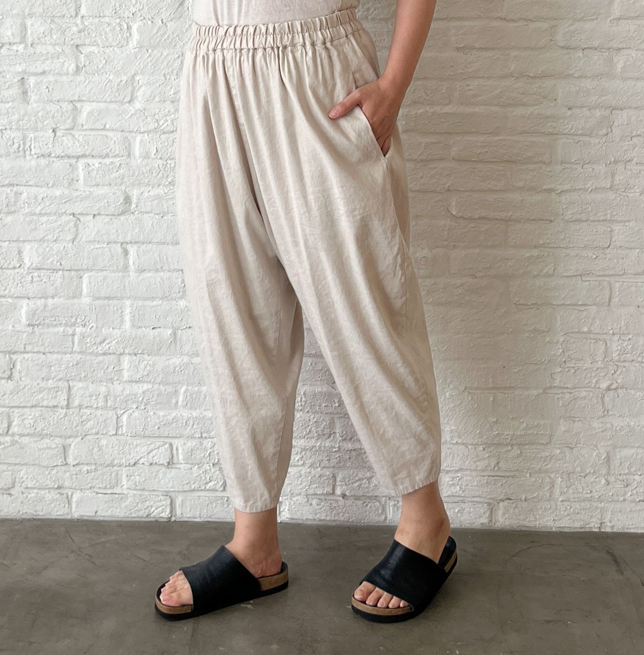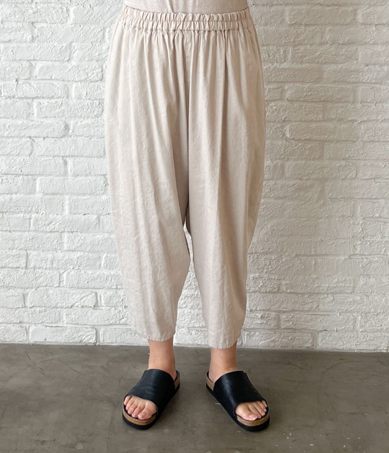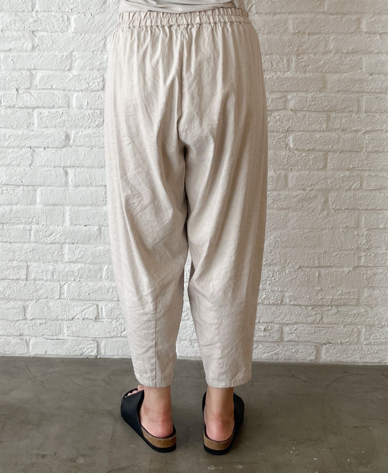 腰周りはゆったり、裾に向かって細くなるテーパードシルエット。