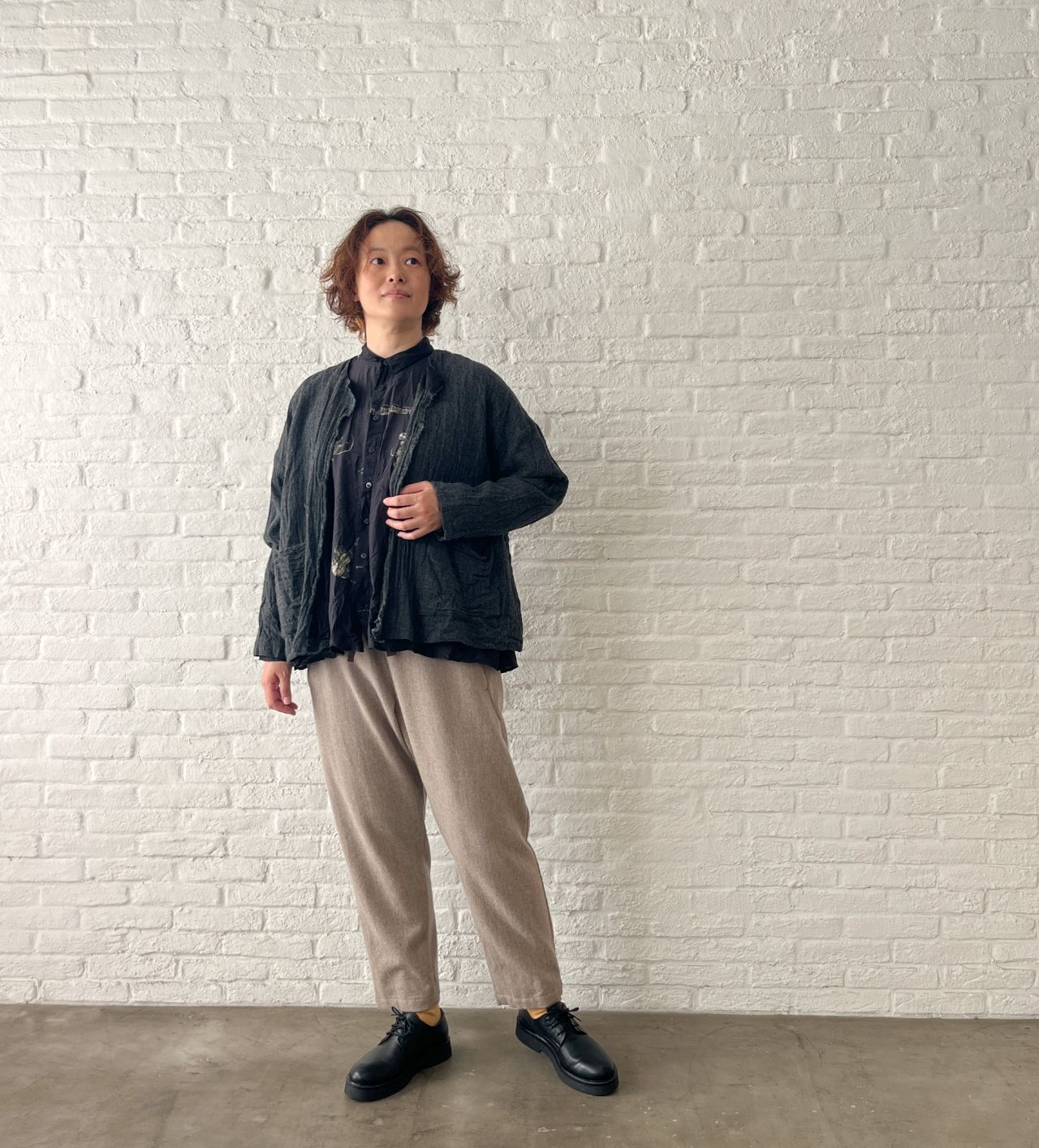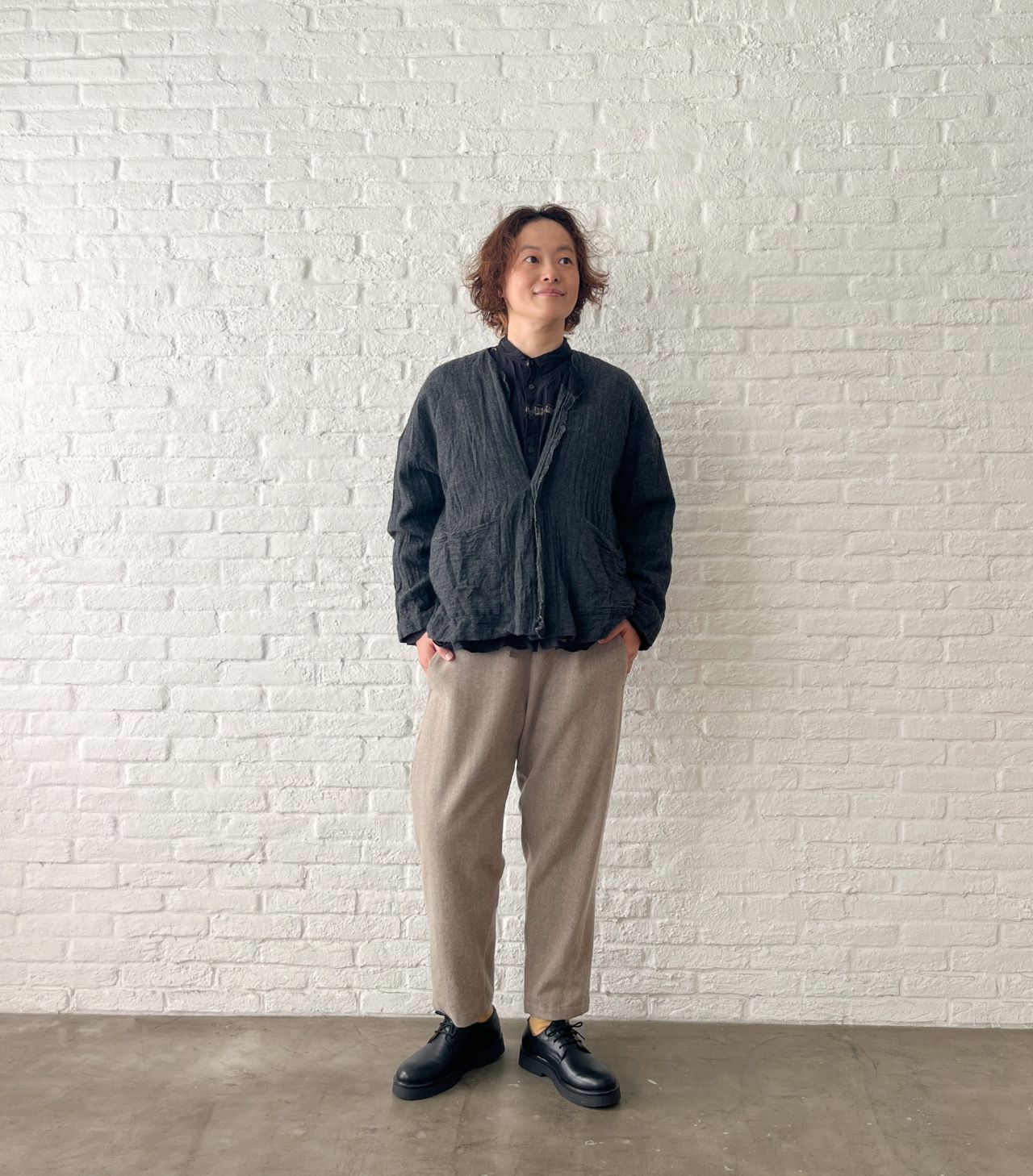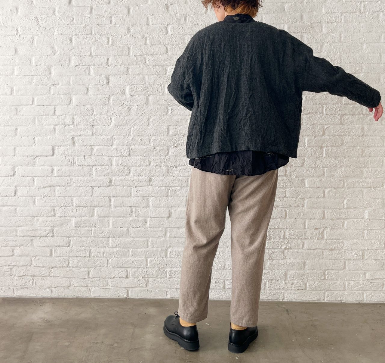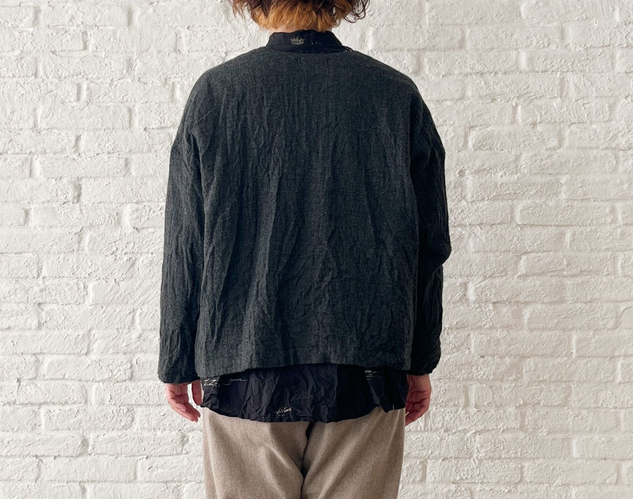 ふんわりしたウールのジャケットに、しわを入れて表情をだしました。