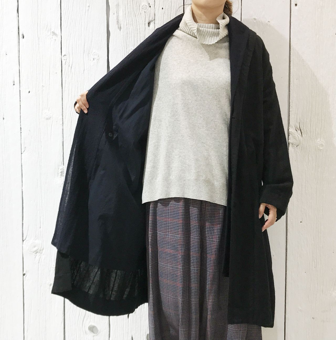 ライナーとの2枚重ねで、衿元からでているネイビー部分がライナー。