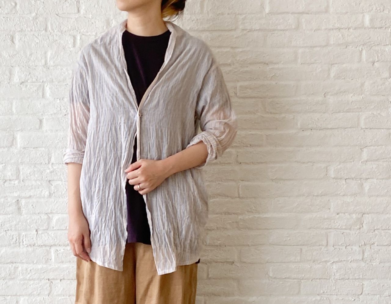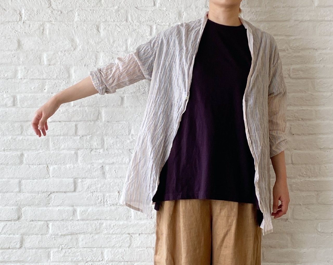 中に着たTシャツが透けるほど薄手の生地を使用した、羽織ブラウス。