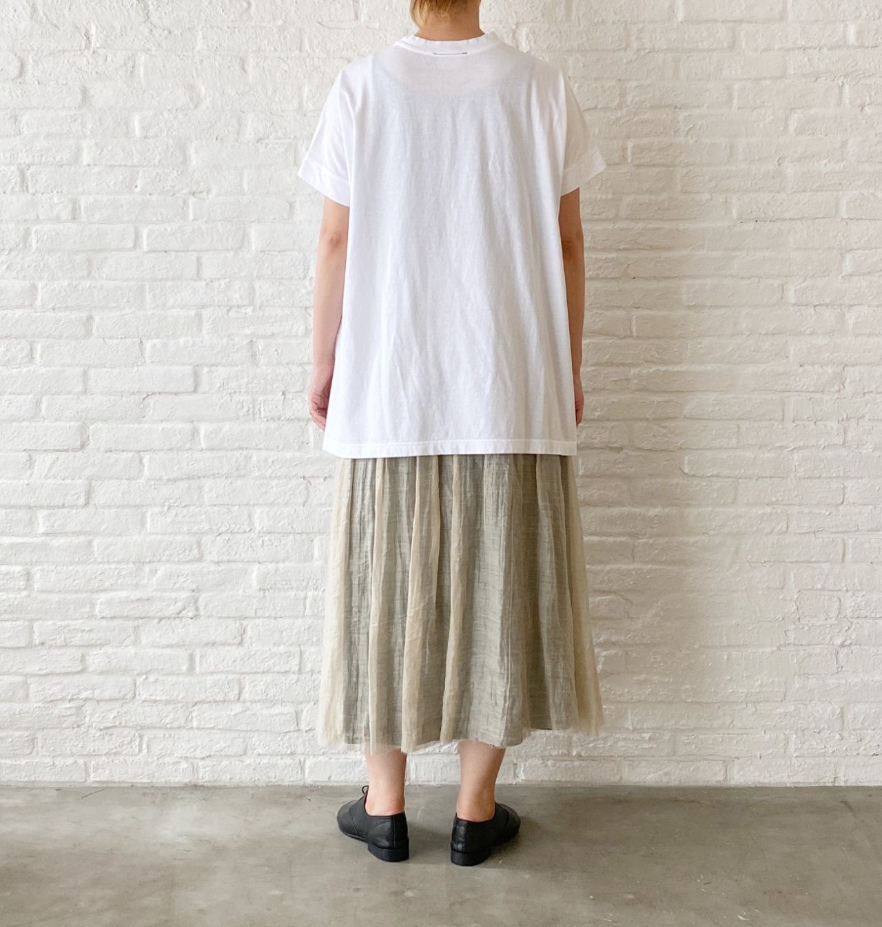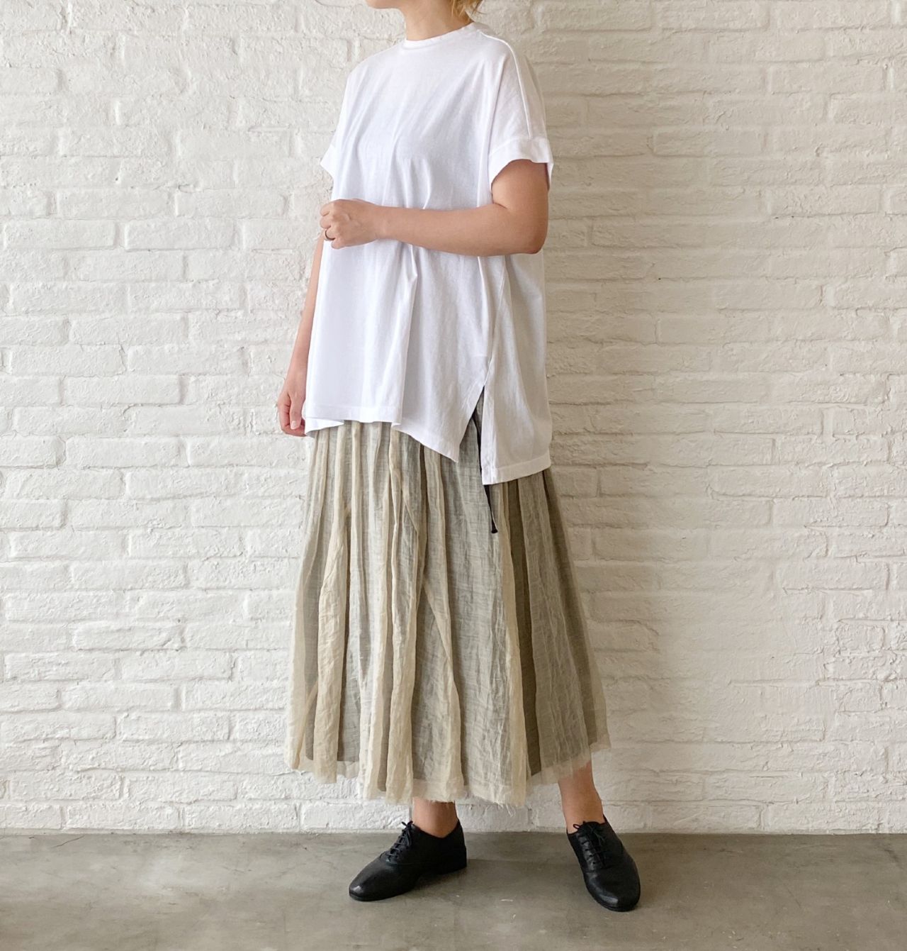 白Tには素材に変化をつけて、オーガンジーのロングスカートと。