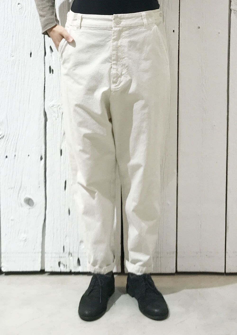腰周りがゆったりして、やや裾がつぼまるシルエットです。