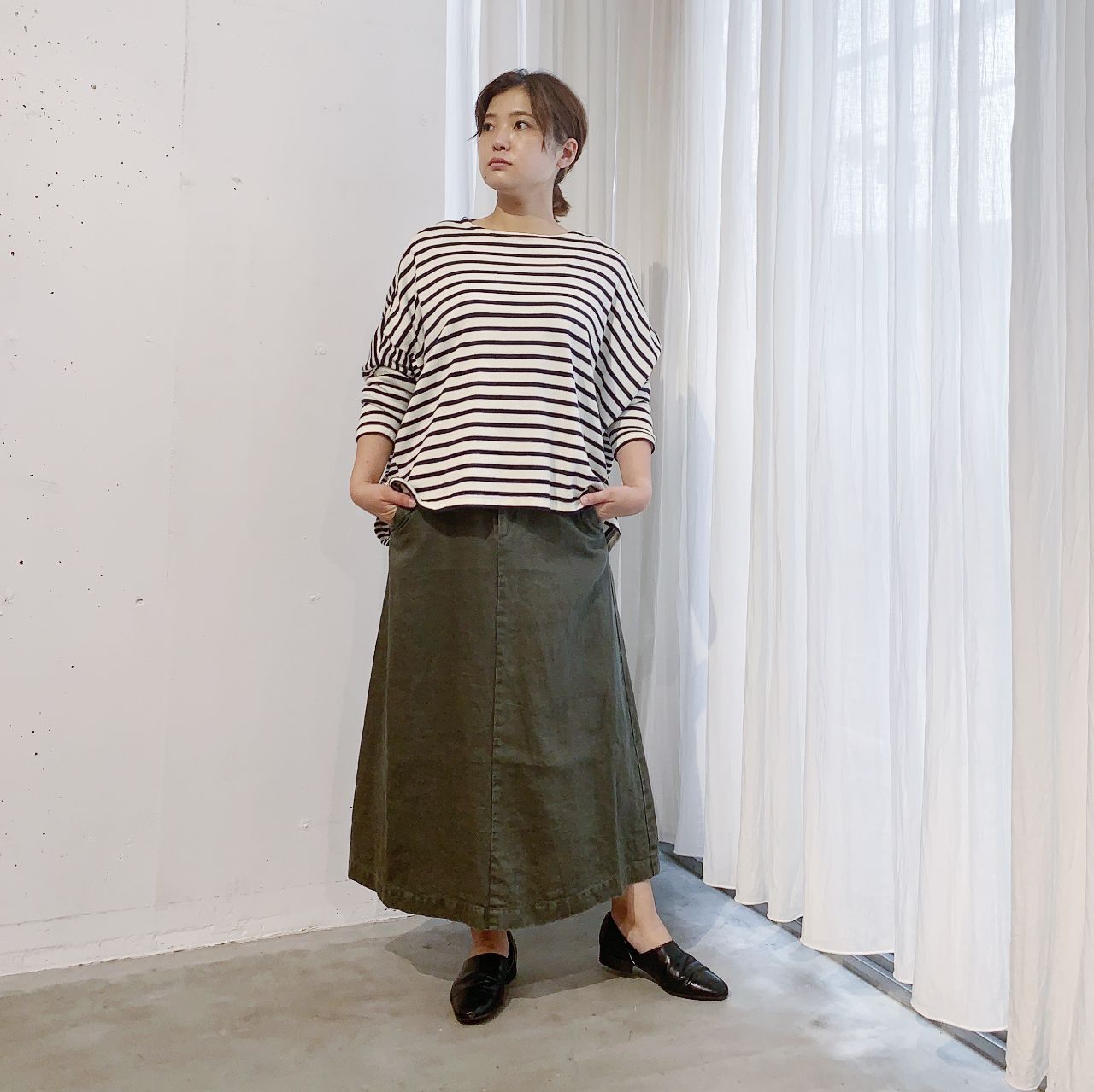 スカートでも合わせたボーダートップスを合わせました。