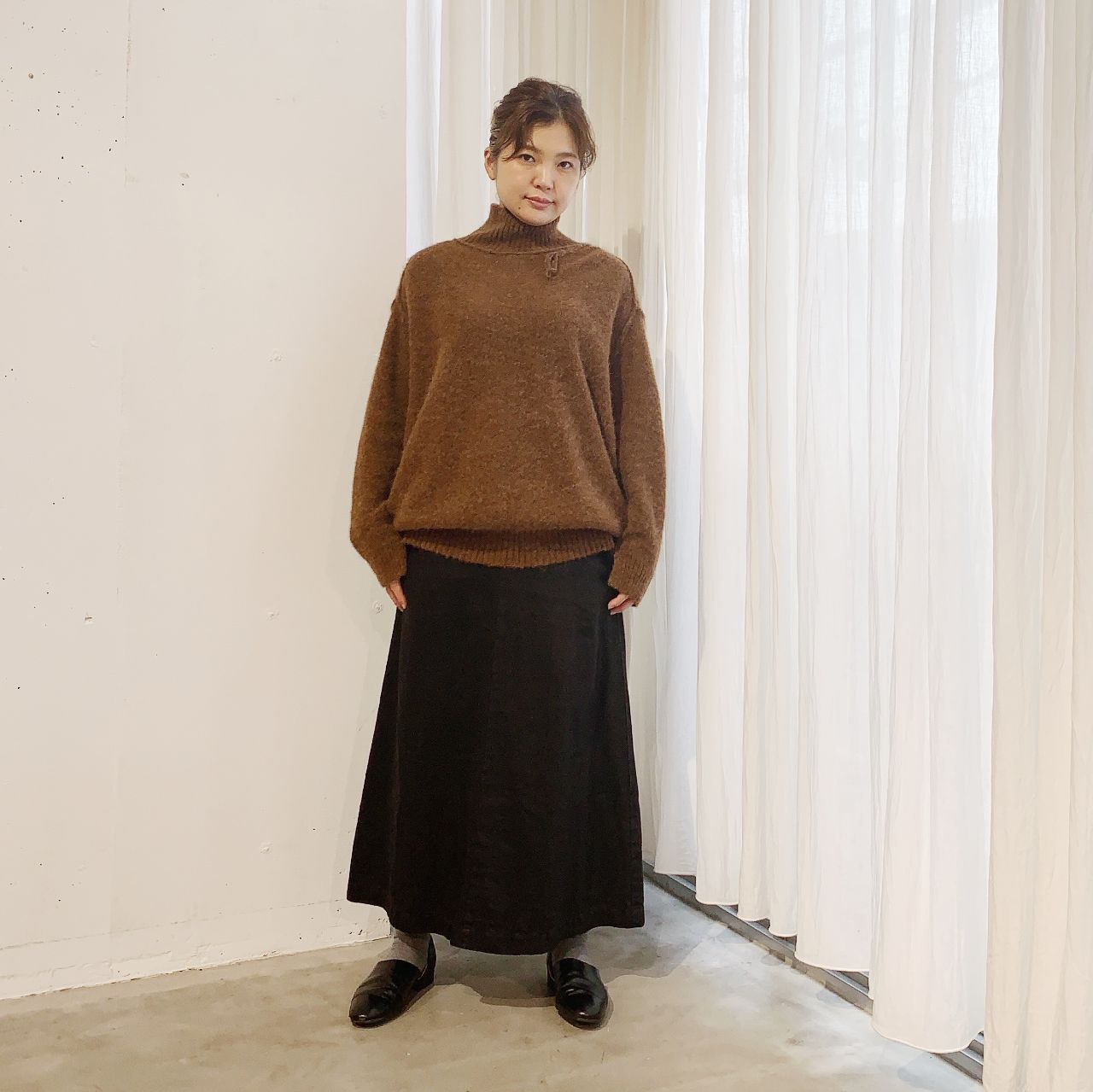 来月入荷予定のベビーアルパカのニットと合わせてみました!