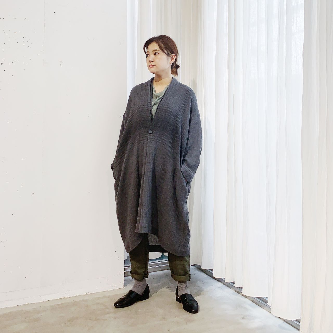 発売中のエアリーなウールコートを羽織りました。