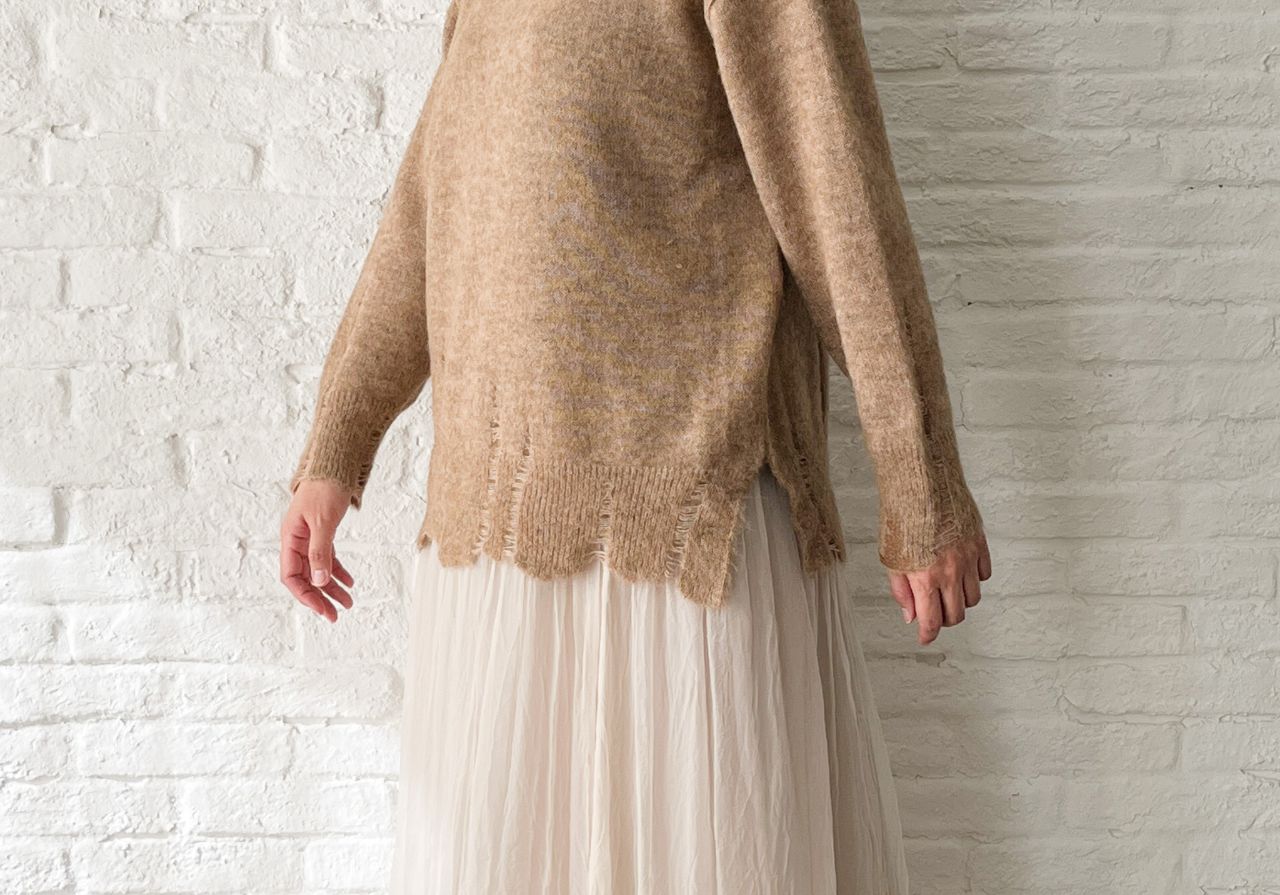 ニットにダメージを入れた、パドカレらしいデザイン性あるアイテム。