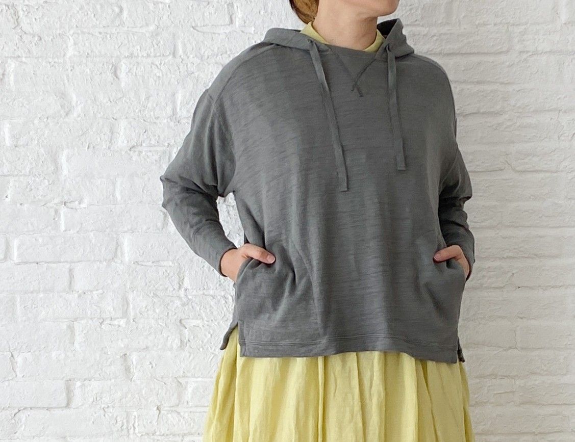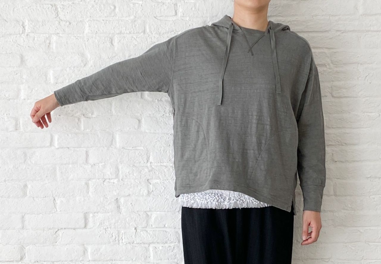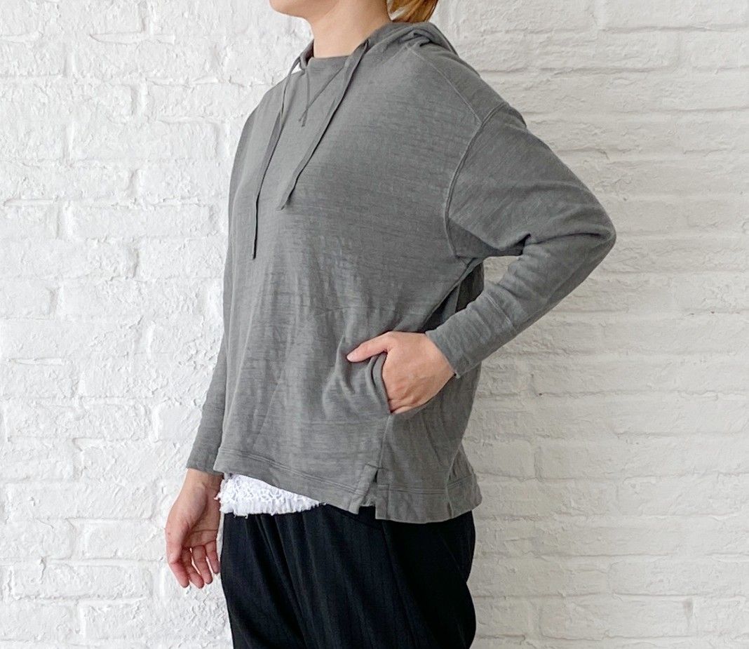 ゆったりした身頃に、細めの袖、小さなスリットなど小技がきいたパーカーです。