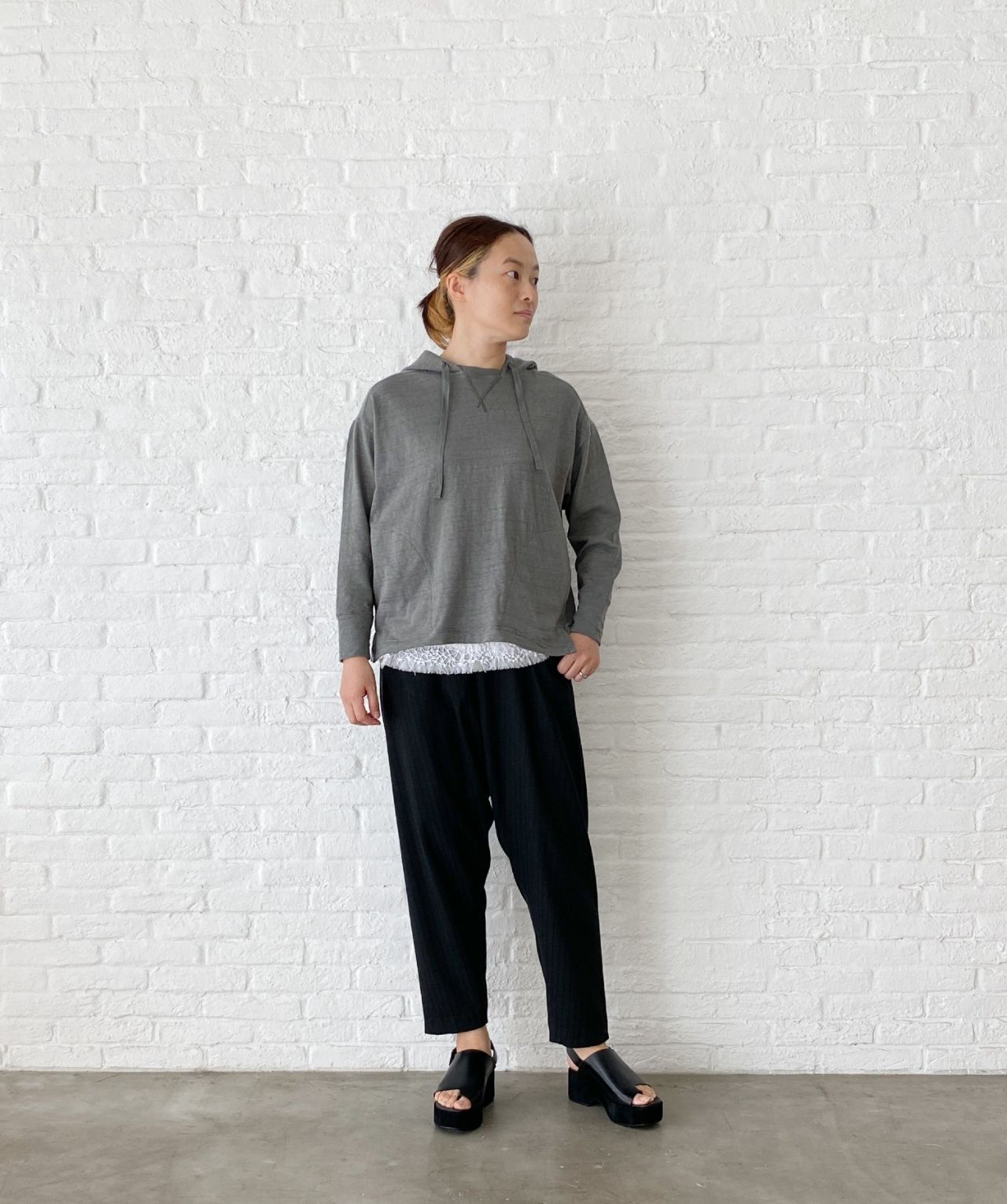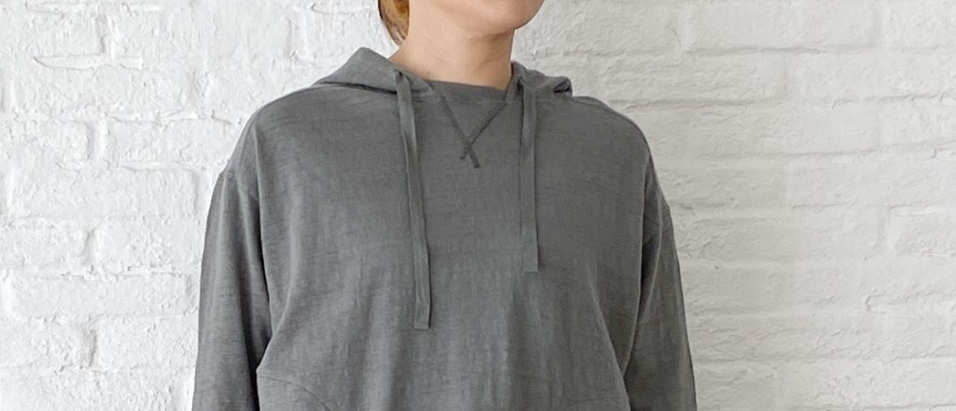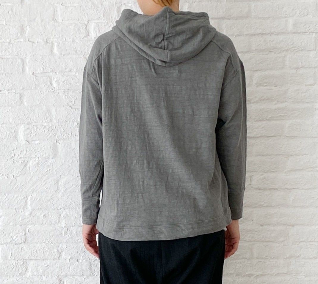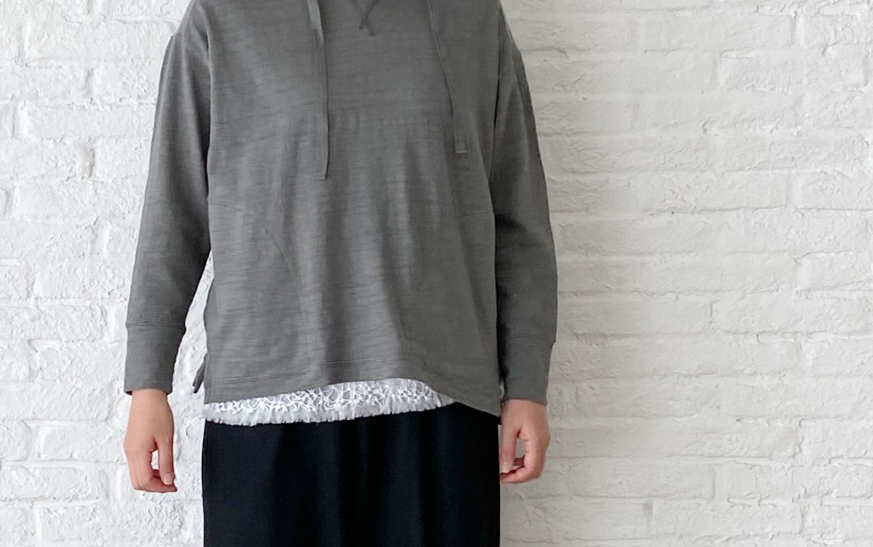 ゆったりした身頃に、細めの袖、小さなスリットなど小技がきいたパーカーです。