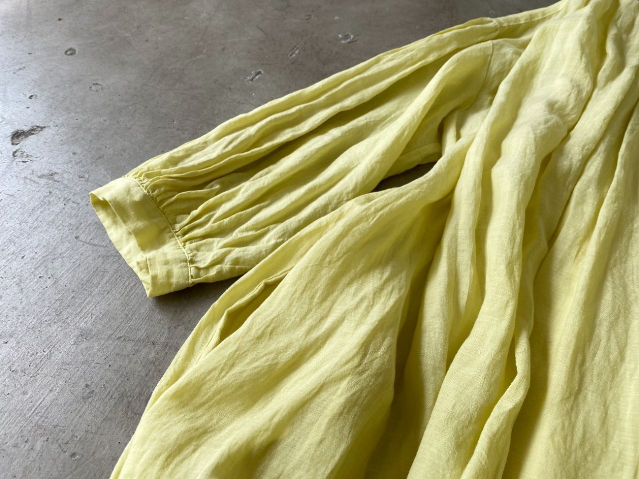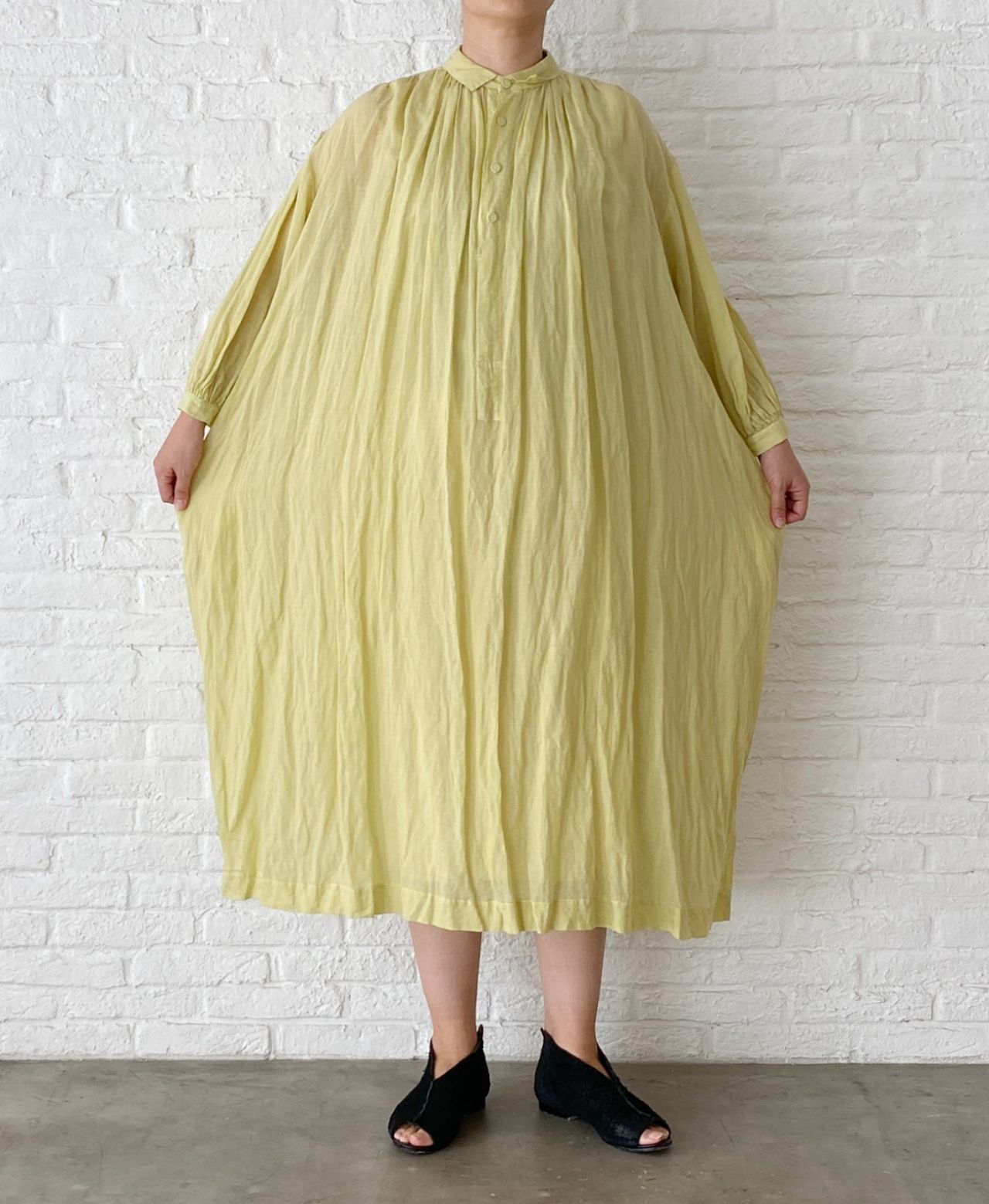 前後でも袖にもギャザーが入って分量感あるワンピースですが、薄手なので着心地は軽いです。