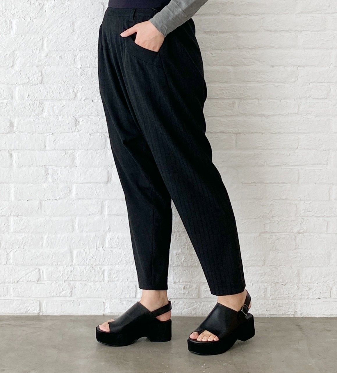 うっすらとストライプ柄が入ったテーパードパンツと合わせて、カジュアルすぎないように。