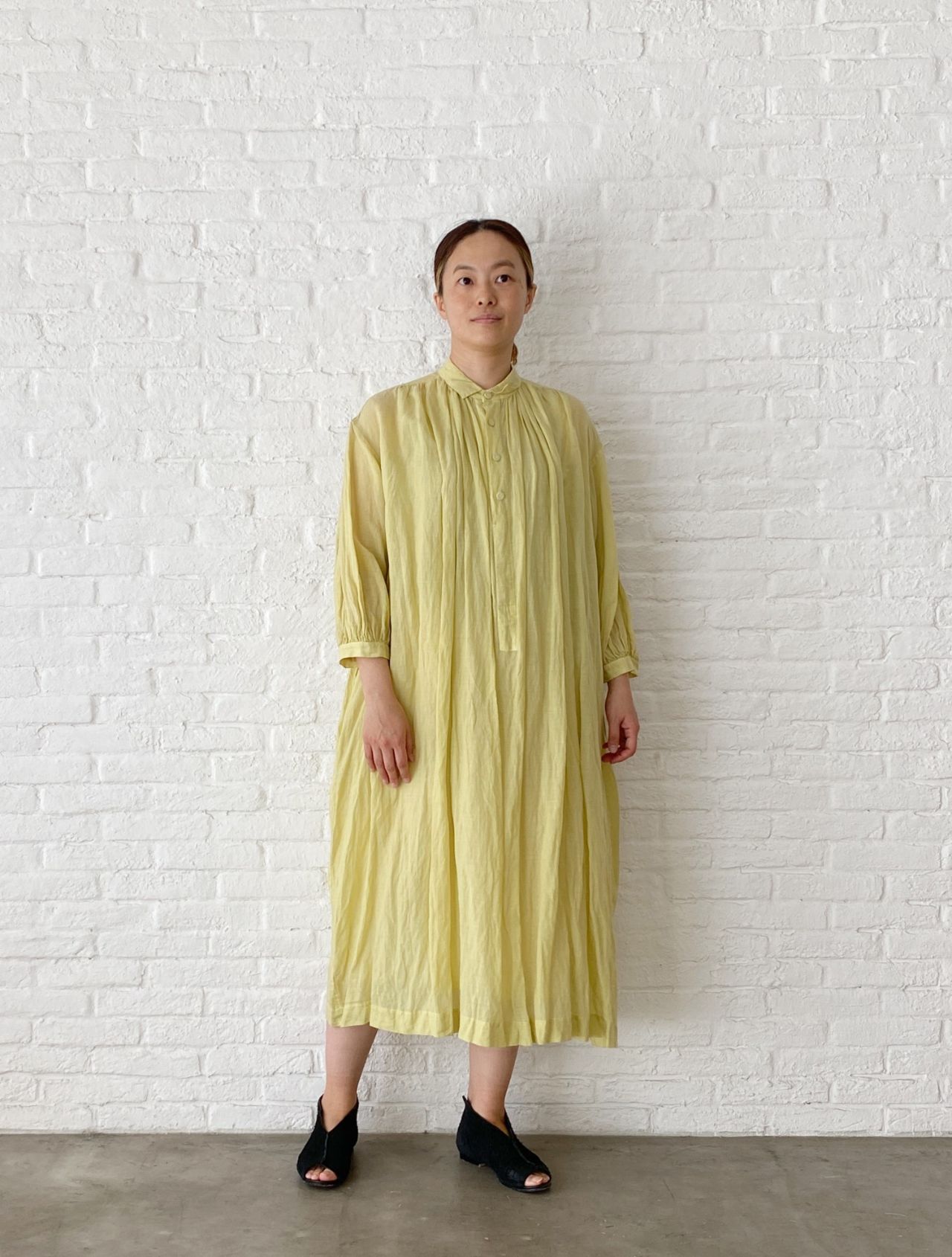 イエローのワンピースは、 オリーブの枝葉を染料として使用した オリーブ染め。