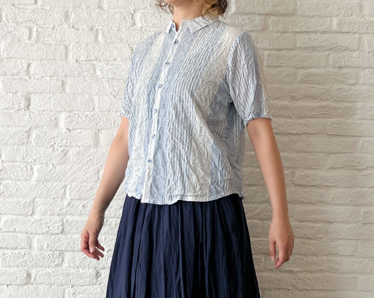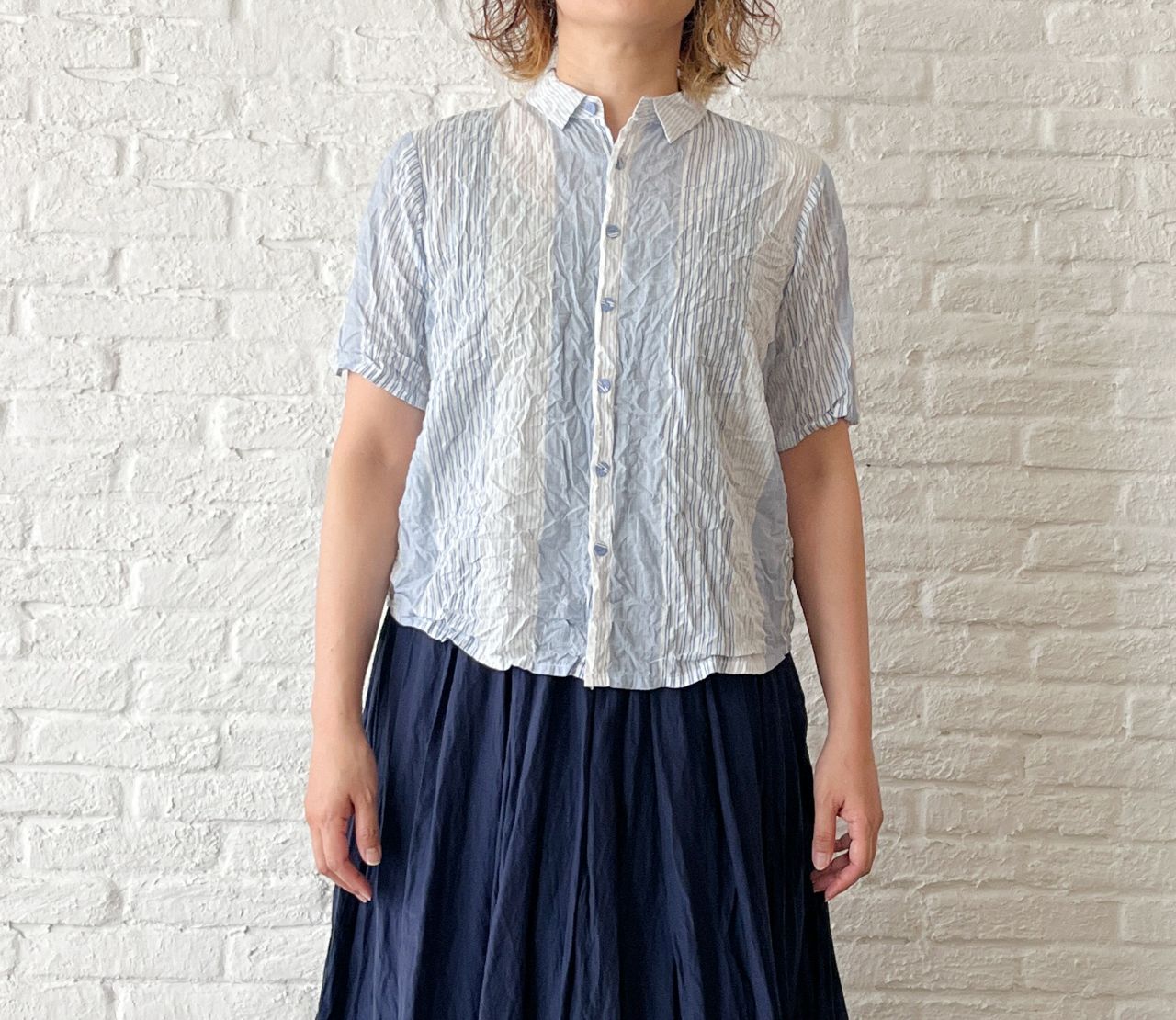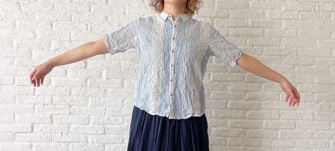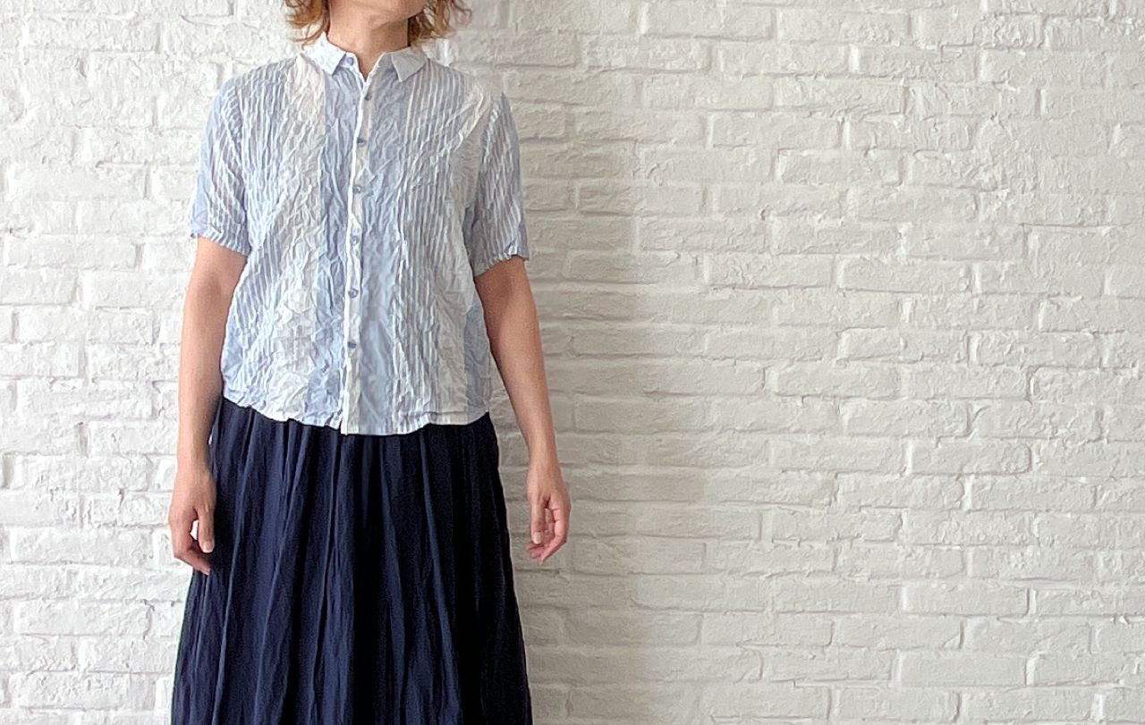 4月後半のおすすめ・ブルーシャーリングストライプ ブラウスのご紹介です。