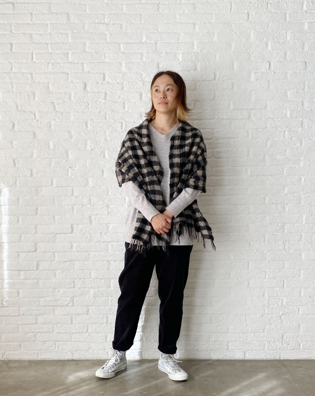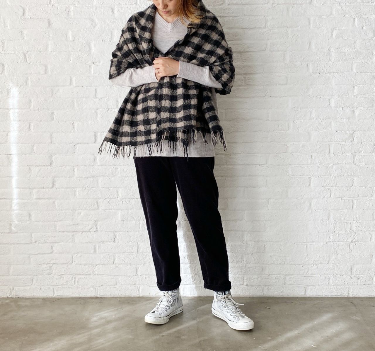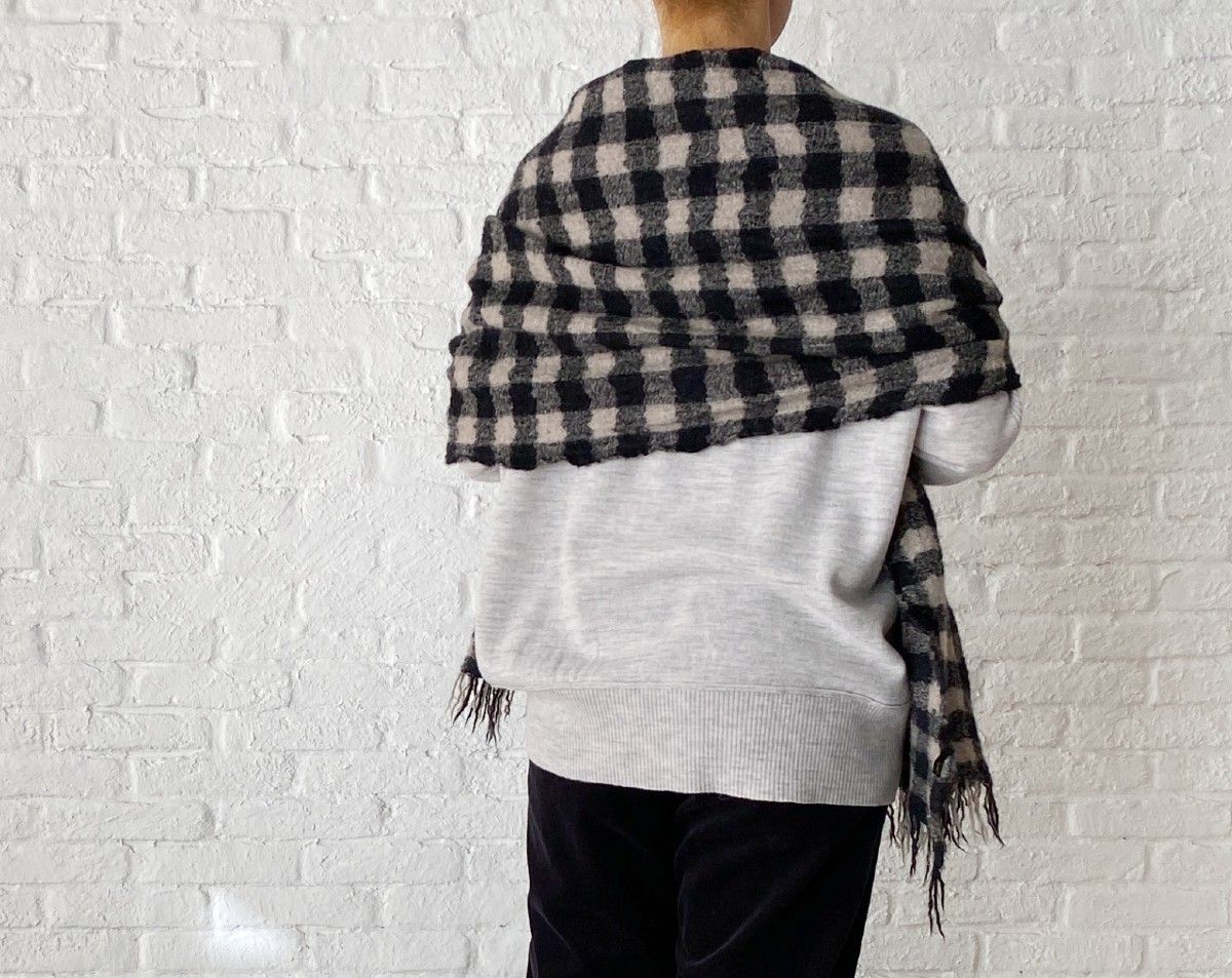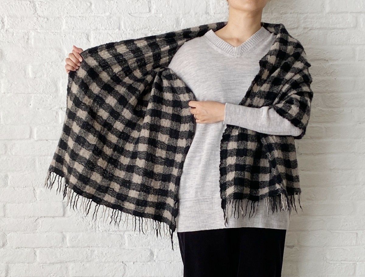 本日 再入荷 の ギンガムストール も絡めて、Gray ~ Black の同系色コーディネートのご紹介です。
