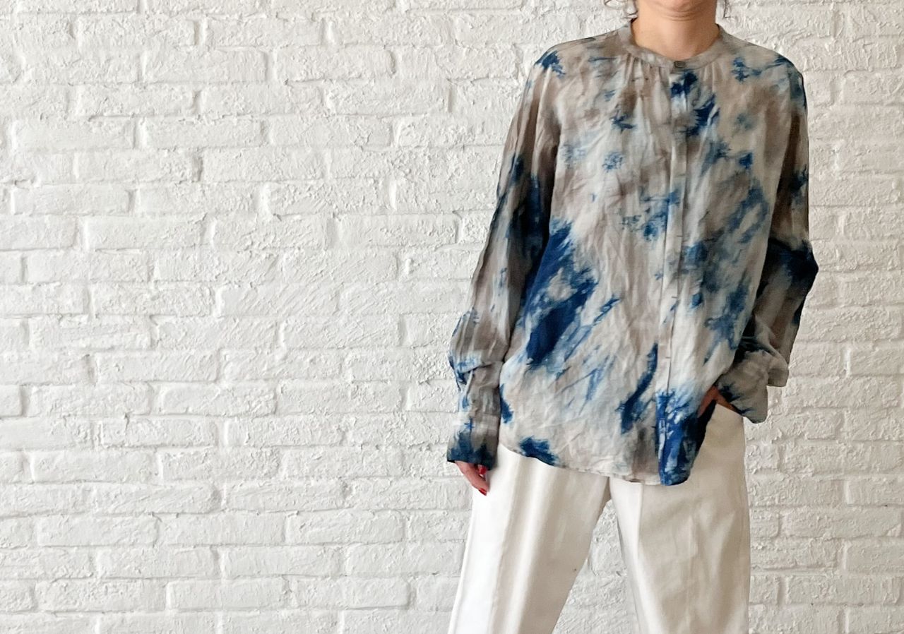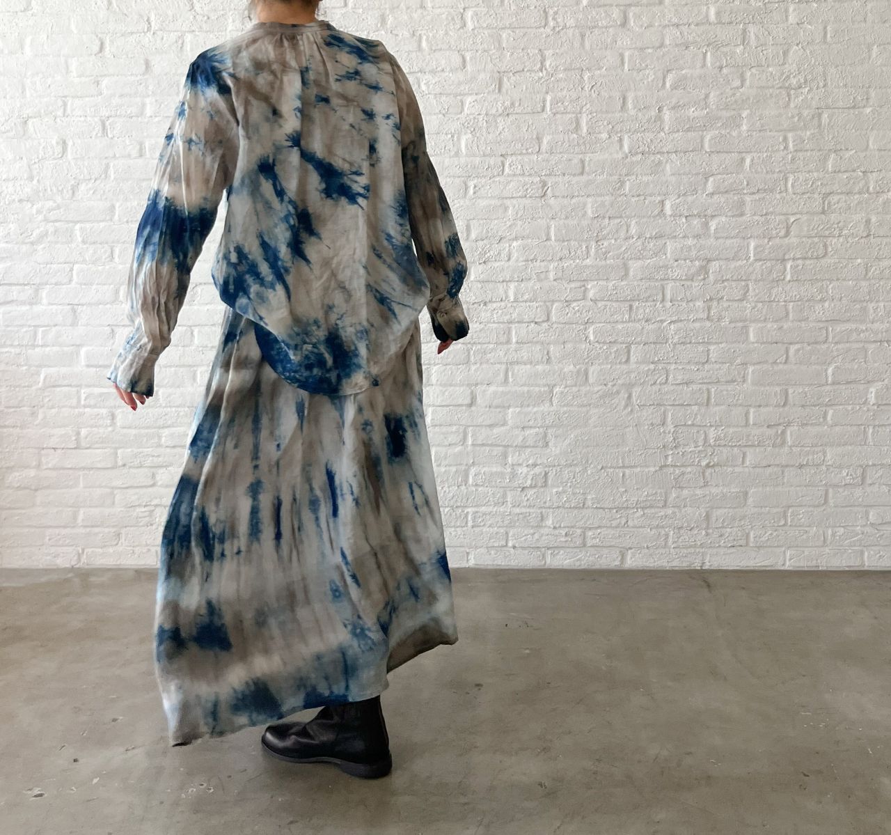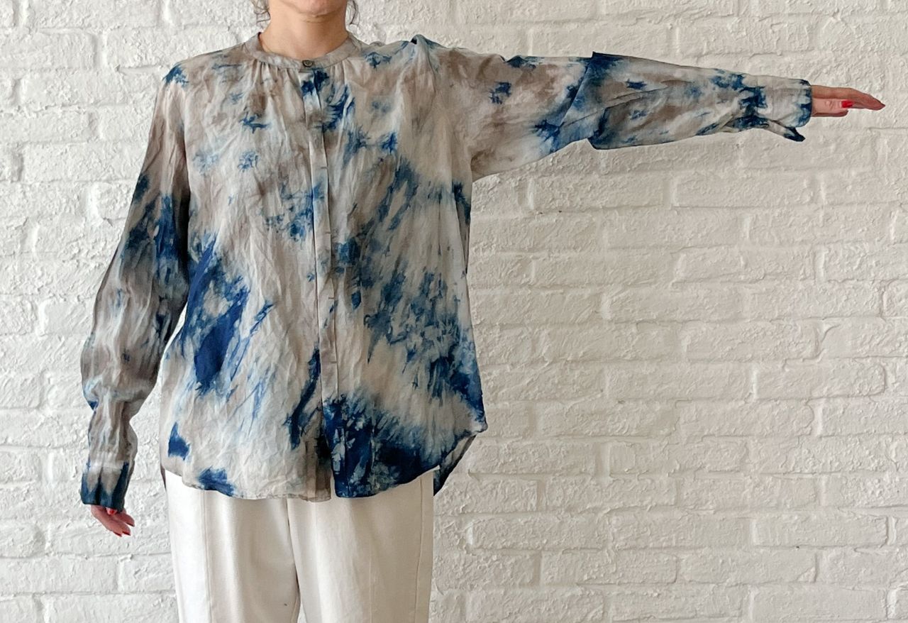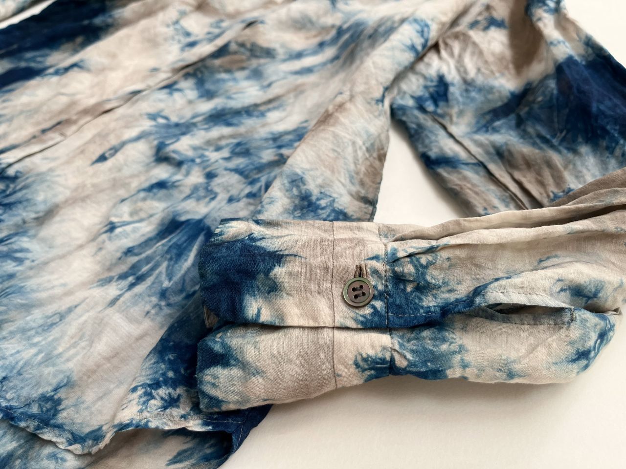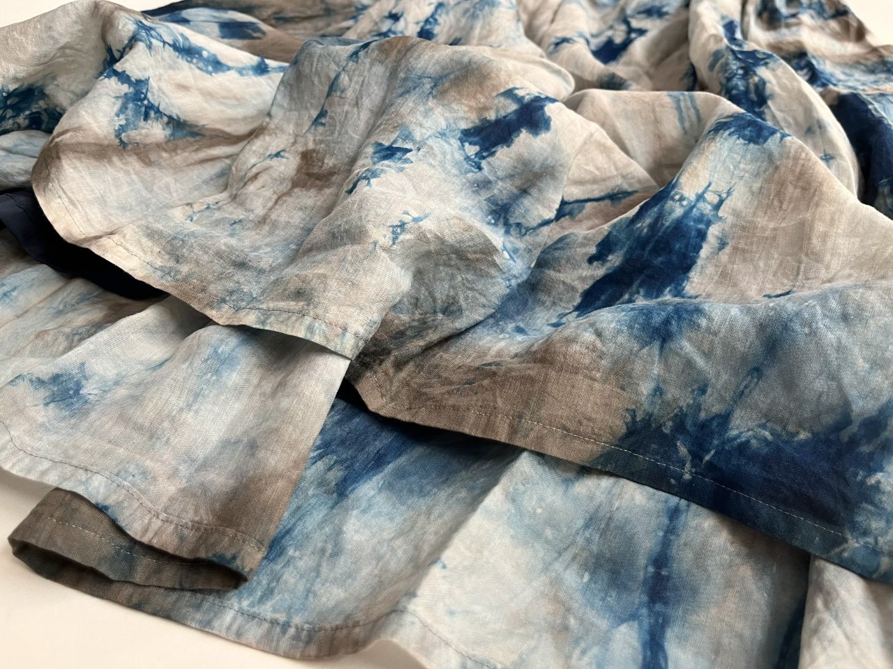 草木と藍を染める際に絞りの柄を少しづつずらすことで、2種類の染料が重なり印象的な柄に仕上がりました。