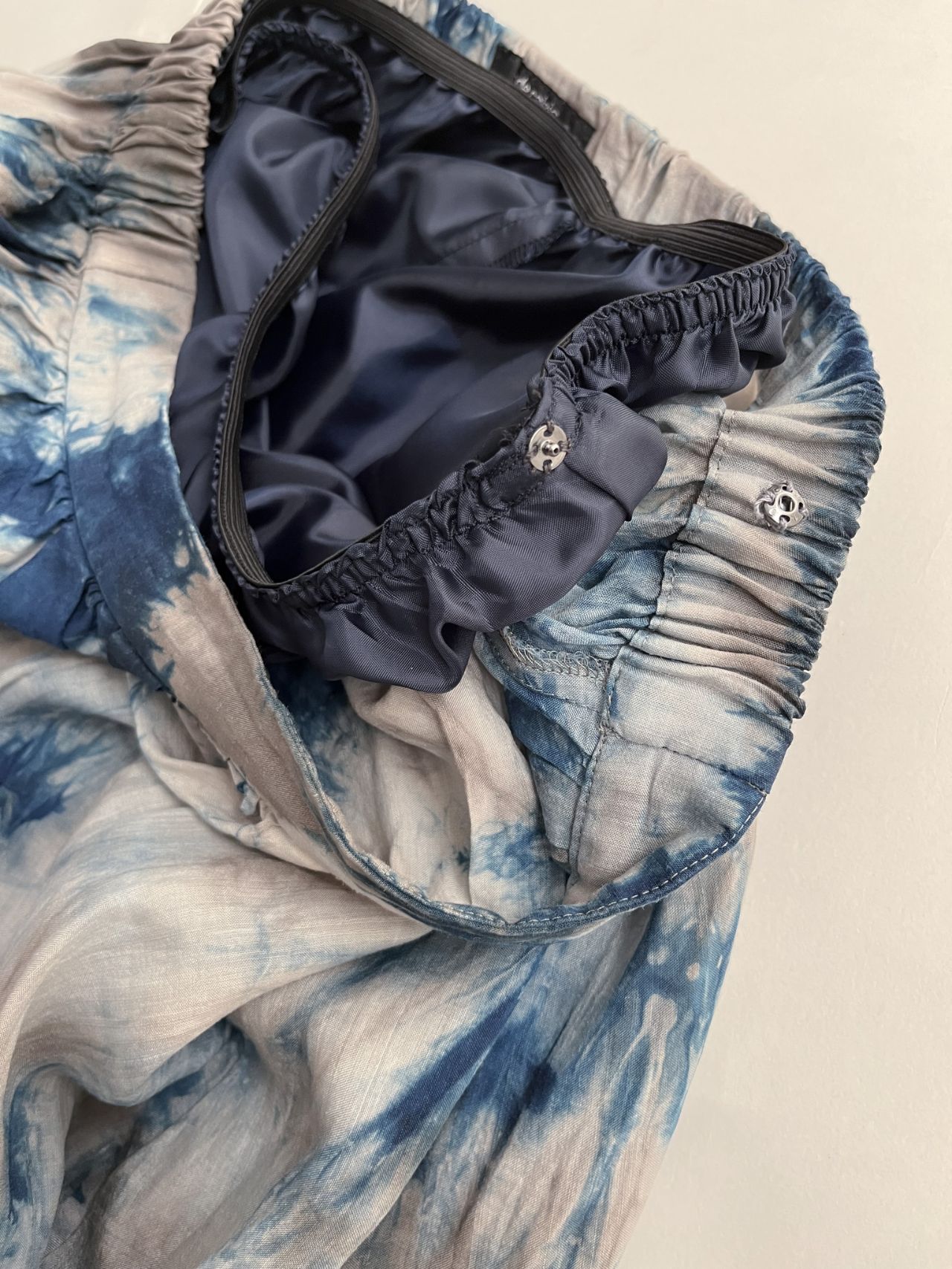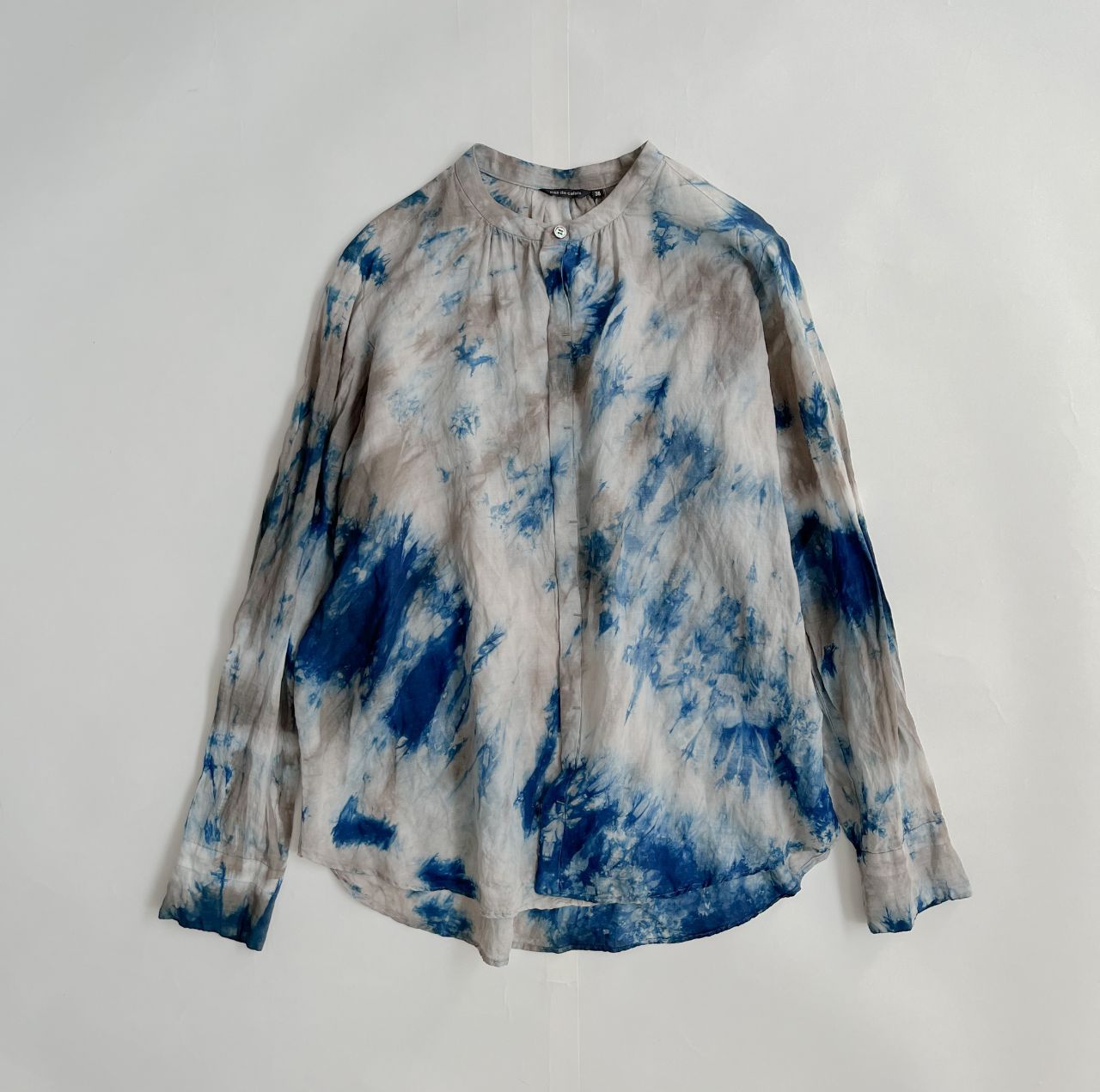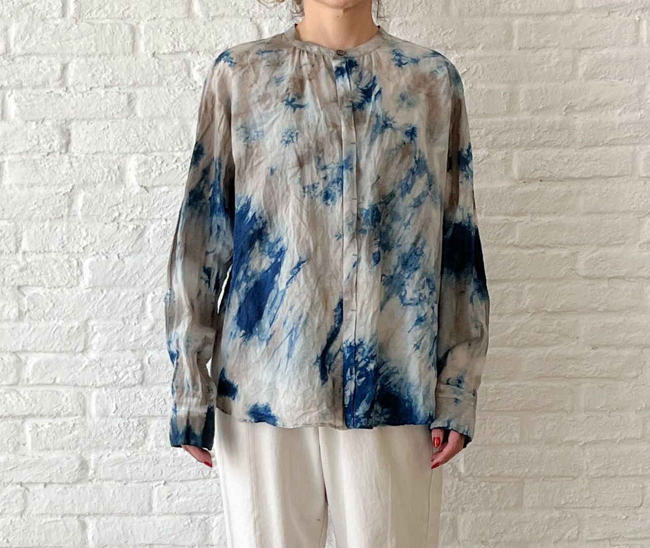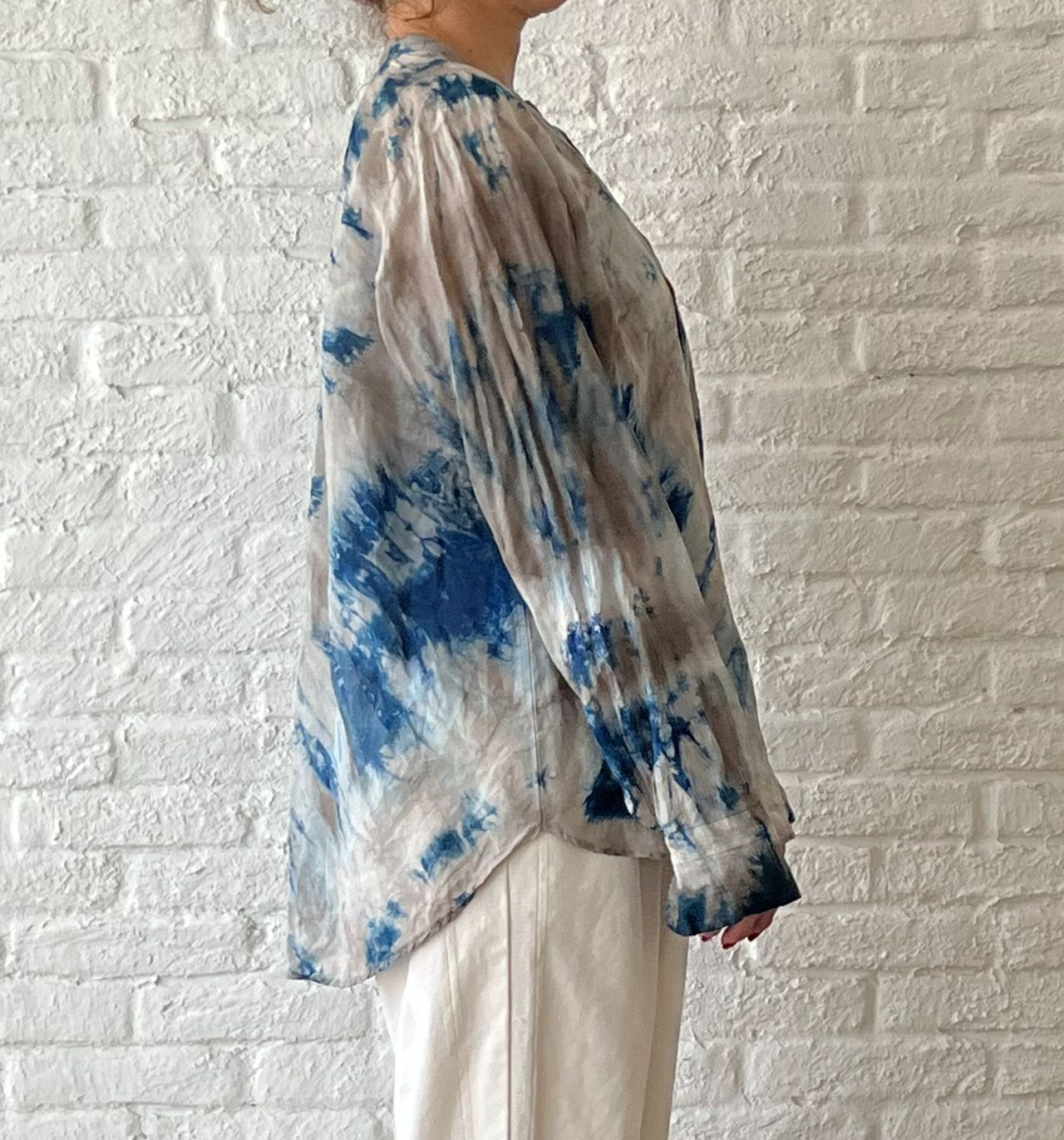 草木と藍を染める際に絞りの柄を少しづつずらすことで、2種類の染料が重なり印象的な柄に仕上がりました。